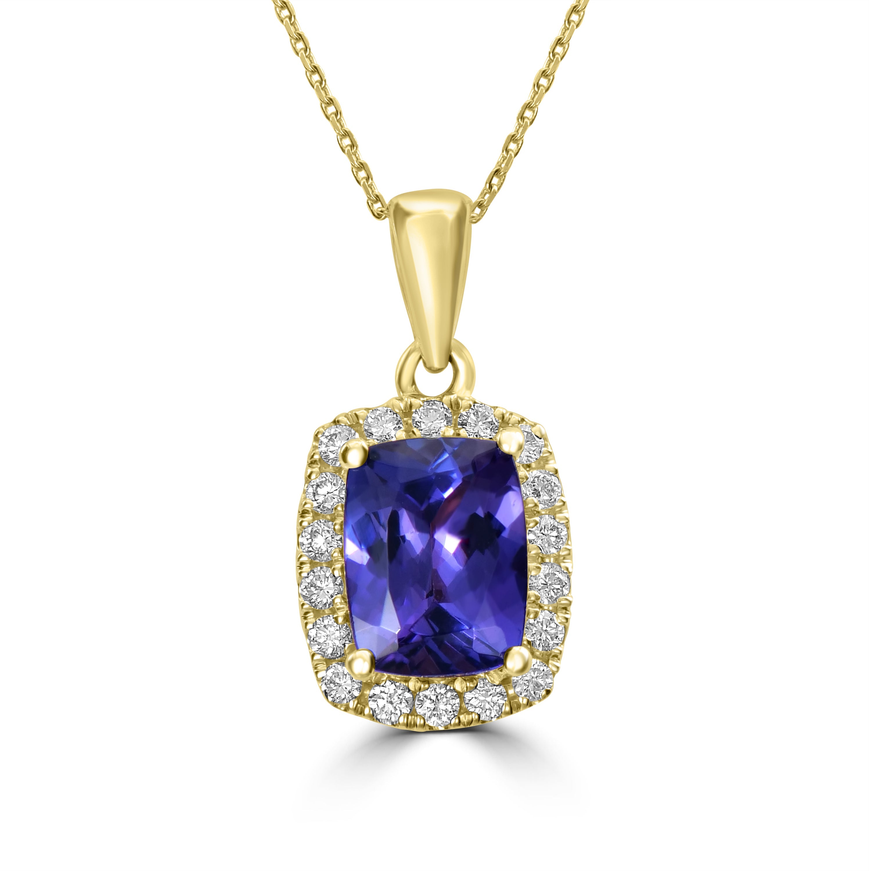 Crafted of 14k yellow gold for a refined finish, this trendy pendant gives a captivating look. This dazzling pendant flaunts cushion-cut Tanzanite and round Diamonds that lend sparkle to the design while offering you an effortlessly trendy look.