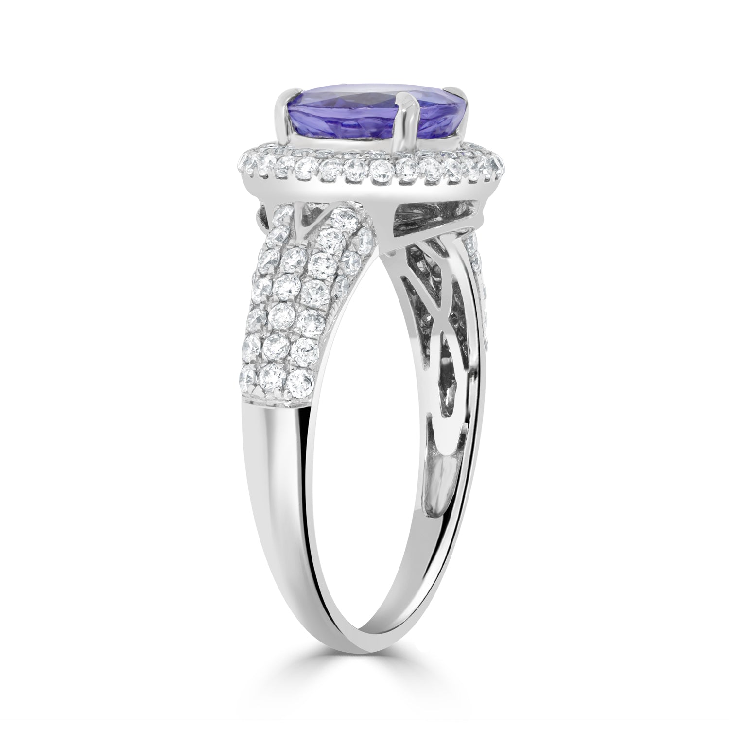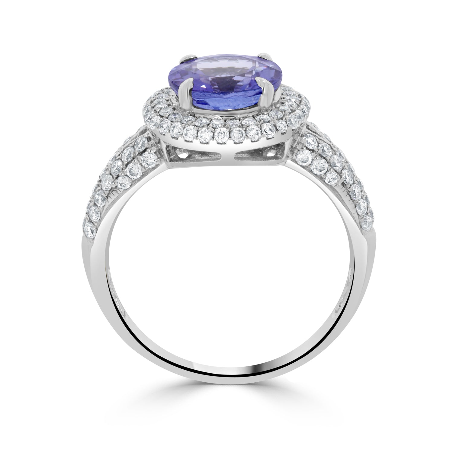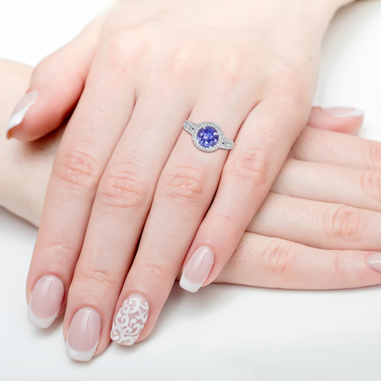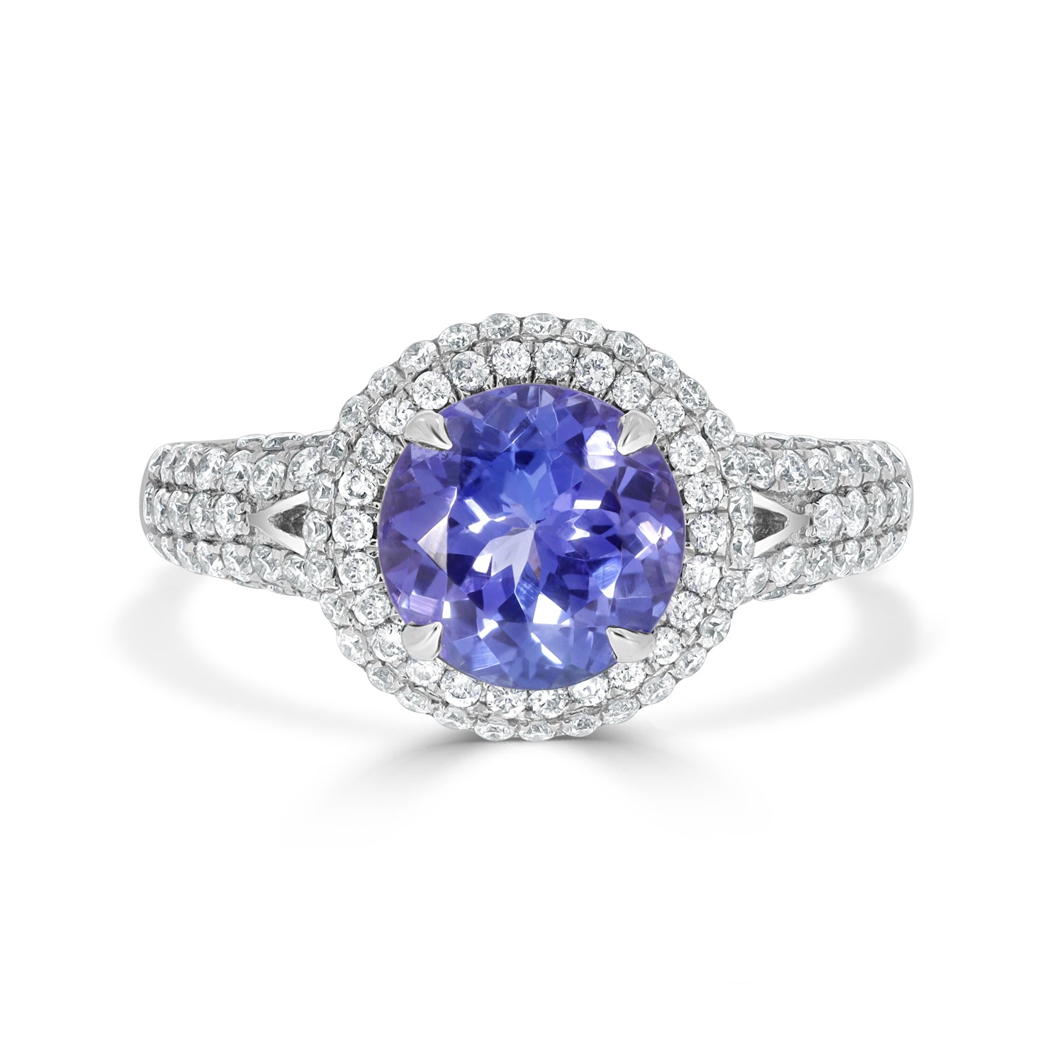 Crafted Of 14K White Gold, This Marvelous Ring Is Set With A Glorious Round Cut Tanzanite At The Center. Adding To Its Brilliance Are The Glittering Round Cut Diamonds Which Spread An Endless Glow Everywhere You Go.