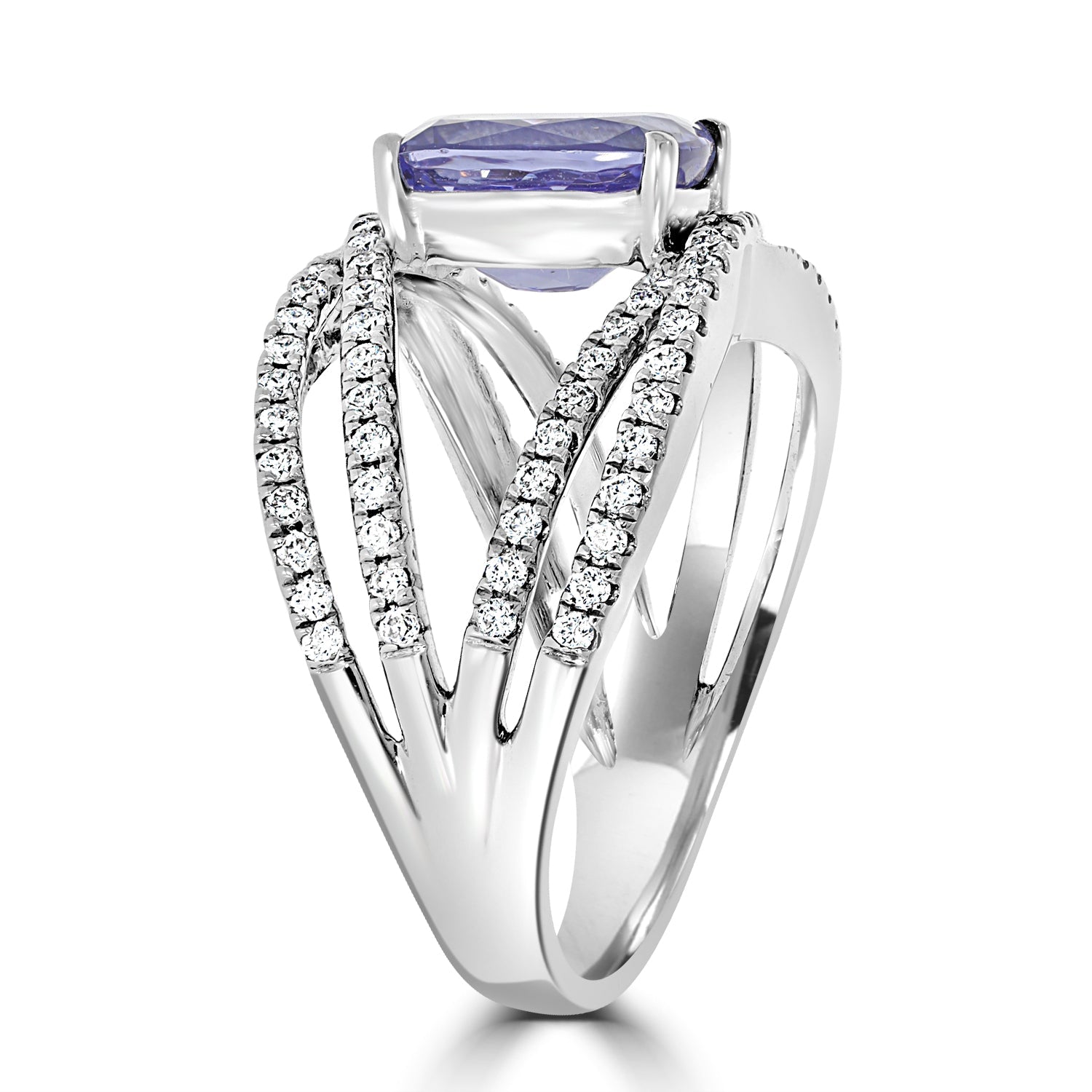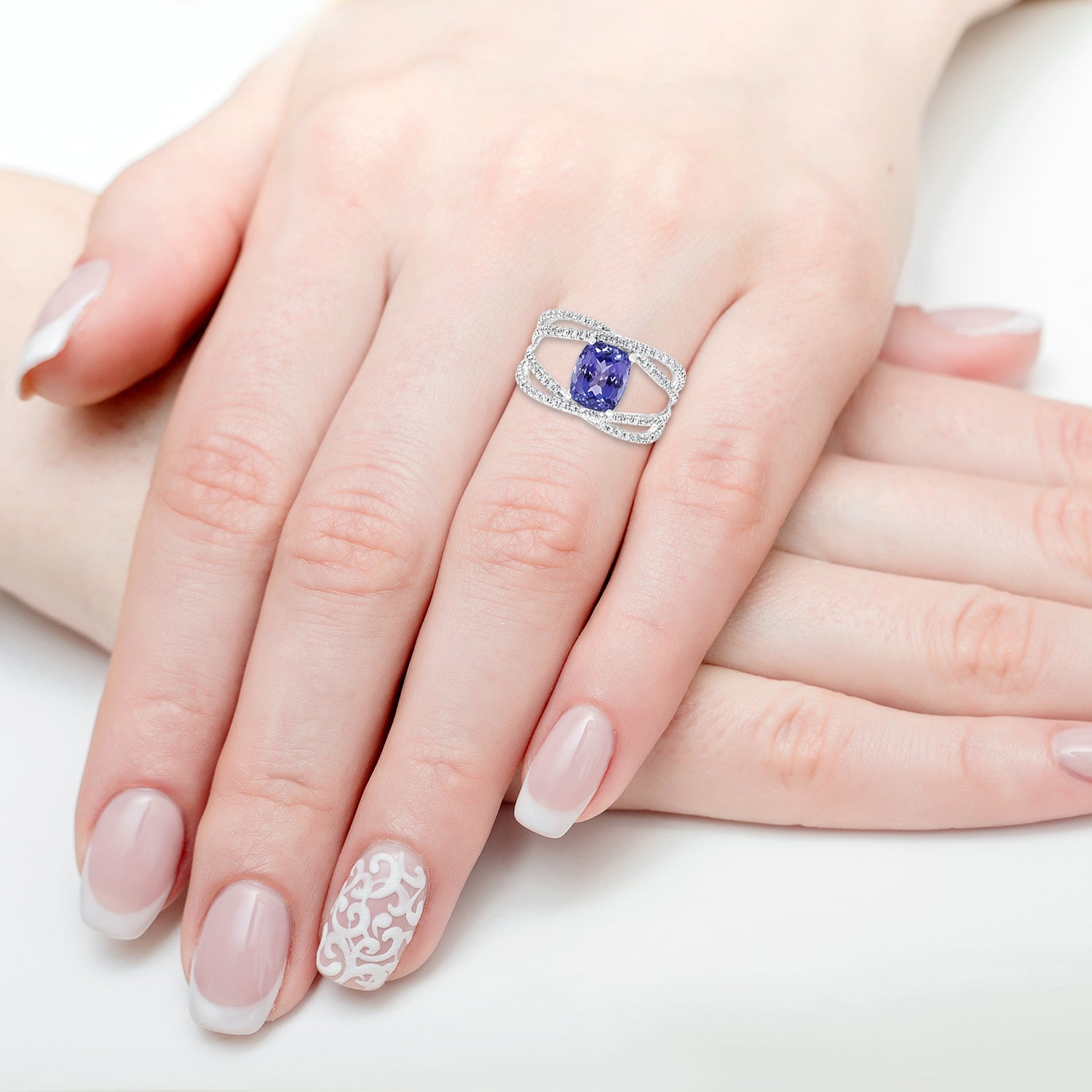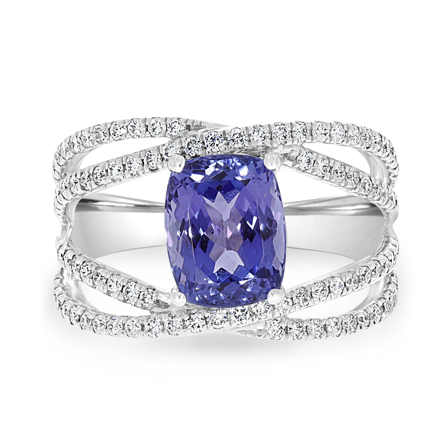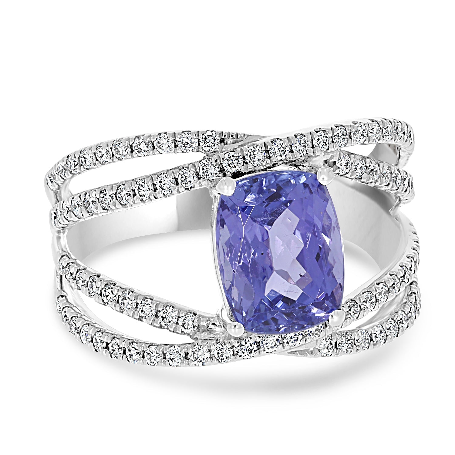 Crafted from 14K white gold, this luxurious ring is set with an eye-catching Cushion cut Tanzanite and beautiful round cut Diamonds.