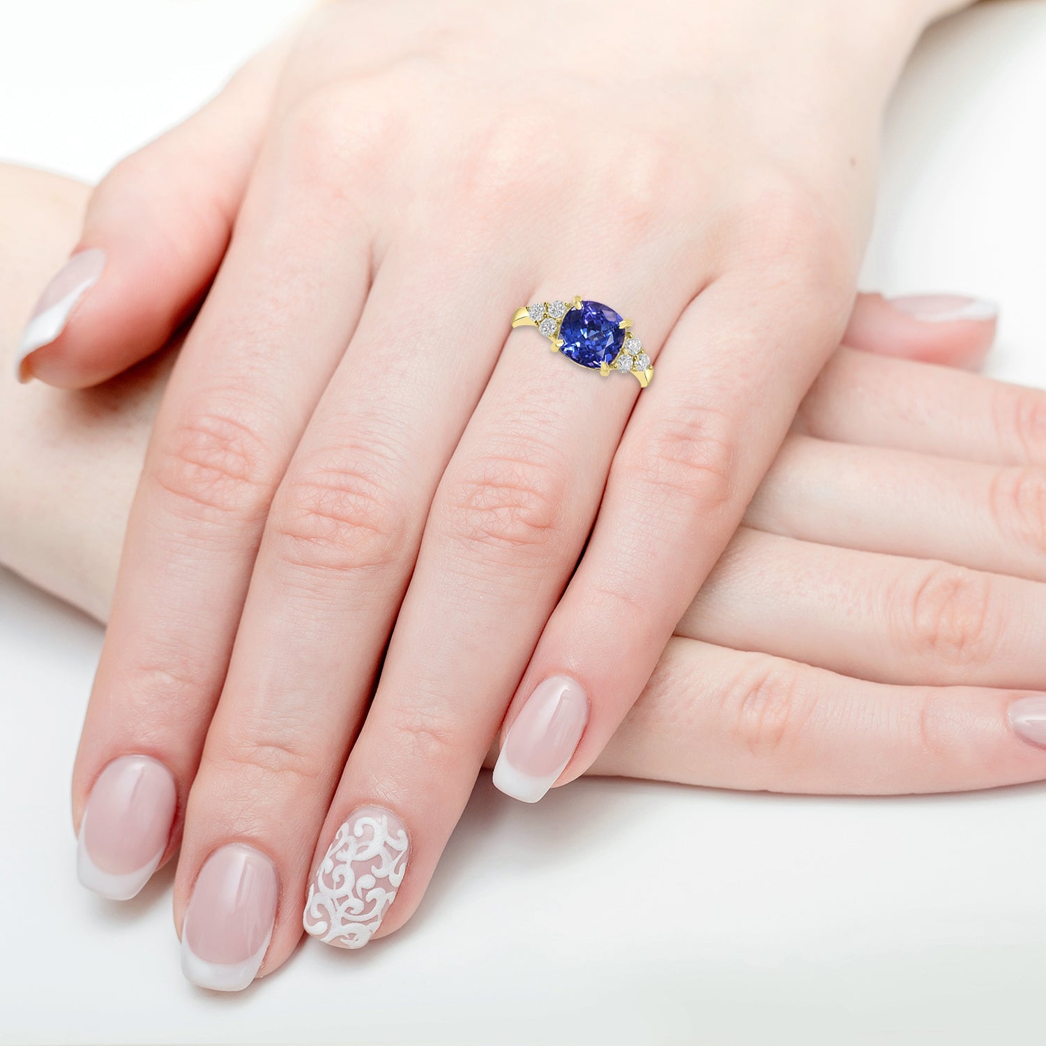 This luxury style ring that is fashioned of 14k white gold will add an ethereal aura to your look. The cushion-cut Tanzanite and round Diamonds lend a mesmerizing brilliance to this ring. Add your own unique magic to your outlook with this luxurious ring!