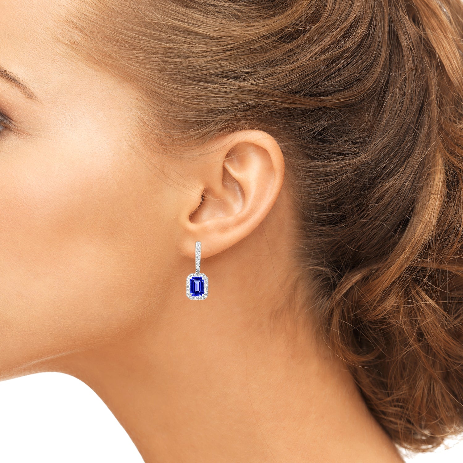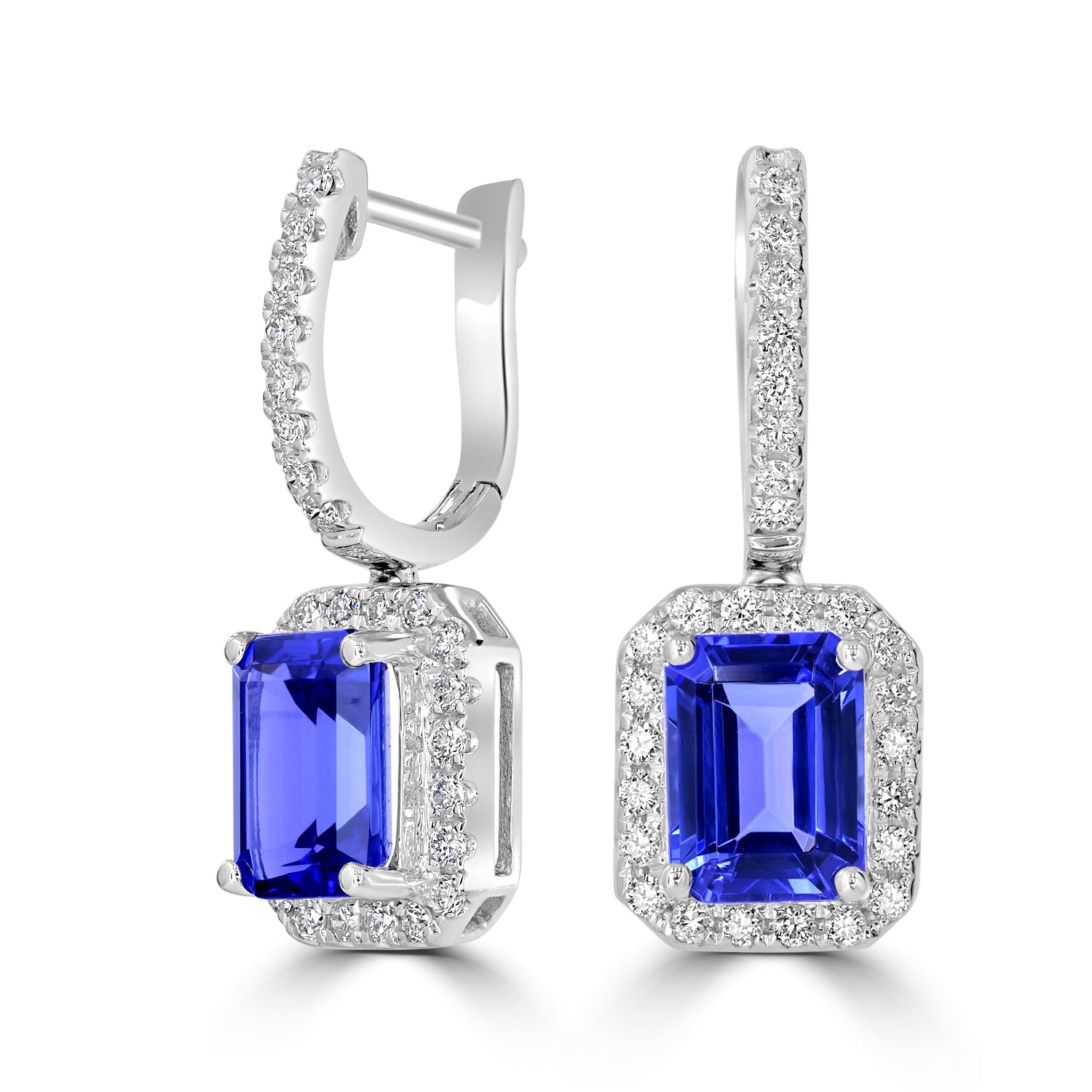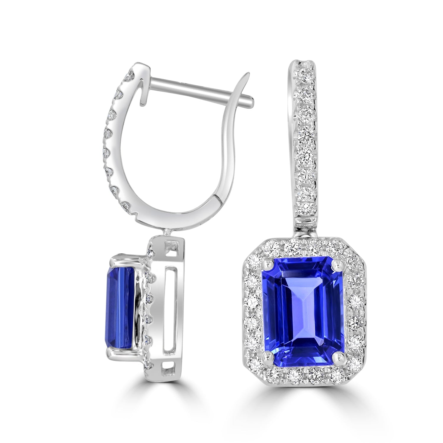These 14K white gold earrings studded with Emerald cut Tanzanite and round cut Diamonds showcase a flattering design. Great product for your collection for endless fantasy and comfort. Painstakingly designed to ensure an incredible finish, they are enough to give a stylish twist to your personality and knockout envious fashionistas from your way.
