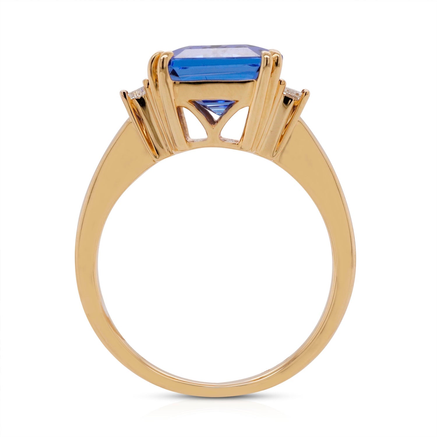 The baguette diamonds that border this stunning Tanzanite, enhance its cushion cut giving emphasis on its rich blue-violet color. A stroke of genius that fuses contrasting shades to create a symbol of elegance, this radiant piece of jewelry is a true treasure. Set in 18K yellow gold, its luster will stand the test of time, adding sparkle to your life with each passing year!