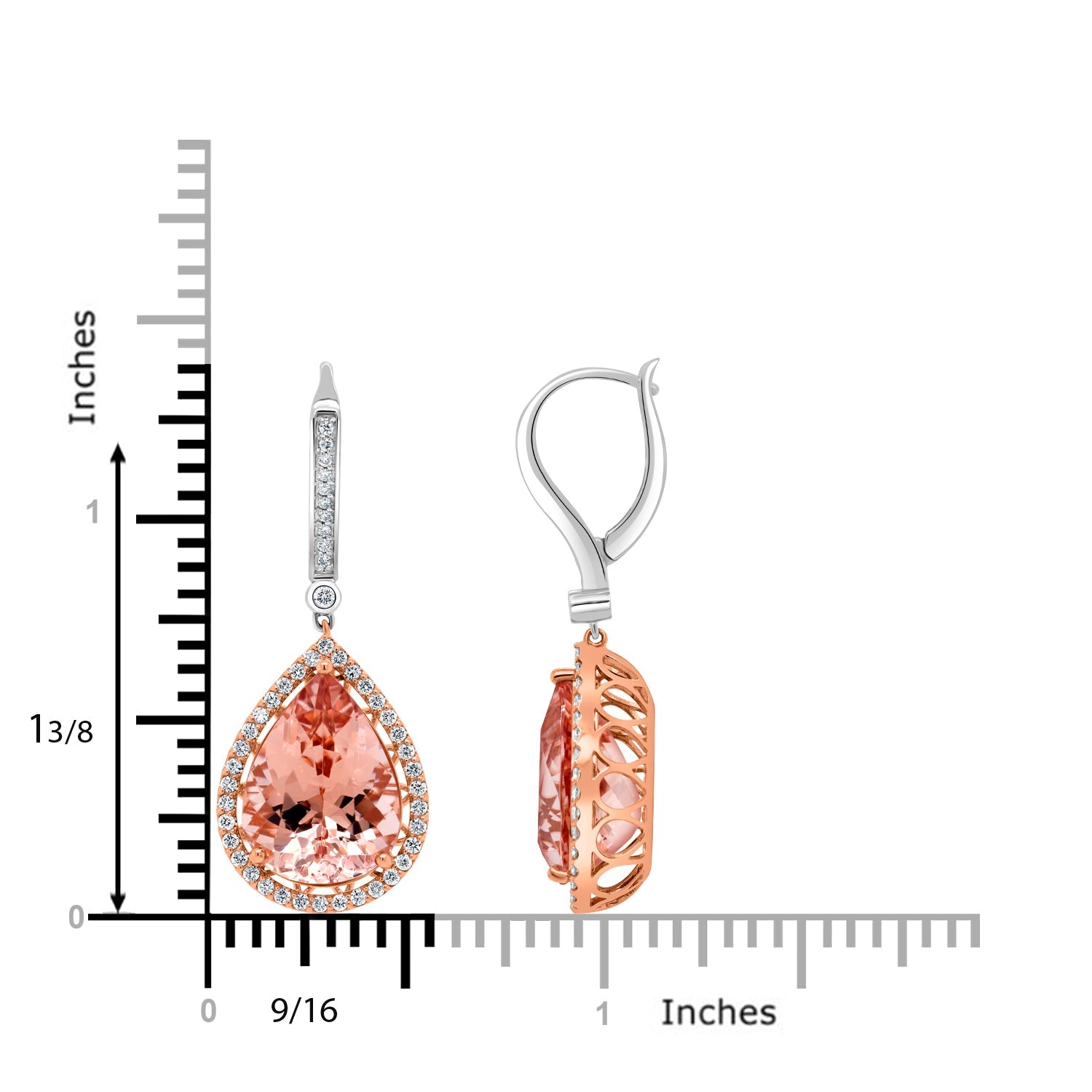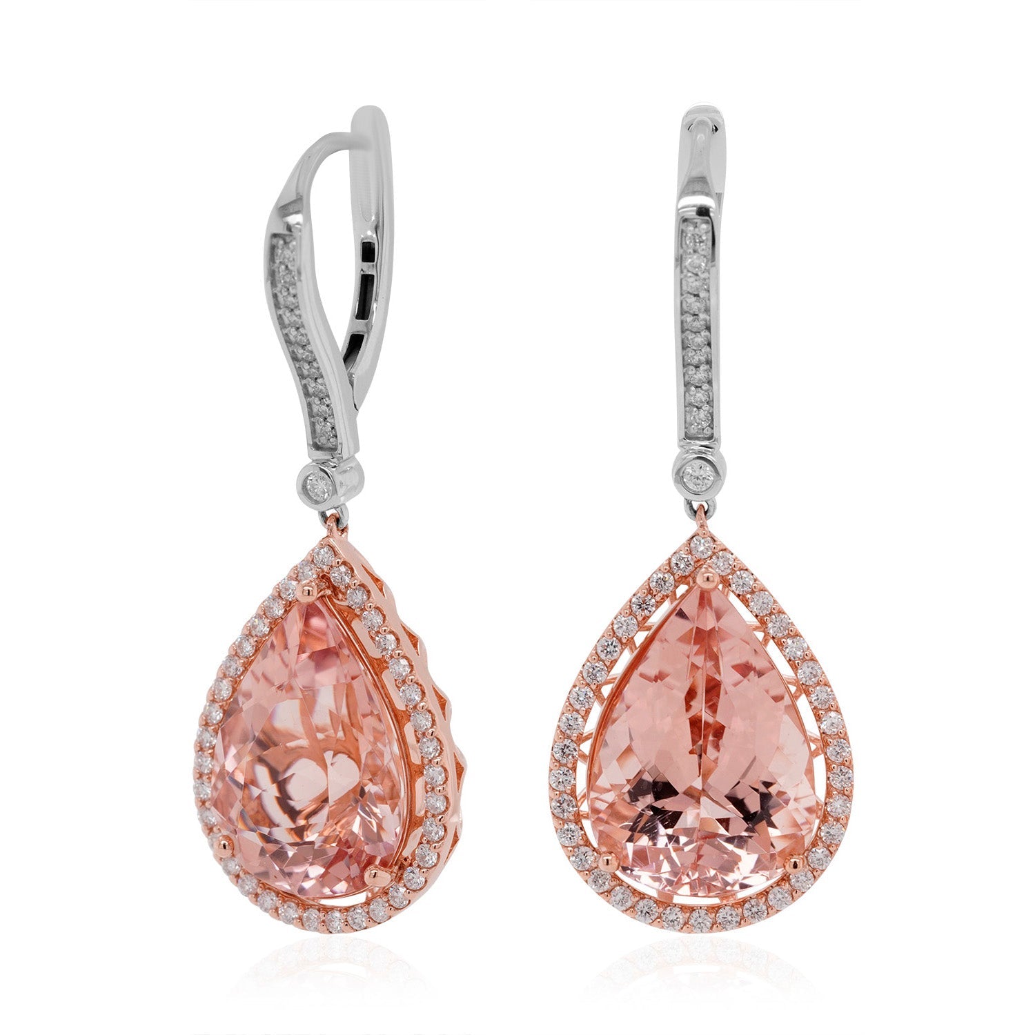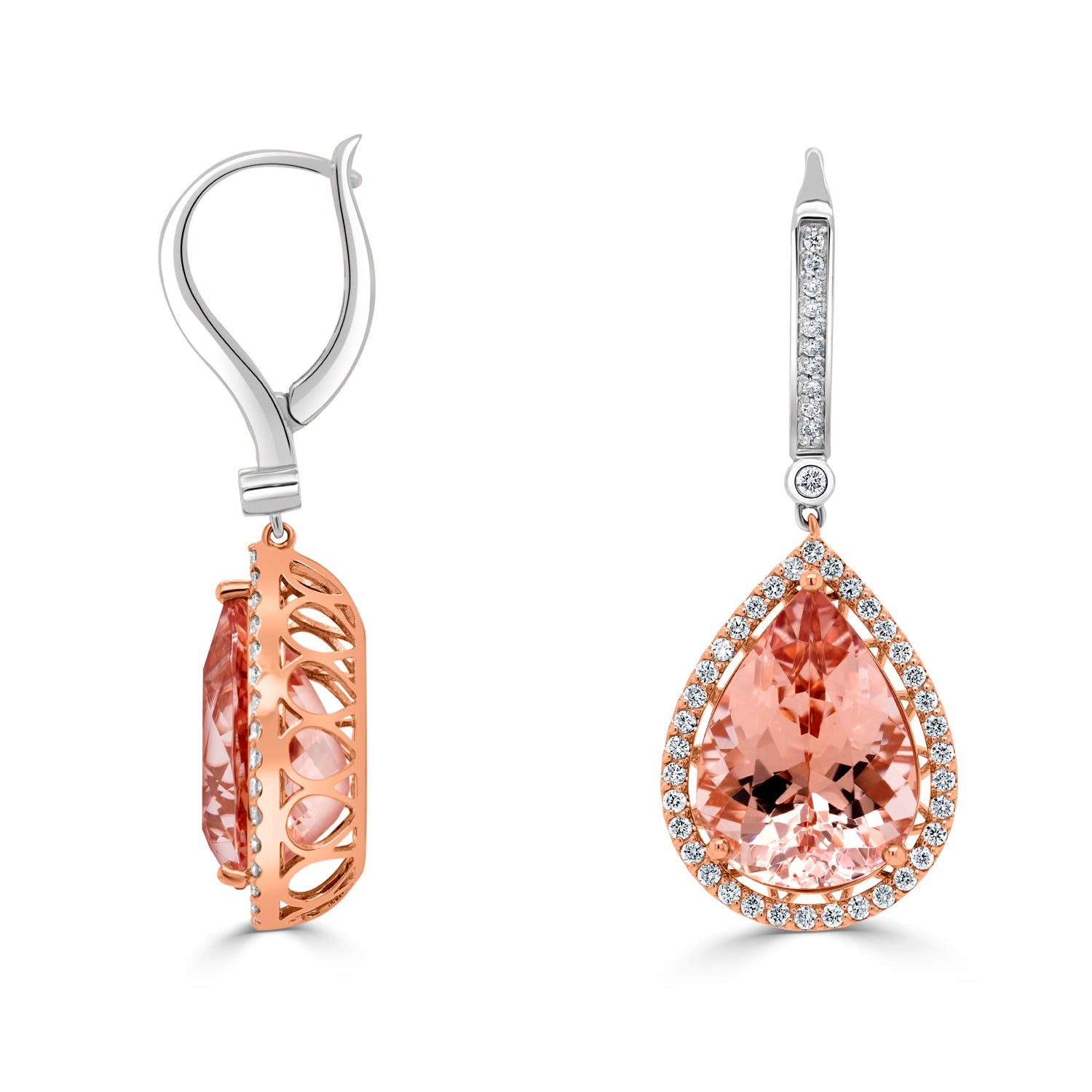 These attractive 14K two-tone earrings, decorated with eye-catching pear cut Morganite and round cut Diamonds, add an exquisite elegance to your everyday ensemble. Their smooth finish delivers a magnetizing look effortlessly. Right now, the jewelry market is booming with the latest designs and these earrings are one of them.