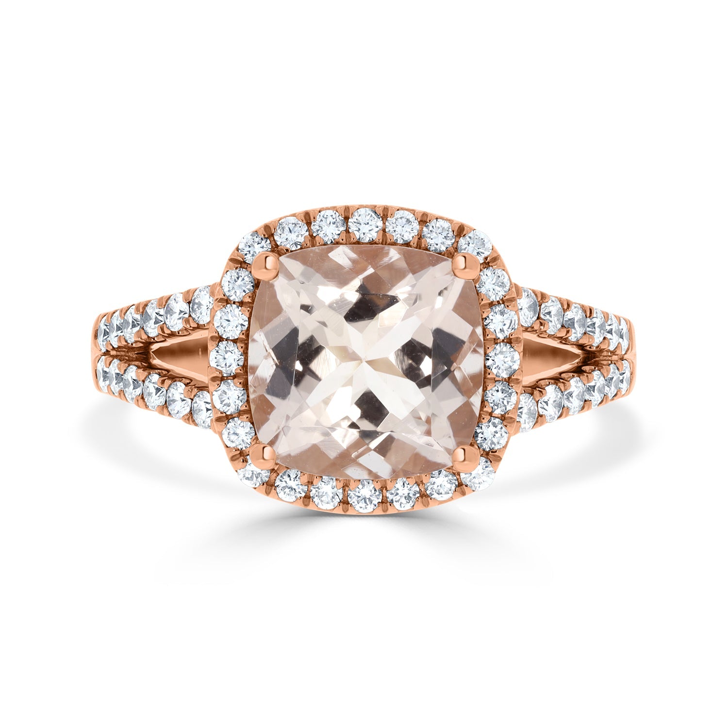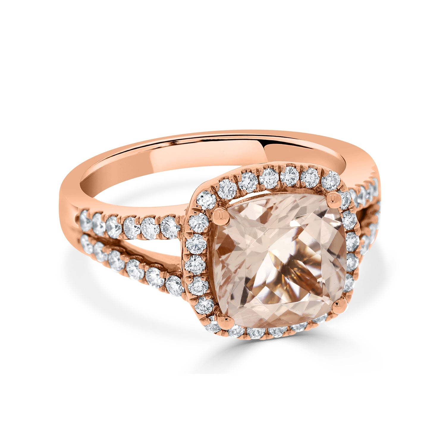 Crafted Of 14k Rose Gold, This Stunning Ring Is Set With A Splendid Cushion Cut Morganite At The Center And Surrounded By The Glitter Of Gorgeous Round Cut Diamonds. The Right Jewelry For Any Occasion, Wear It With Confidence To Give Your Ensemble A Glamorous Finish.