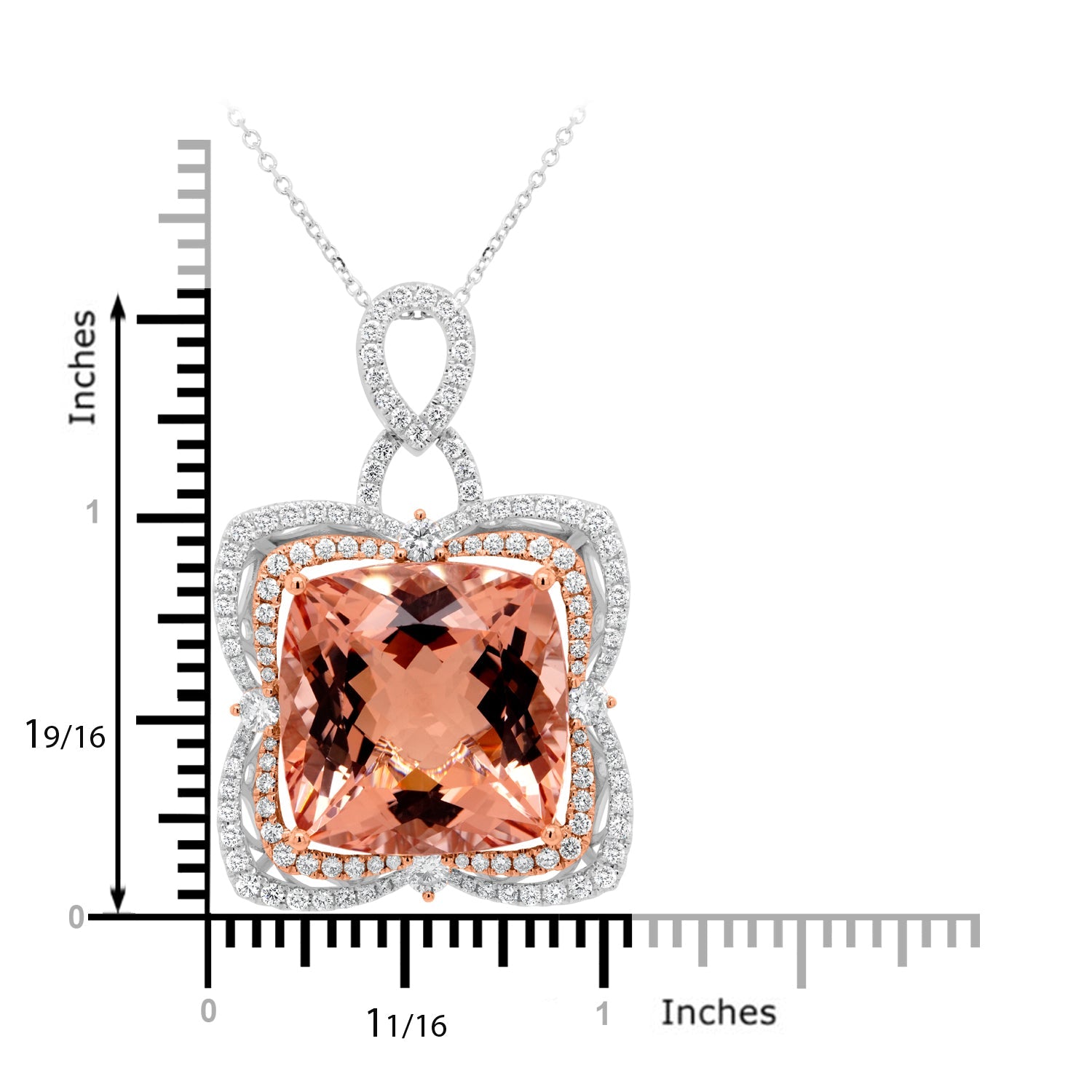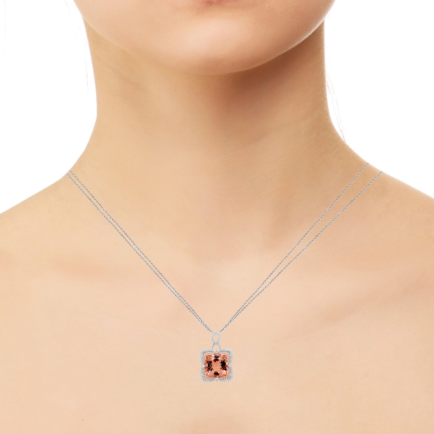 Set with a gorgeous cushion cut Morganite, this pendant is designed with 14K two tone gold for a refined finish. Adding to its are the beautiful round cut Diamonds that give this piece a sparkling finish.