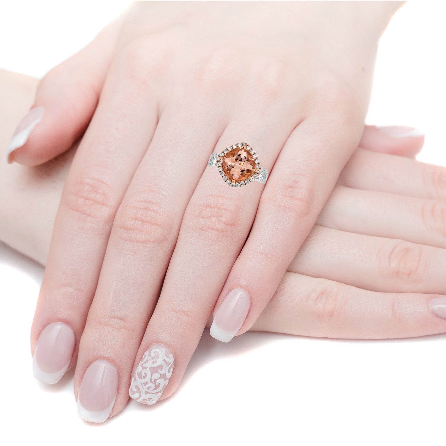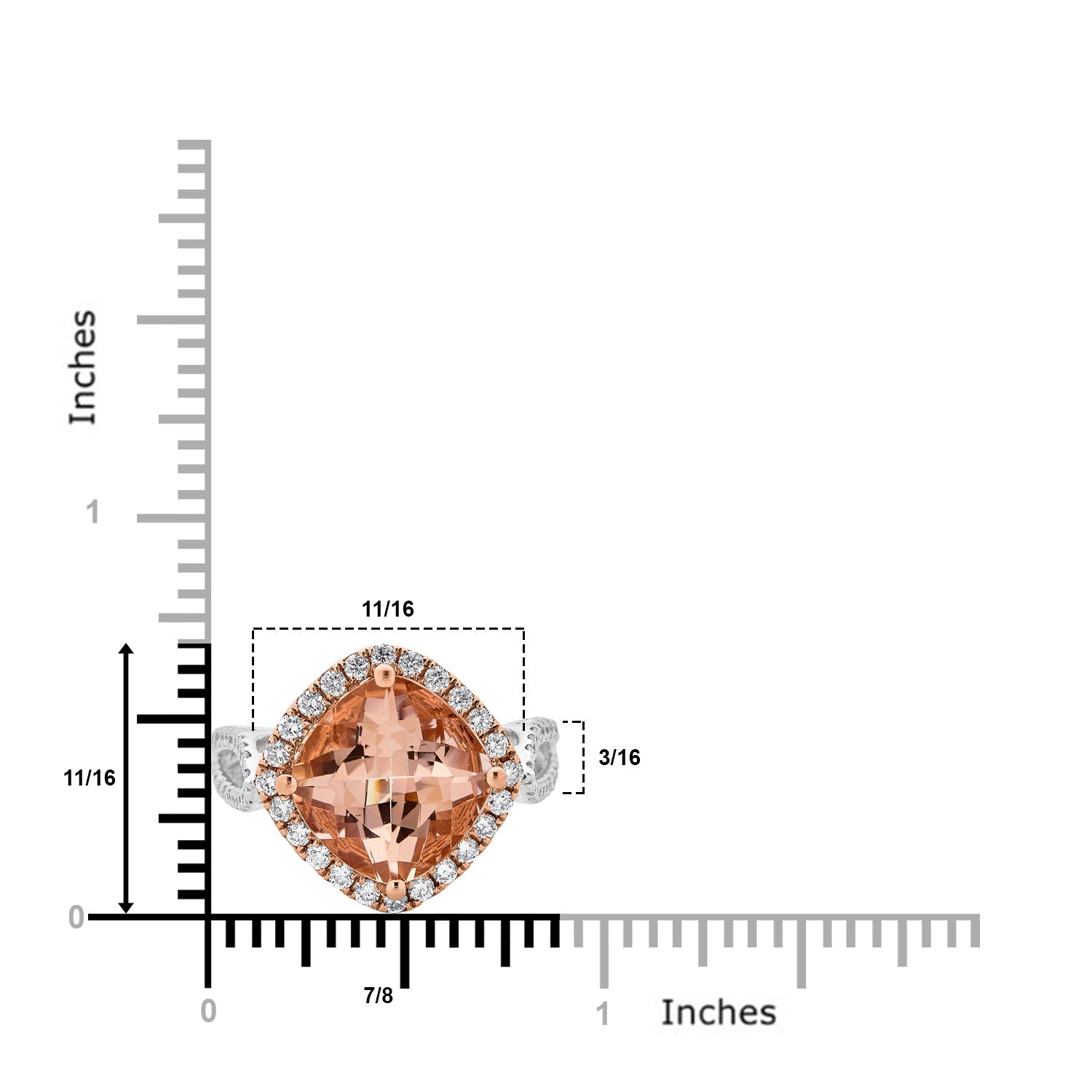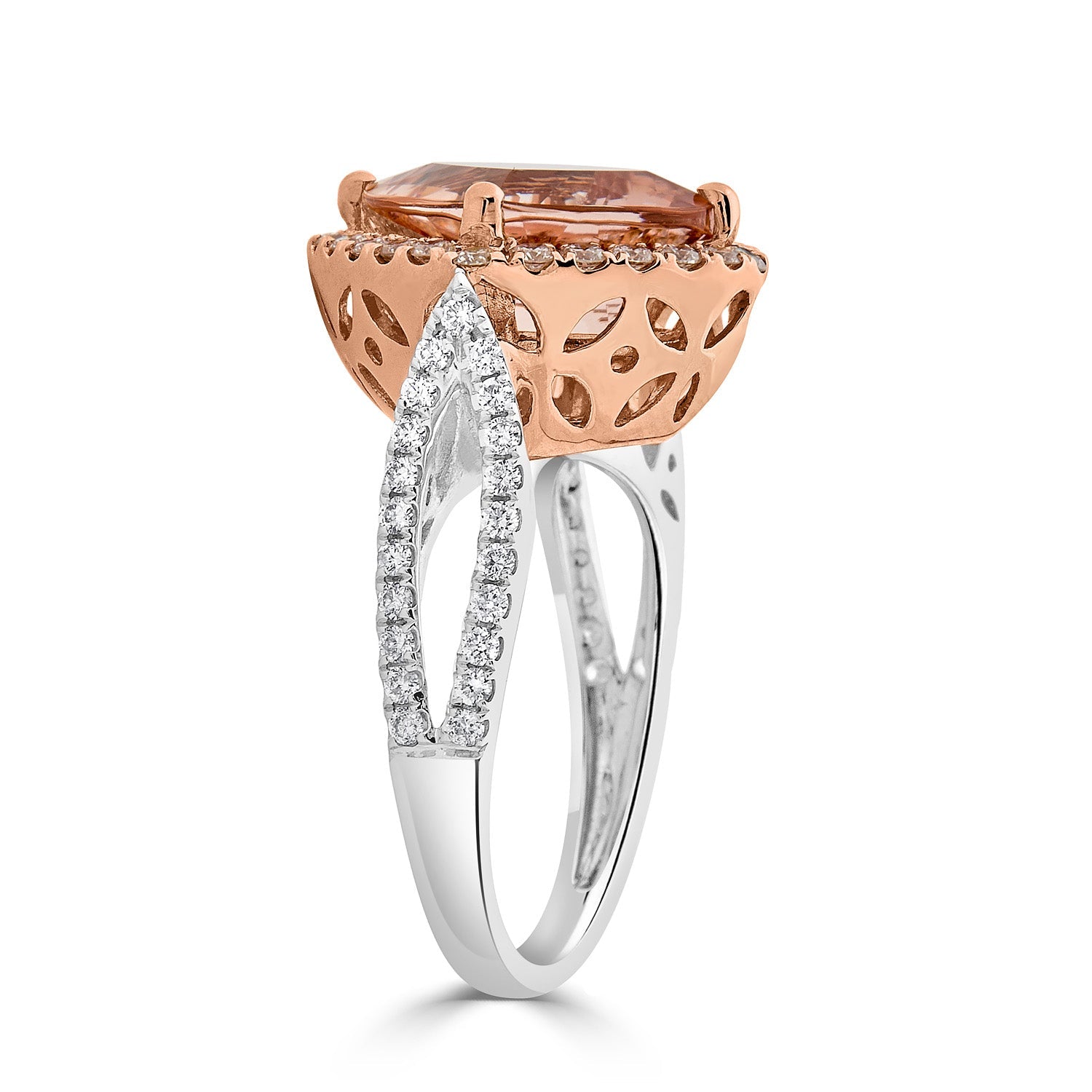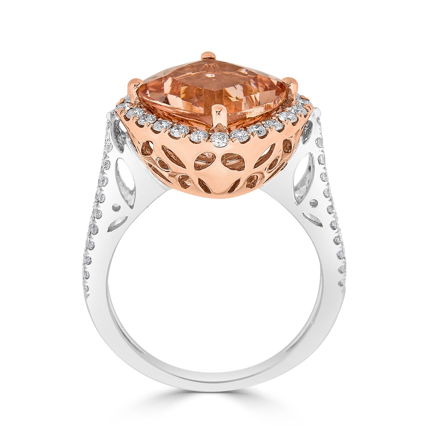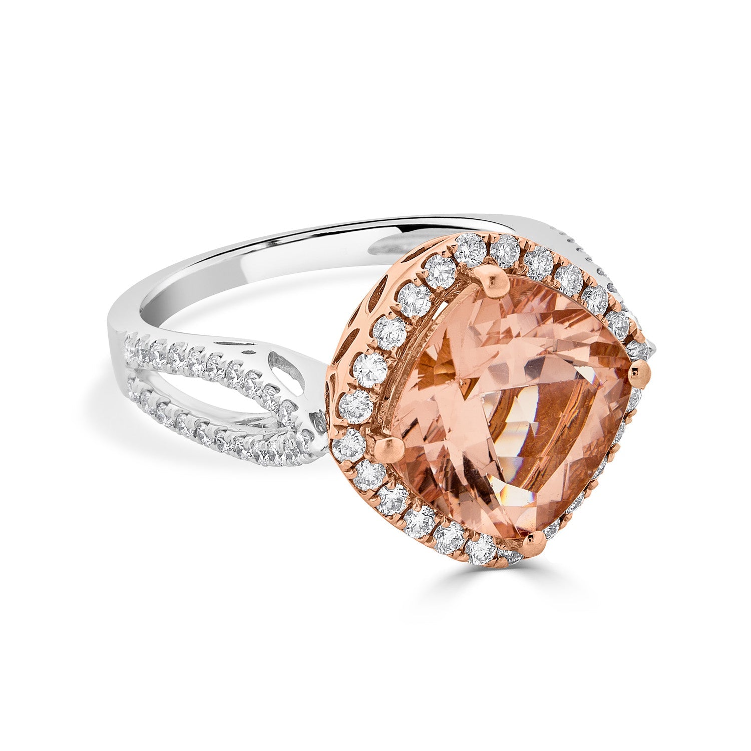 Developed from 14k gold in a two-tone finish, this fantastic women's ring offers superior comfort and will add a touch of shine to your look. The cushion cut morganite and round diamonds perfectly adorn the precious metal giving it a royal look and desired sparkle to complement any outfit.