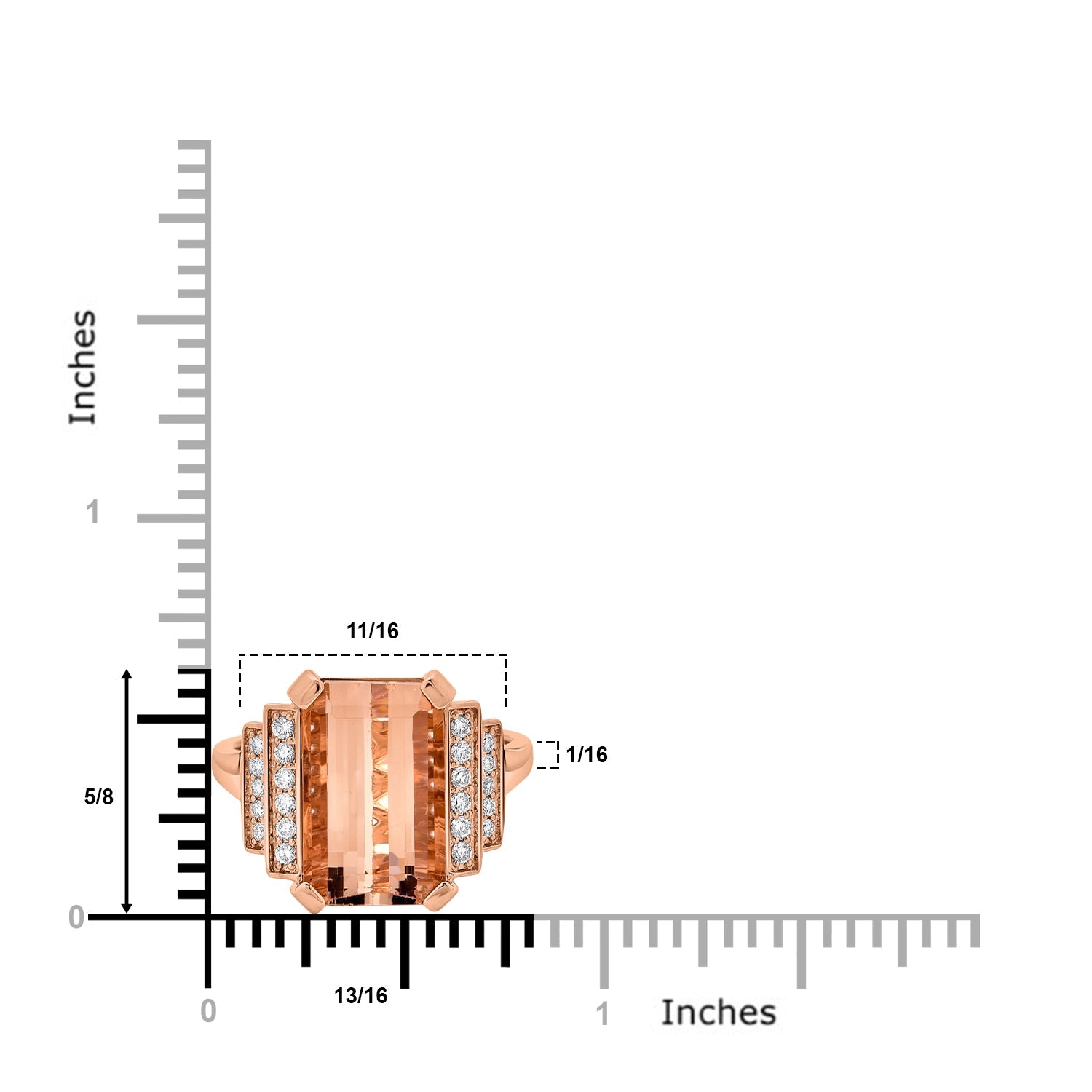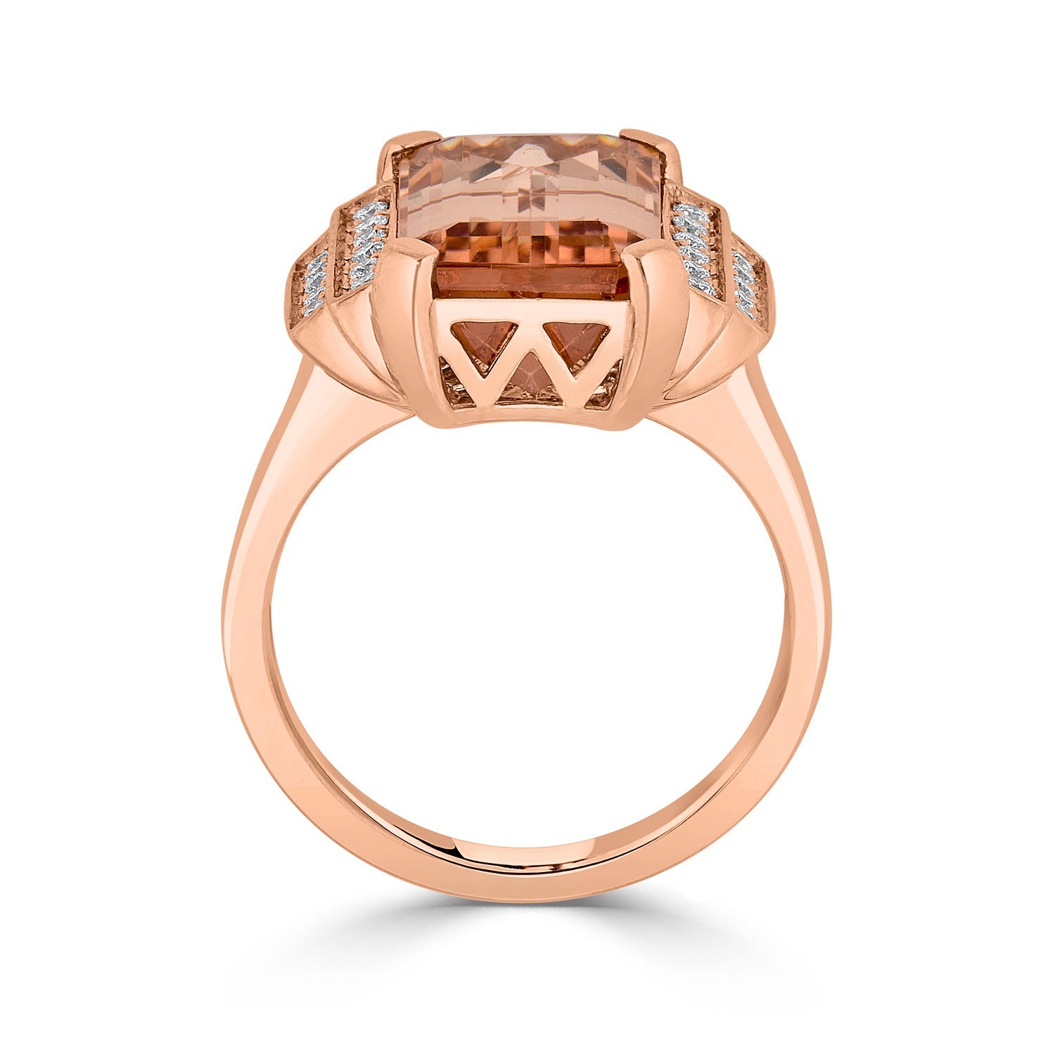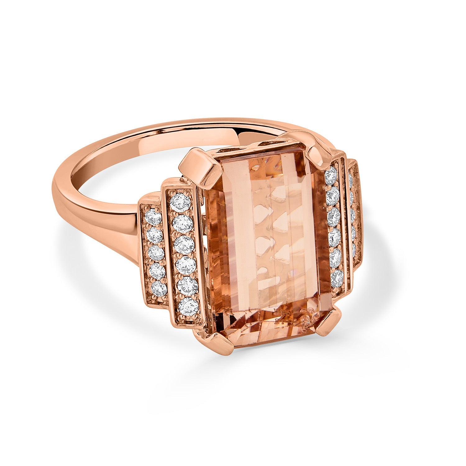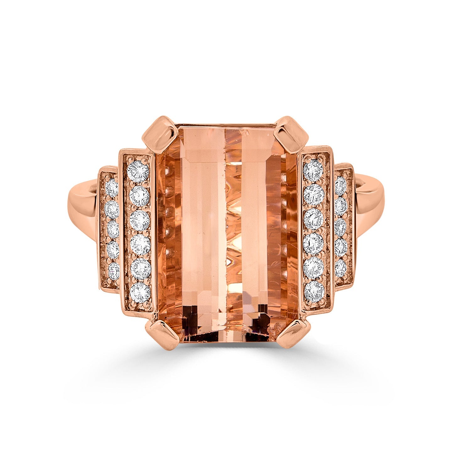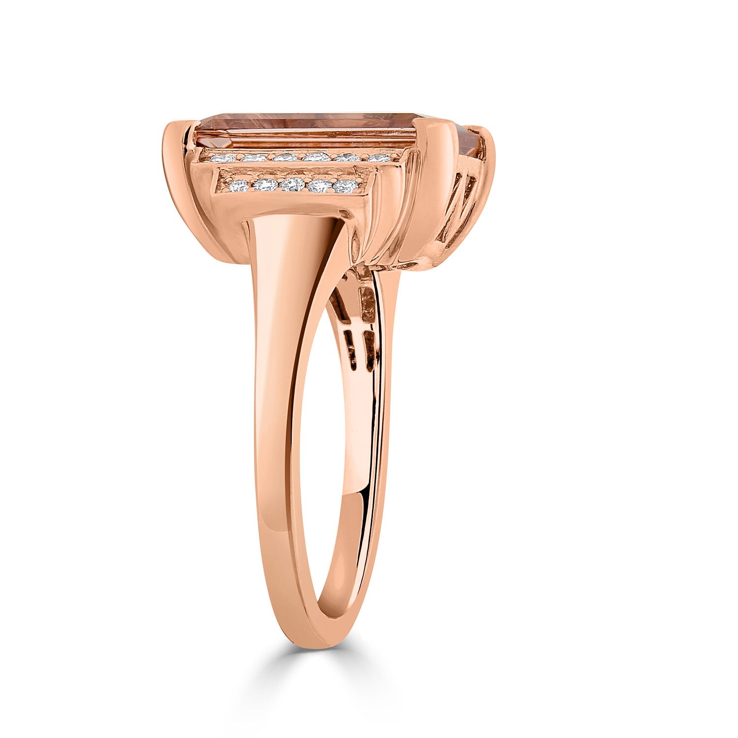 Designed of 14k rose gold, this ring is a perfect pick to enhance your beauty while heading for parties and special events. With an artfulness, this piece is expertly Designed with emerald cut Morganite and round Diamonds.