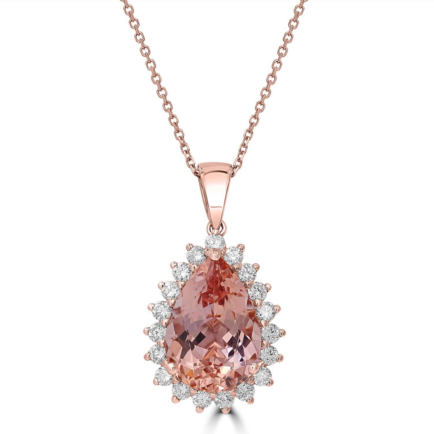 Easier to combine with clothing across any style, this stylish 14K rose gold pendant is the perfect piece of jewelry that adds luxury and uniqueness to your look. The pendant adorned with pear-cut Morganite and round Diamonds mesmerizes you with the colors they reflect.