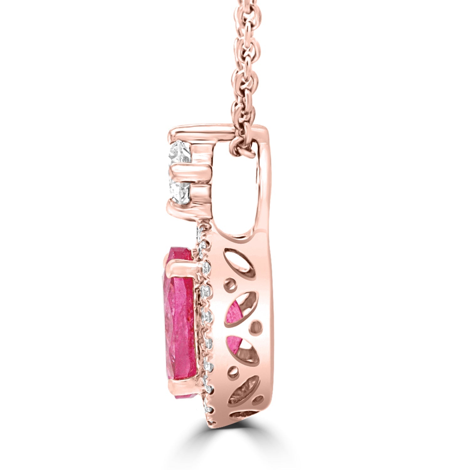 Crafted of 14k yellow gold, this necklace is sure to work a treat in your look. This necklace is adorned with shimmering oval cut Pink Spinel at the center, surrounded by round-cut Diamonds that add radiant beauty to your look.
