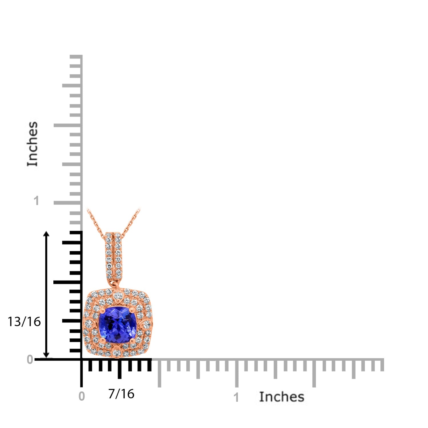 This pendant is set with a square cushion-cut Tanzanite and round Diamonds.