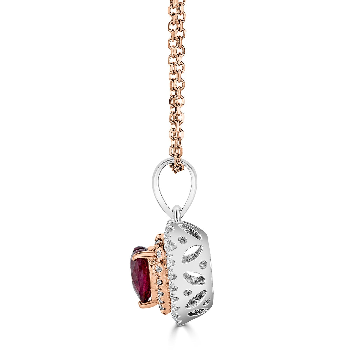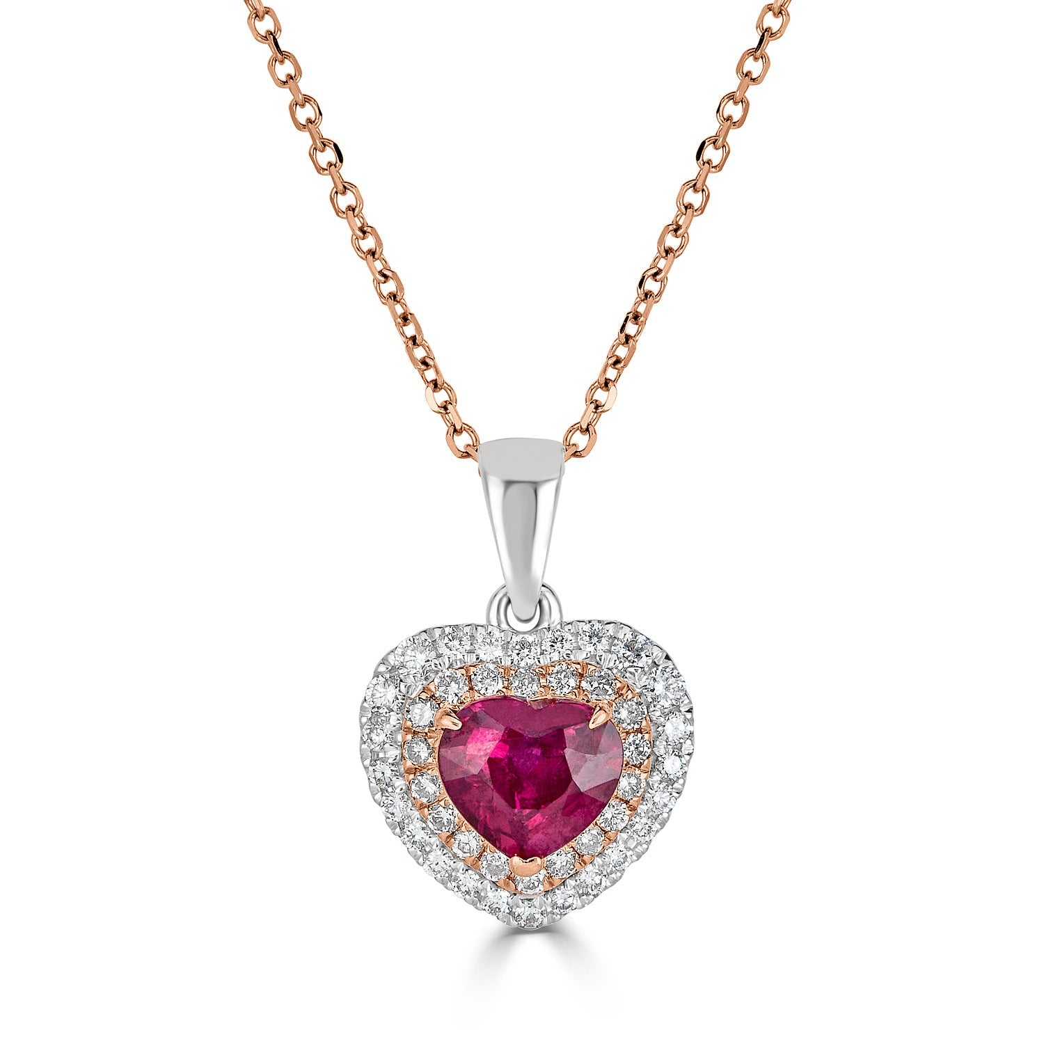 Crafted from 18k two-tone material, this luxurious pendant is a lovely addition to your favorite necklace to add to your style statement. The heart cut Ruby comes together in perfect unison with round Diamonds to form this pendant.