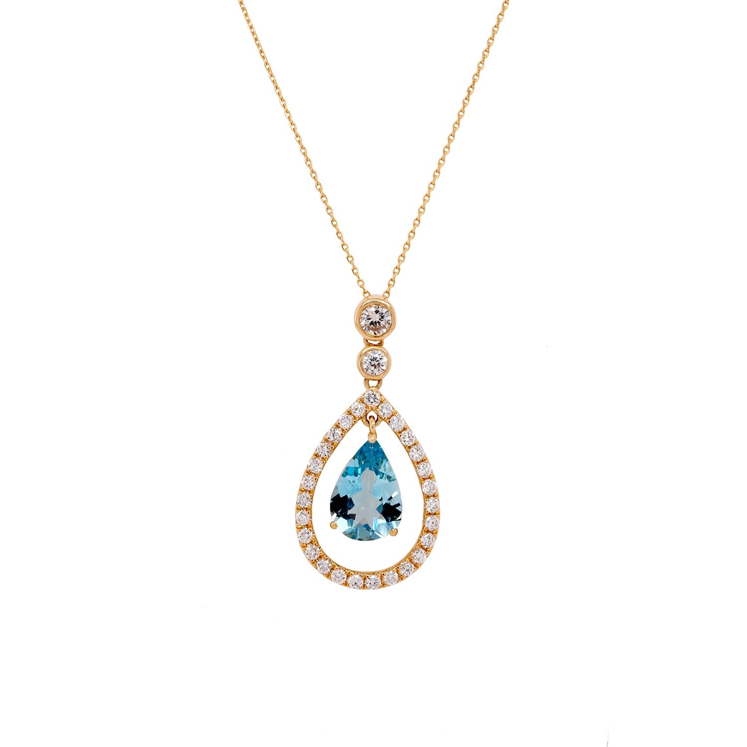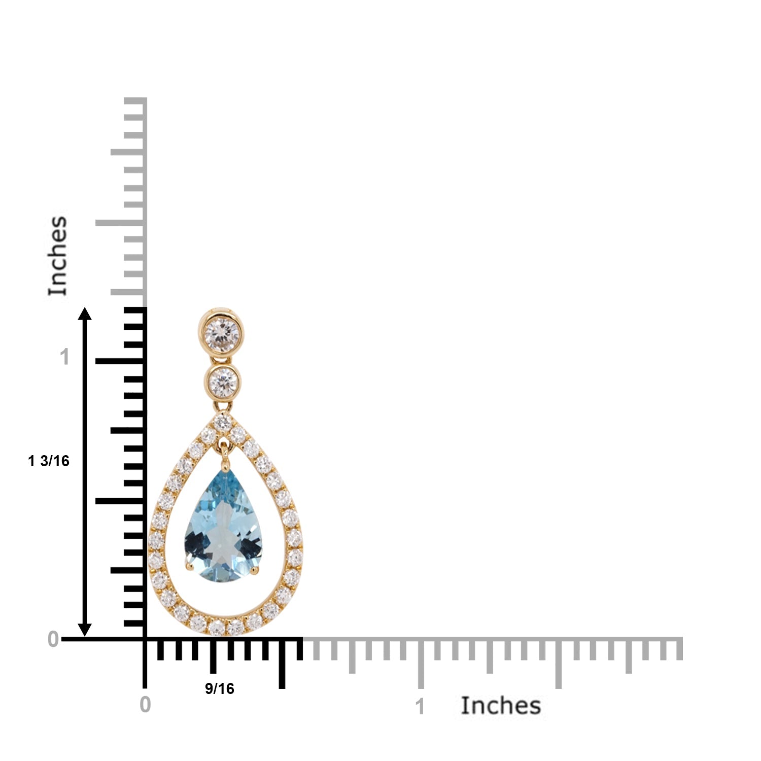 This fine pendant is a must-have in your jewelry collection to complement your rich look. Designed with 14K yellow gold, this stylish pendant has an eye-catching detailing. With a pear cut Aquamarine and round cut diamonds, this pendant is a unique piece of artistic grandeur.