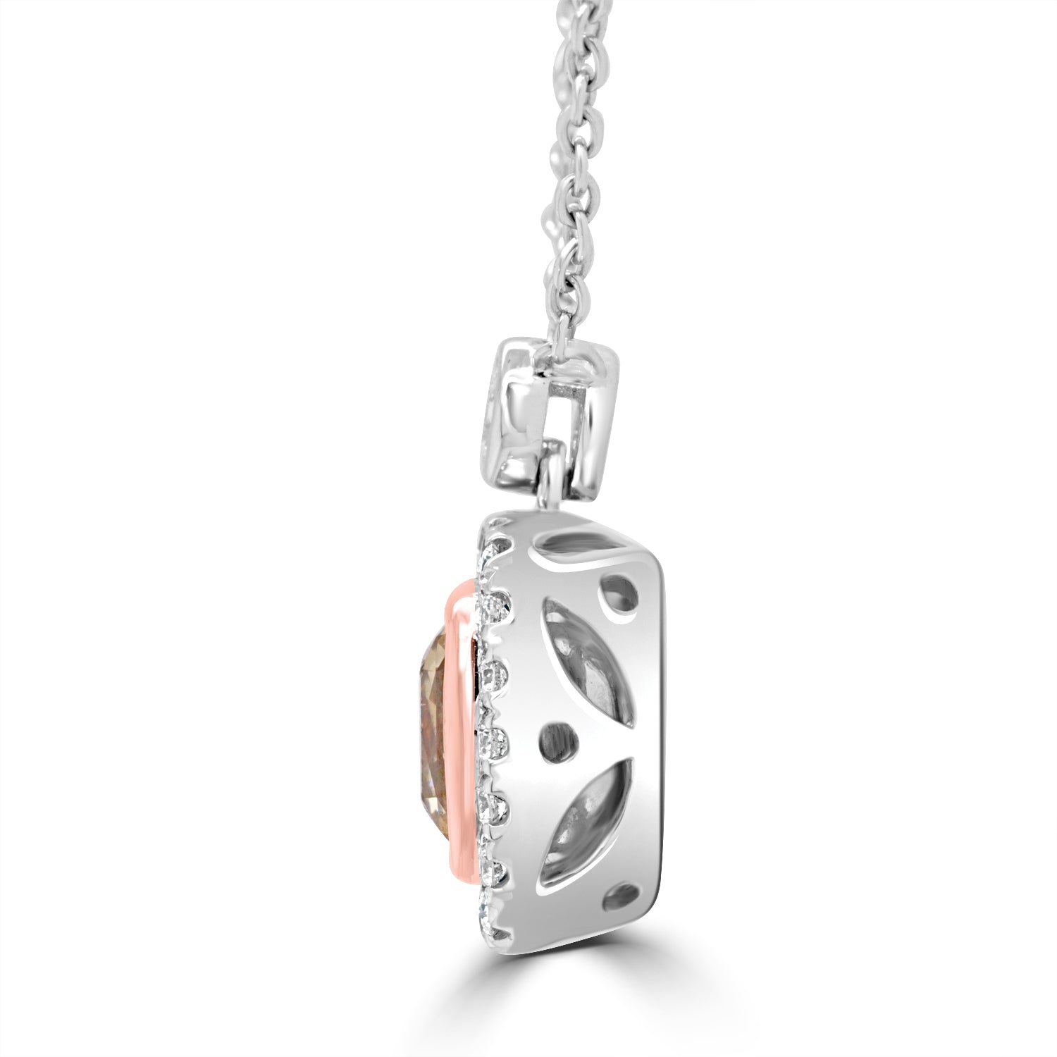 Crafted of 14K two-tone gold, this captivating necklace is perfect for any occasion. set with an eye-catching cushion cut Yellow Diamond at the center, this flattering necklace is enhanced by dazzling round cut Diamonds that encircle it in a brilliant style.