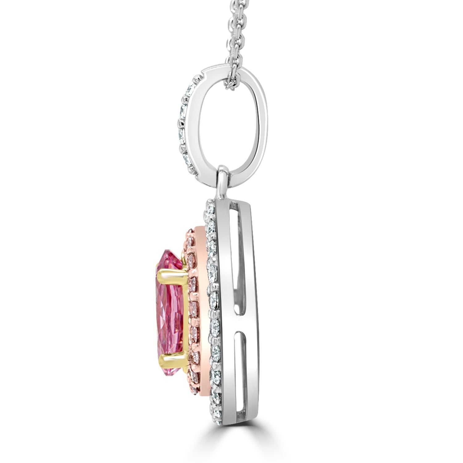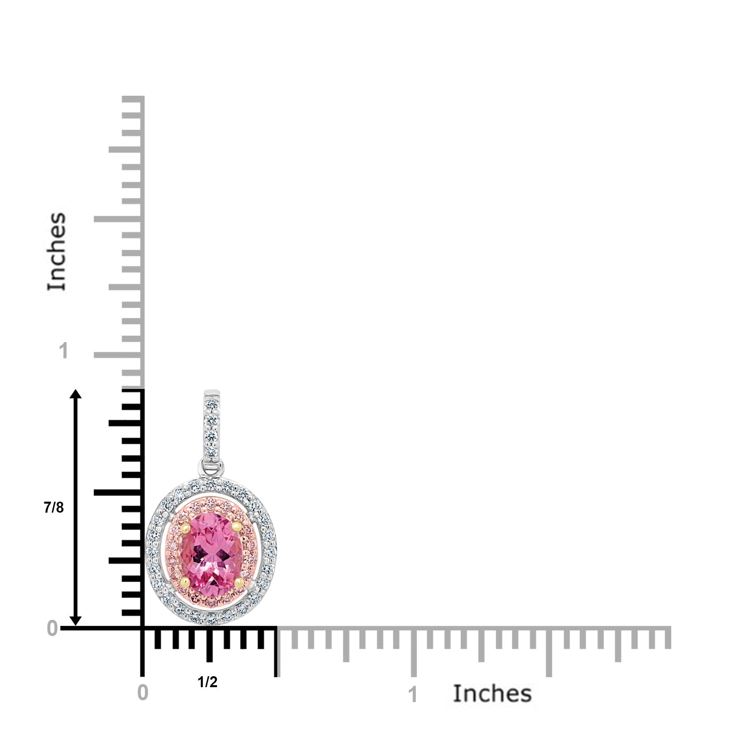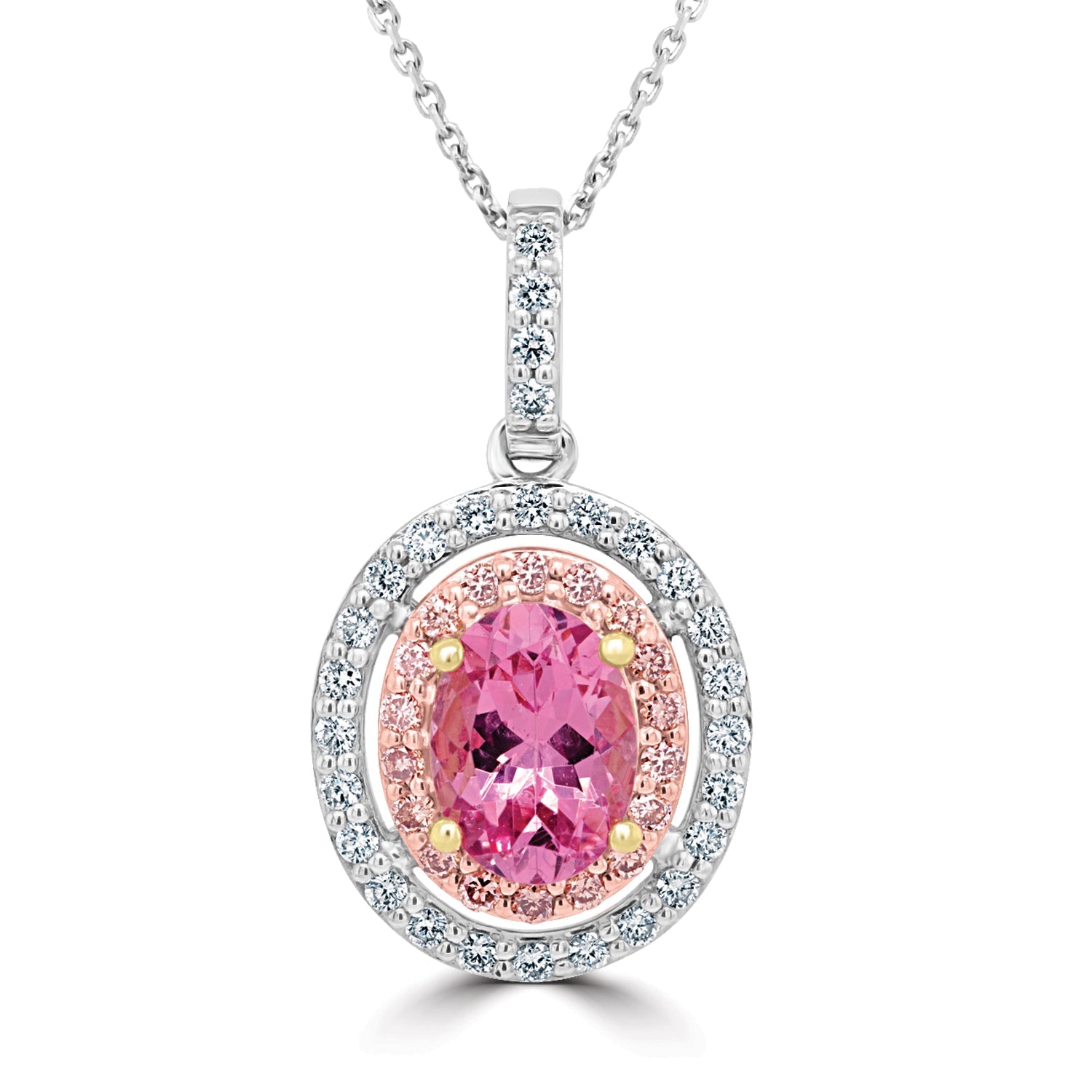 Designed with 14K two-tone gold for added richness, this pendant is adorned with breathtaking oval cut Malaya Garnet at the center. Surrounded by round cut Diamonds that lend a sparkling look to all your attires.