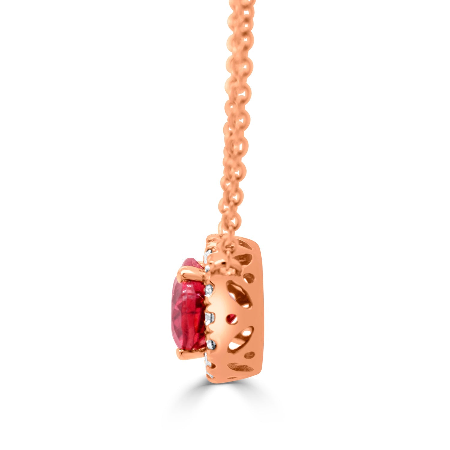Designed To Perfection With Shiny 14K Rose Gold, This Stunning Necklace Is Designed With A Magnificent Oval Cut Tourmaline. The Glorious Hue Of The Gemstone Is Accentuated By The Sparkle Of The Round Cut Diamonds Around It.
