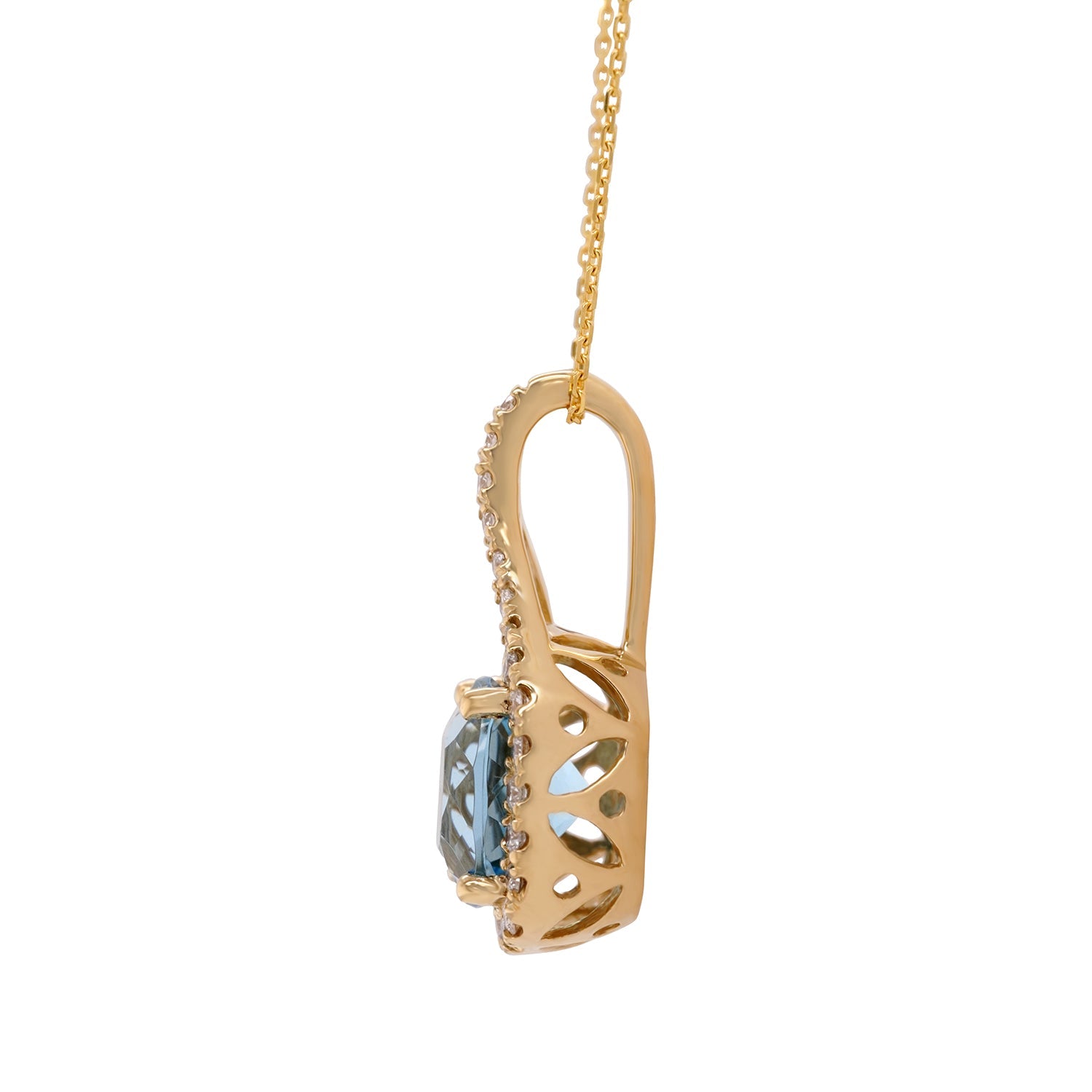 The magnificent sea-blue color of the Aquamarine is brought to the forefront by its striking cushion cut, giving your ensemble an eye-catching finish. Embellished with round cut Diamonds that glitter and sparkle like stars, the lustrous glow of this pendant is truly unmatched. Designed in 14K yellow gold, this refined jewelry is the right way to highlight your charming personality.