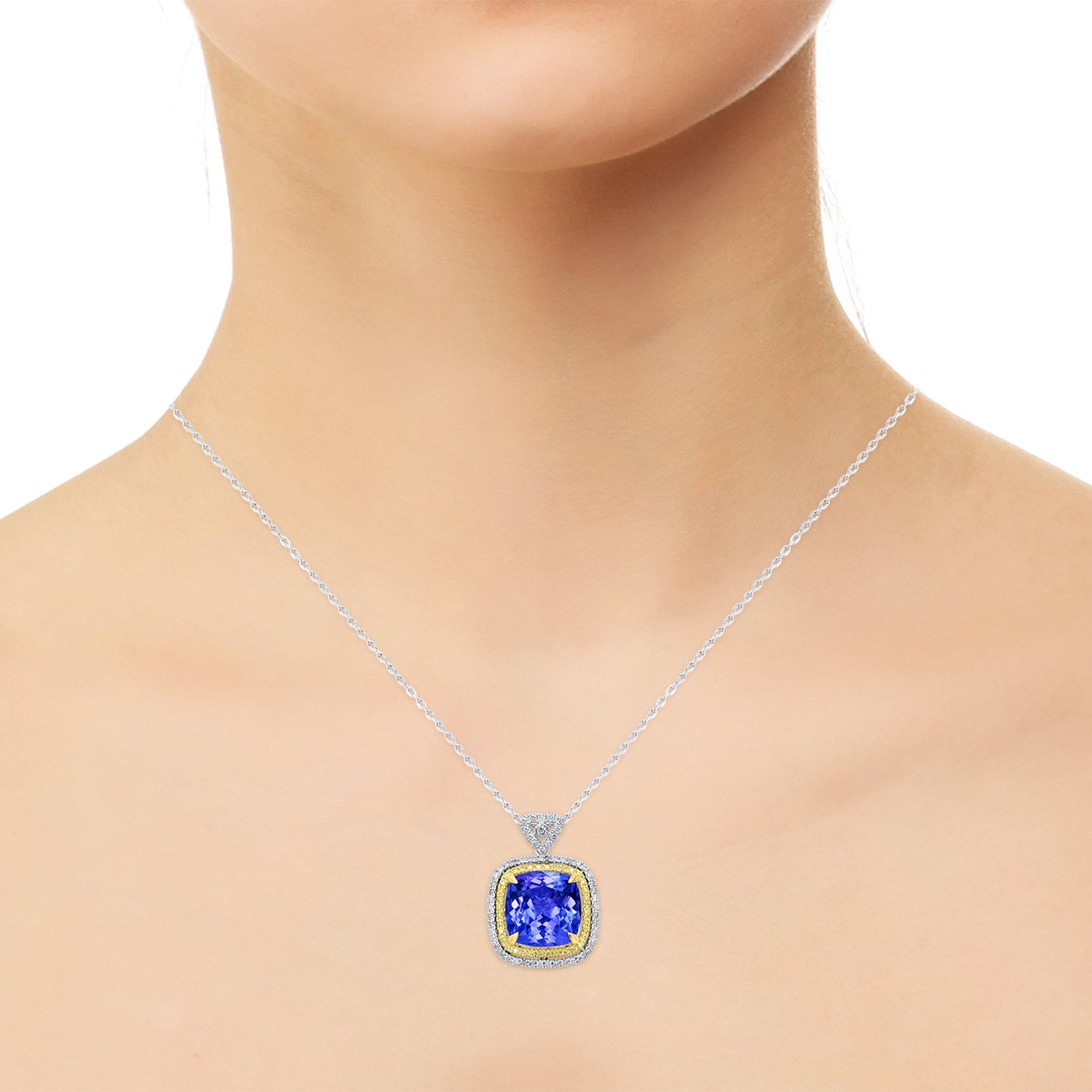 Set with a gorgeous cushion-cut Tanzanite, this exquisite pendant is crafted of 18K two-tone gold for a rich finish. The sparkle of the splendid round Diamond further enhances the stunning gemstone for an endless shimmer.