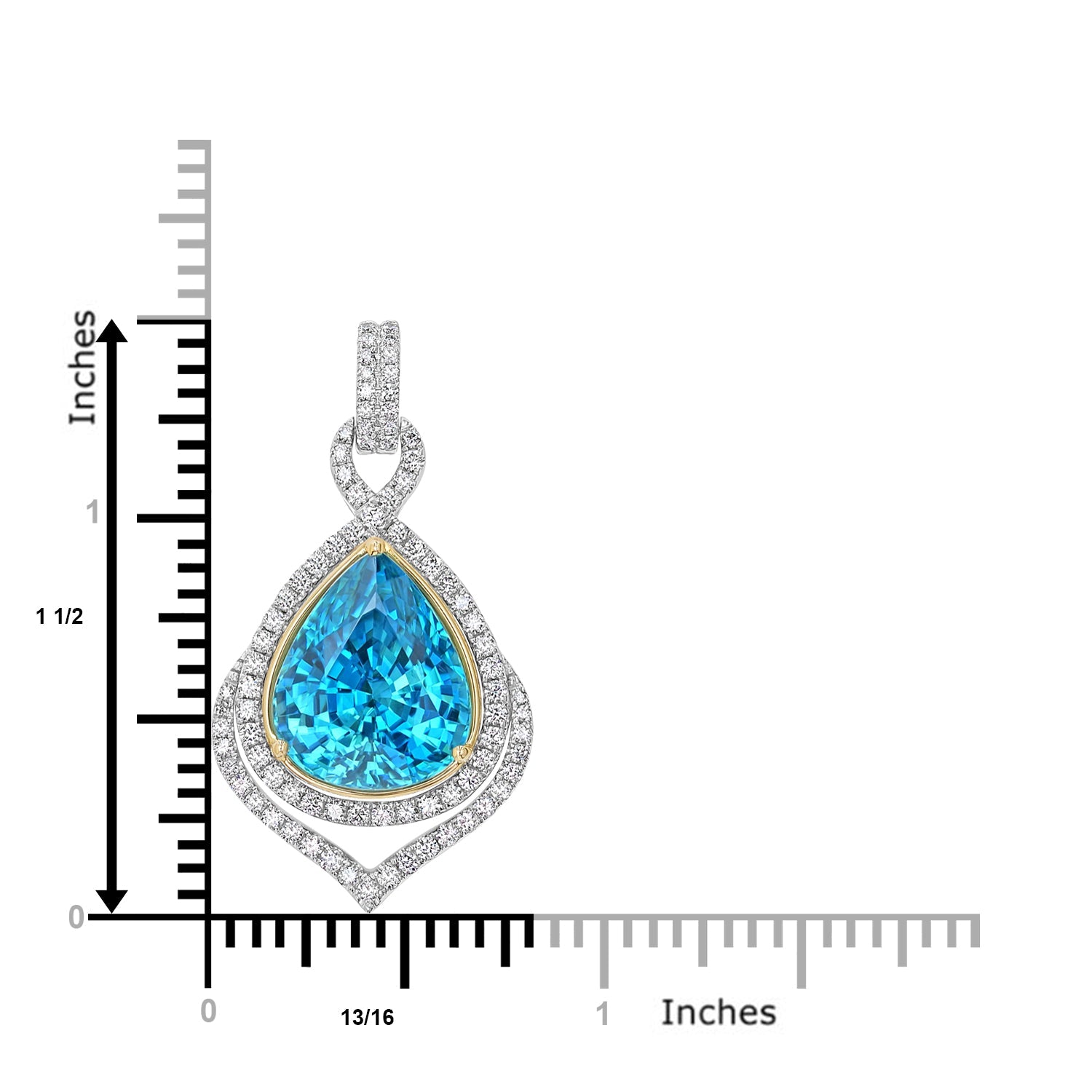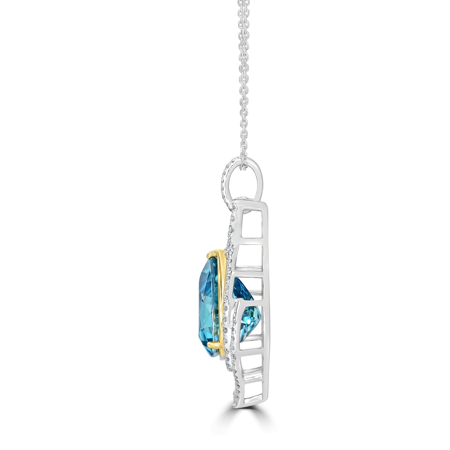 Set with a spectacular pear cut Blue Zircon, the brilliance of the gemstone is accentuated by the sparkle of the round cut Diamonds. Designed with 18K two tone gold, amp your style in a flash wearing this sensational pendant.