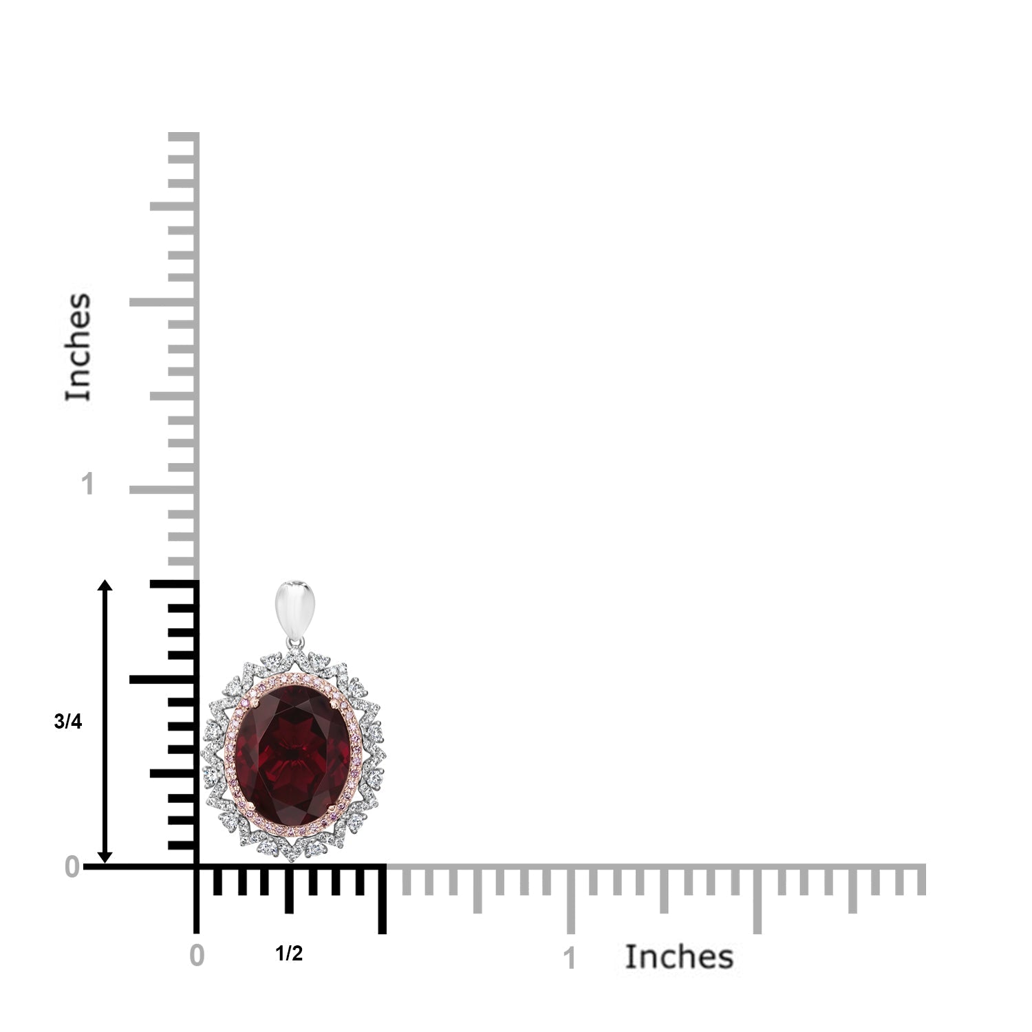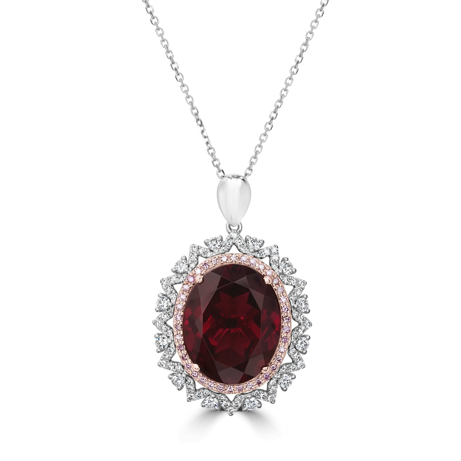 Designed to perfection with glossy 18K two tone gold, this enchanting pendant is set with an incredible oval cut Rhodolite Garnet. Surrounded by splendid round cut Diamonds, this striking pendant reflects your charming persona with panache.