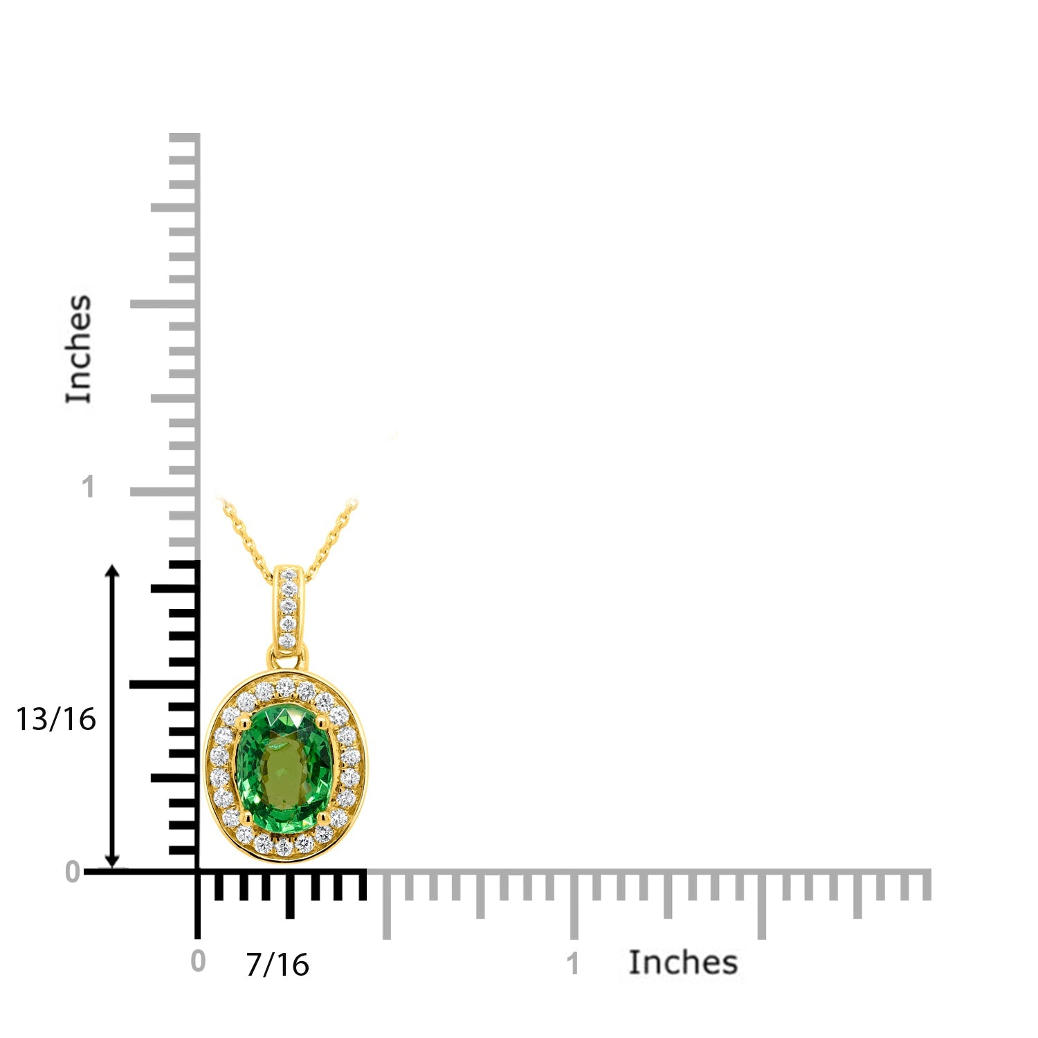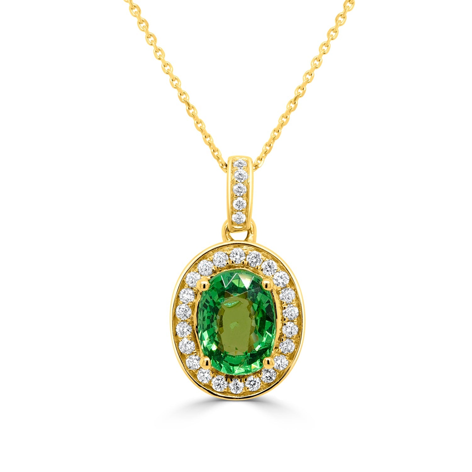 Crafted from 14K yellow gold and set with the oval-cut Tsavorite, this pendant is also features round Diamonds around the gemstone.