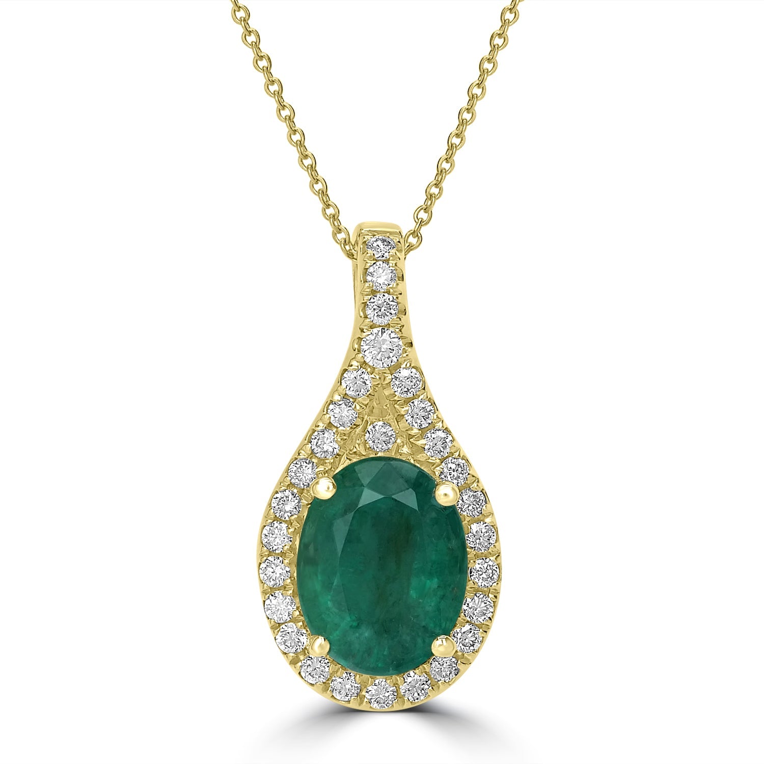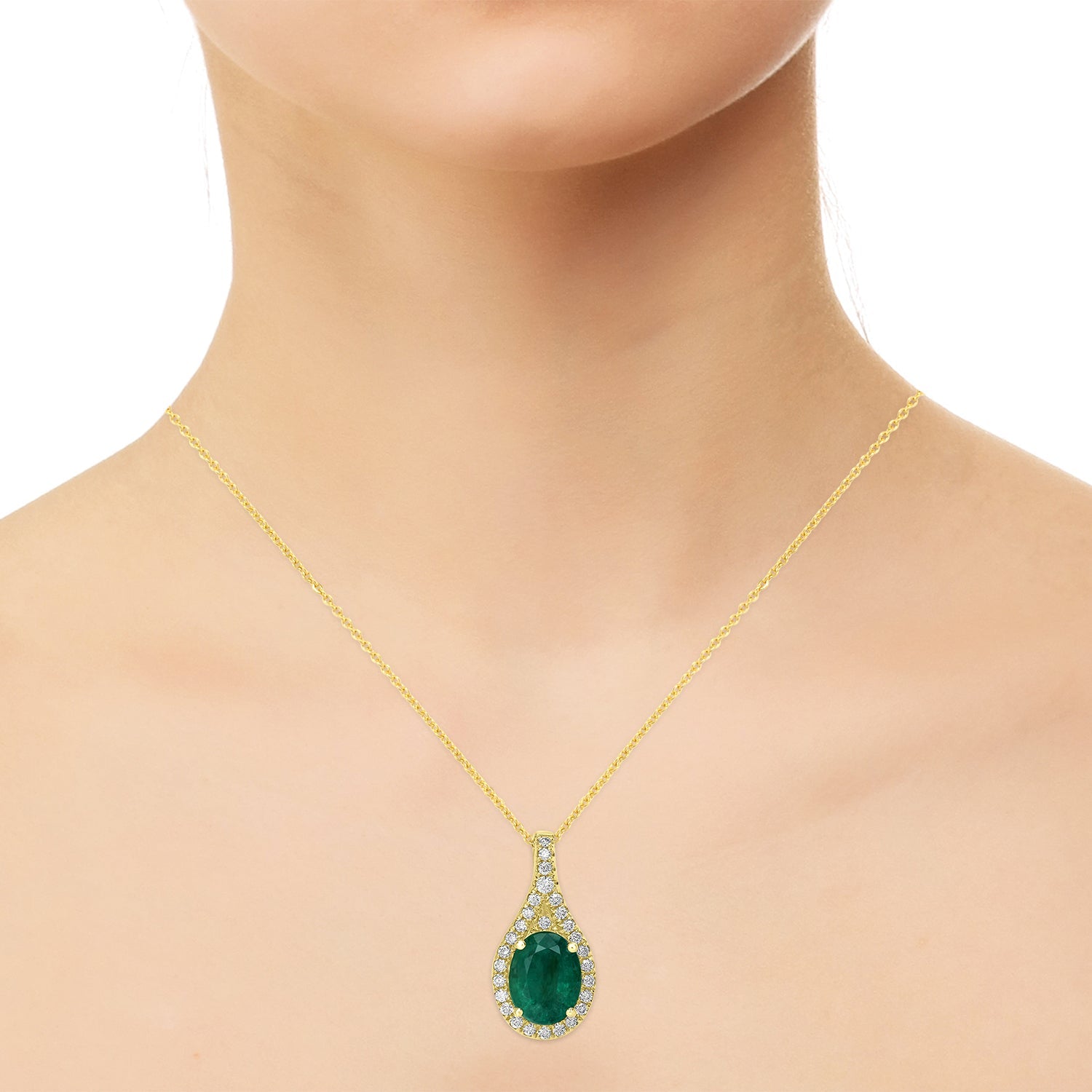 Crafted from 14k yellow gold, this exquisite pendant is set with an oval-cut Emerald and round Diamonds making it the perfect sparkling accessory.