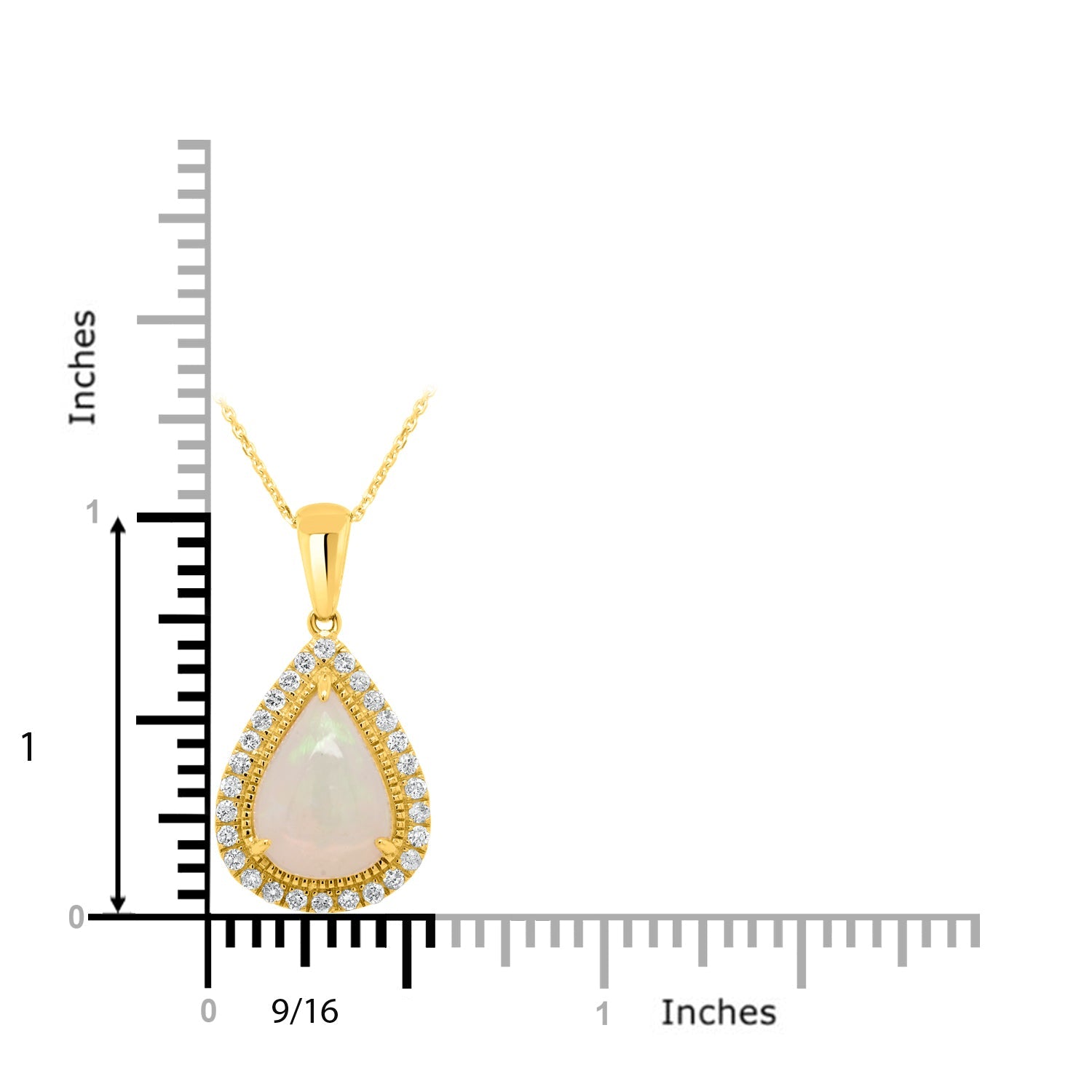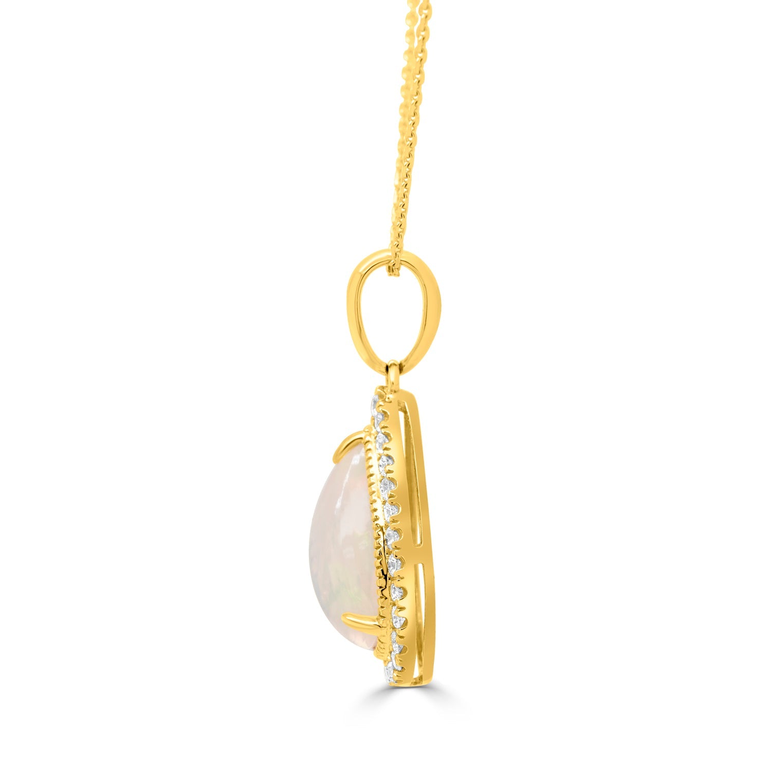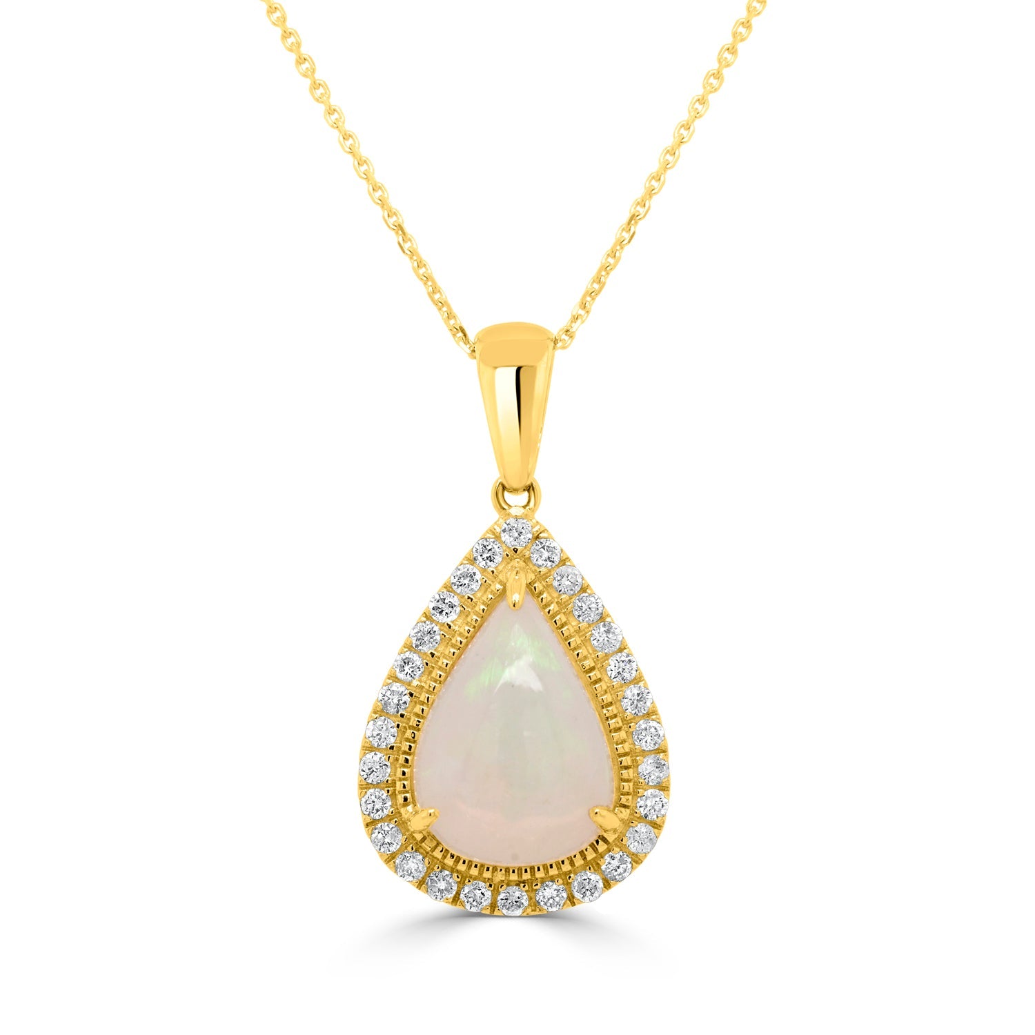This pendant is set with a pear-cut Opal and round Diamonds that are designed with 14k yellow gold in an enchanting arrangement.