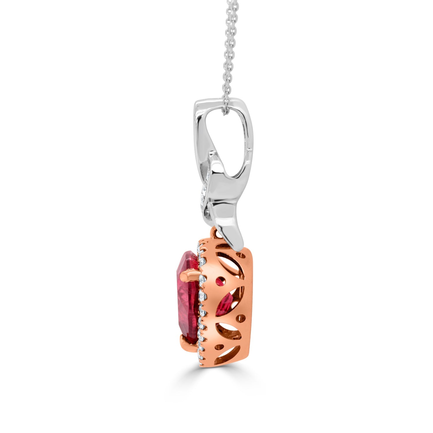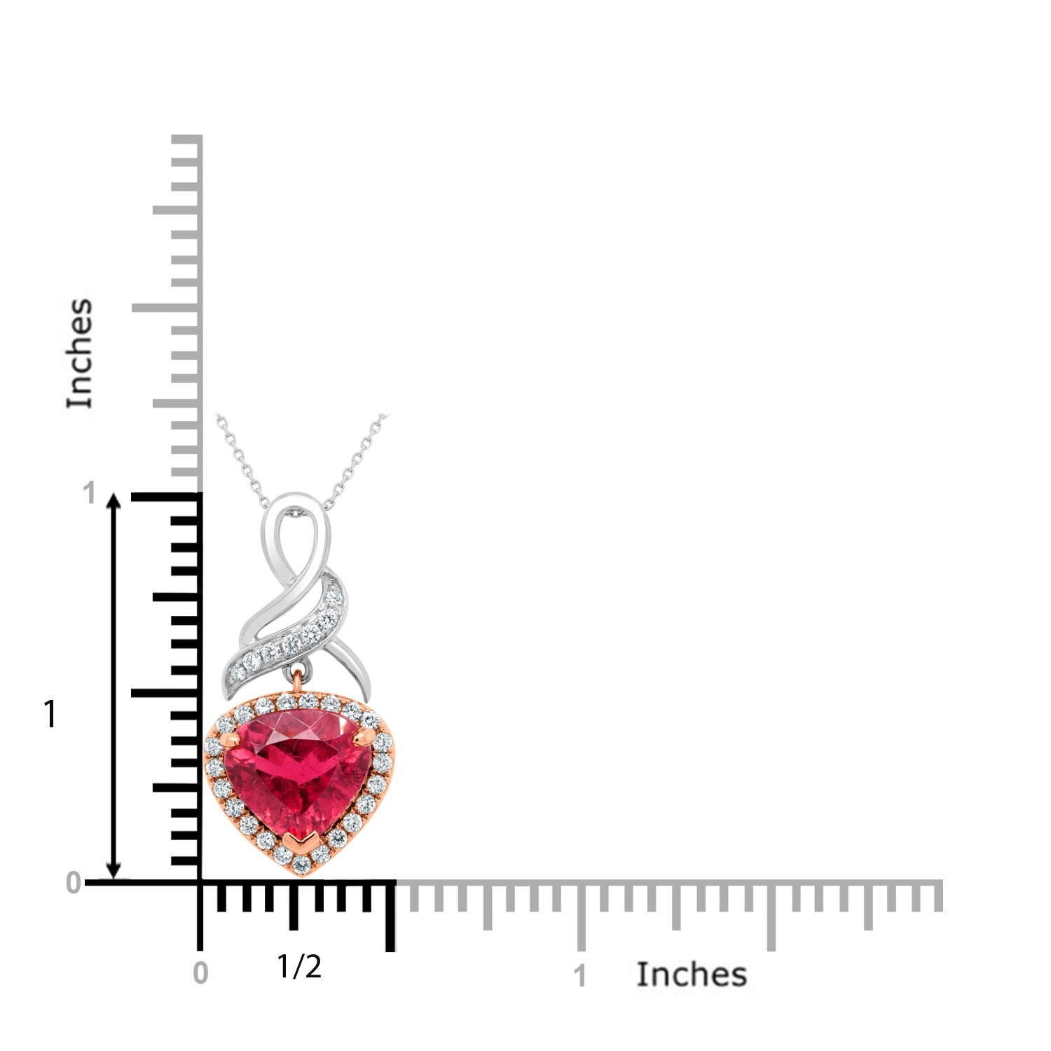 Crafted from 14K two-tone gold, the design of this breathtaking pendant exudes maximum brilliance. Discover a unique piece of luxury style with this captivating pendant that is set with shimmering heart cut Rubellite and round cut Diamonds.