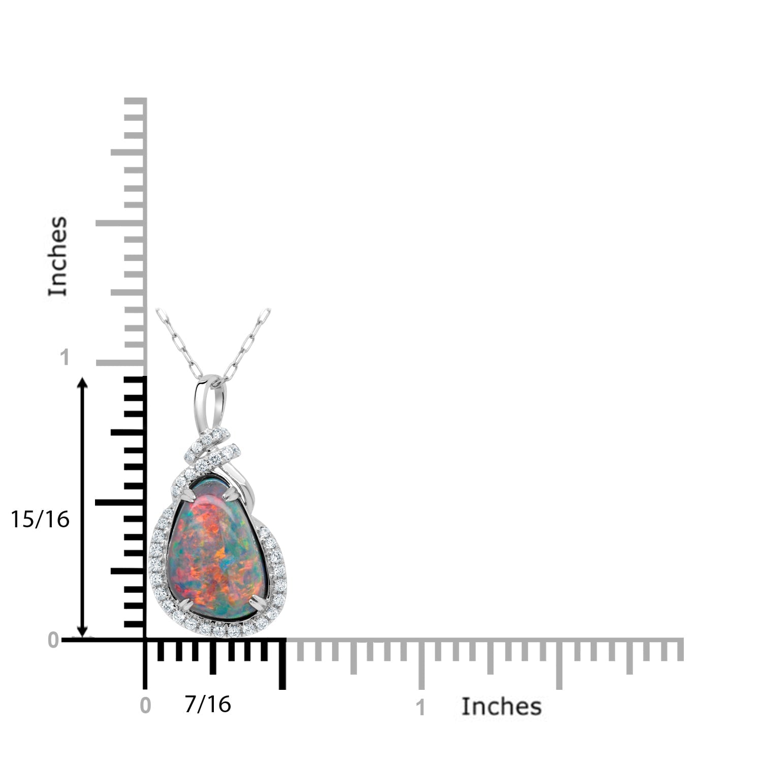Set with a radiant pear cut Opal, this gorgeous pendant will get noticed. Designed with 14K white gold and enhanced with shining round cut Diamonds all around it.