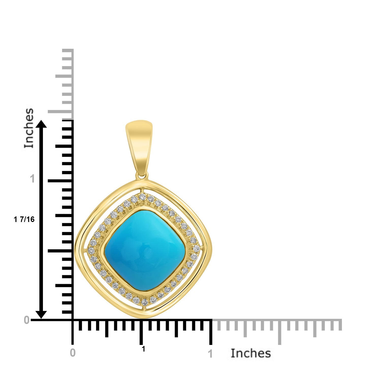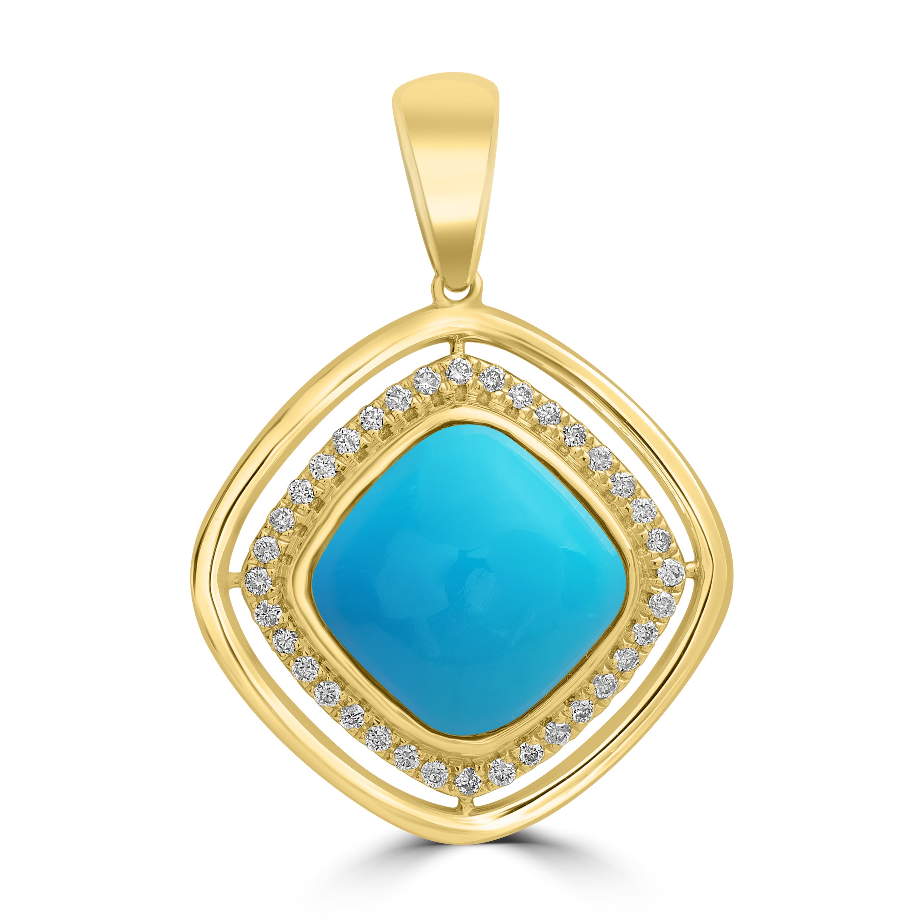 This stylish 18K yellow-gold pendant exudes a luxe feel with its world-class craftsmanship. Showcasing a world-class design with captivating cushion-cut Turquoise and round Diamonds, it adds charm to any ensemble. Its timeless charm makes it an ideal gift for your loved ones.
