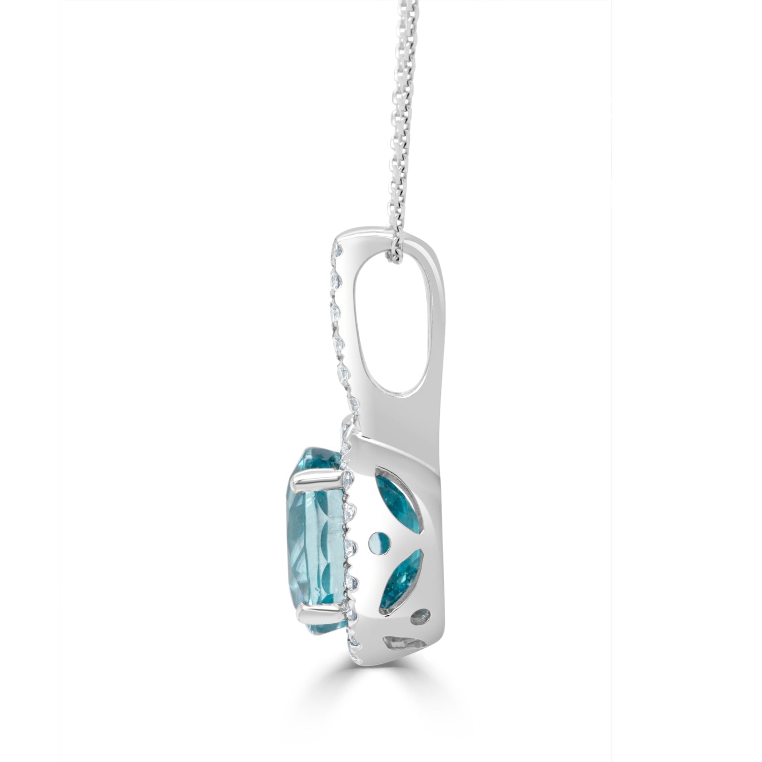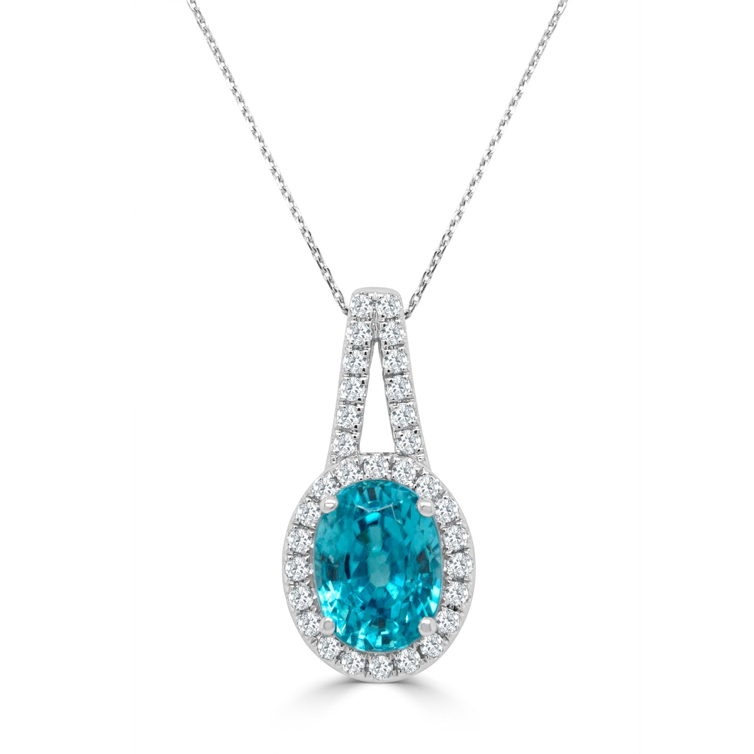 Designed With A Stunning Oval Cut Blue Zircon, This Enchanting Pendant Is Crafted Of 14K White Gold For A Lustrous Finish. Surrounded By The Sparkle Of Round Cut Diamonds, This Beautiful Jewelry Is Truly Hard To Miss.
