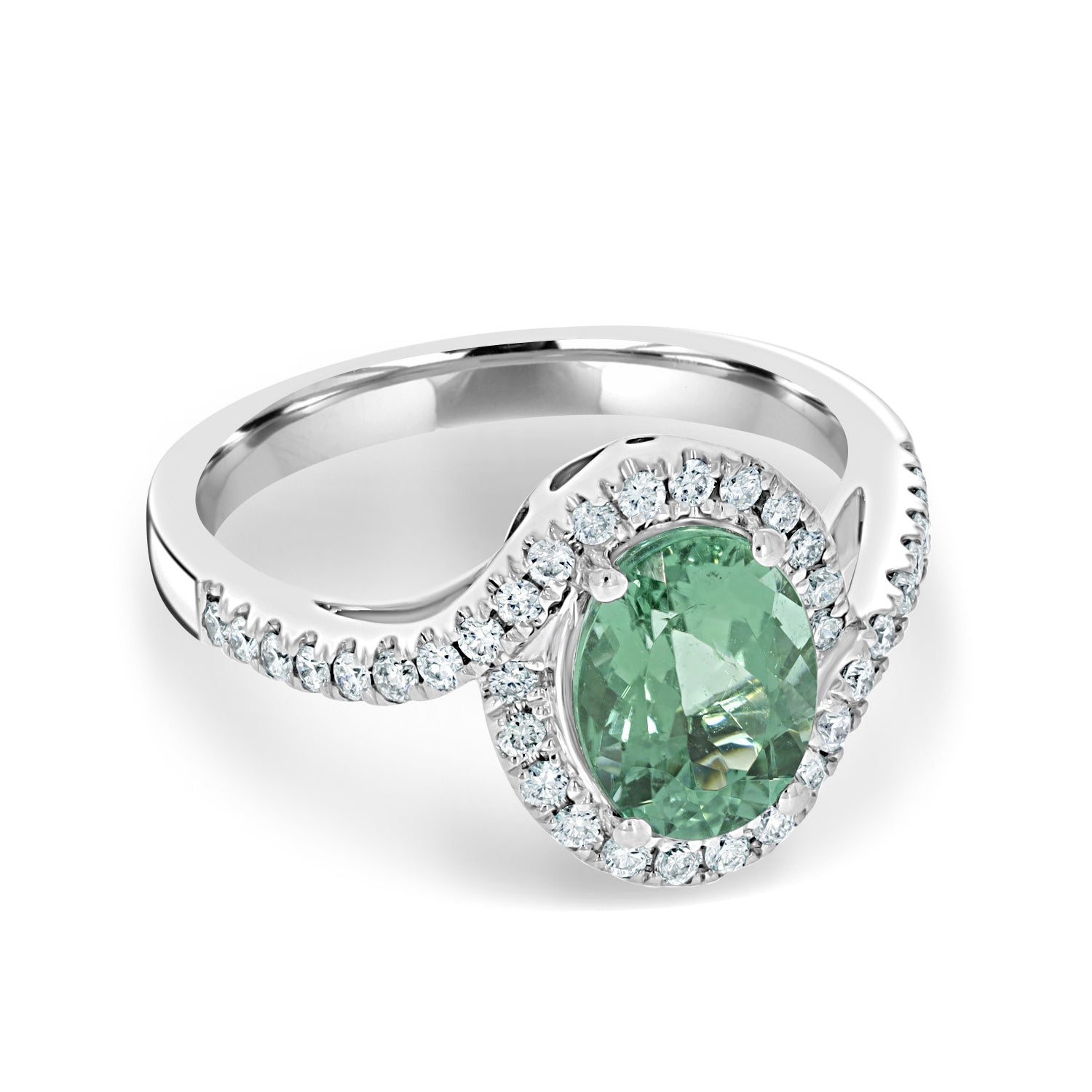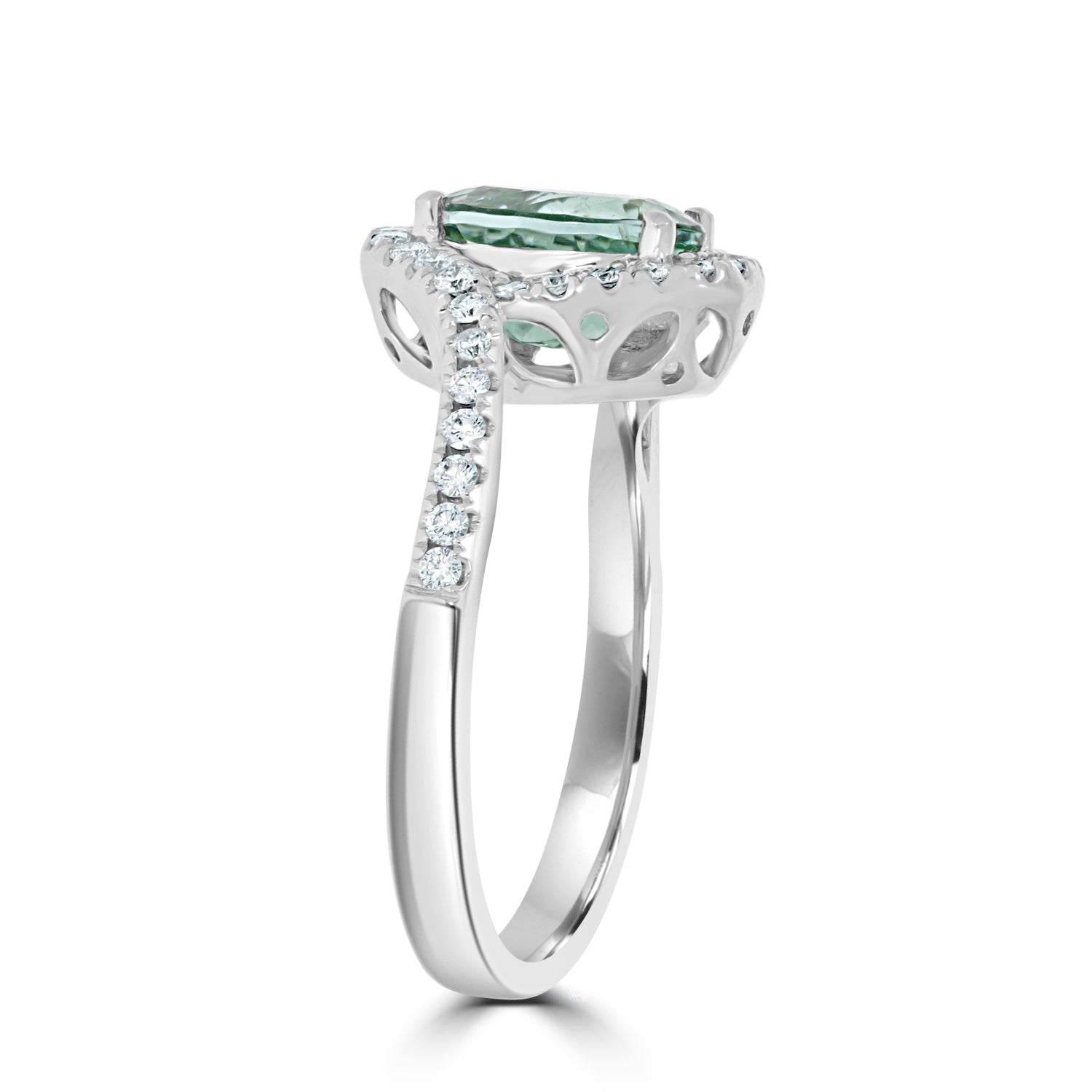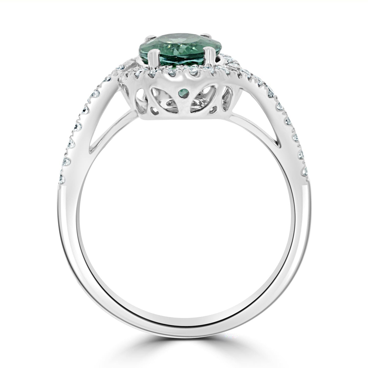 Made of 18K white gold, the artistic style of this intricate ring blends with any ensemble, giving you a dressed-up look. Featuring a splendid oval cut Paraiba, its glistening blue/green shade adds a calmness to your life. Further, the gorgeous stone is bordered by sparkling diamonds that reflect light, giving the luminous ring a glossy finish. Celebrate each day with zest, get this vivacious ring now!