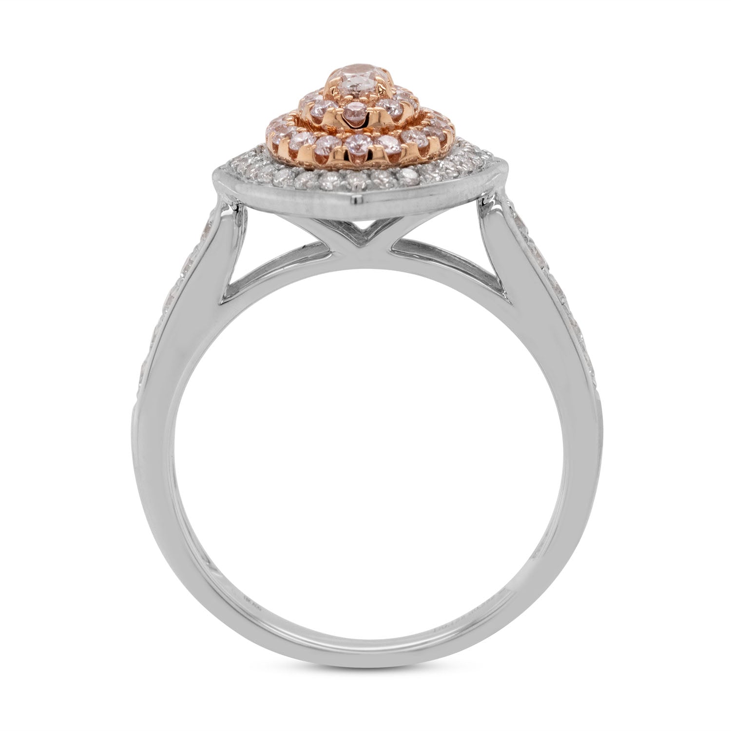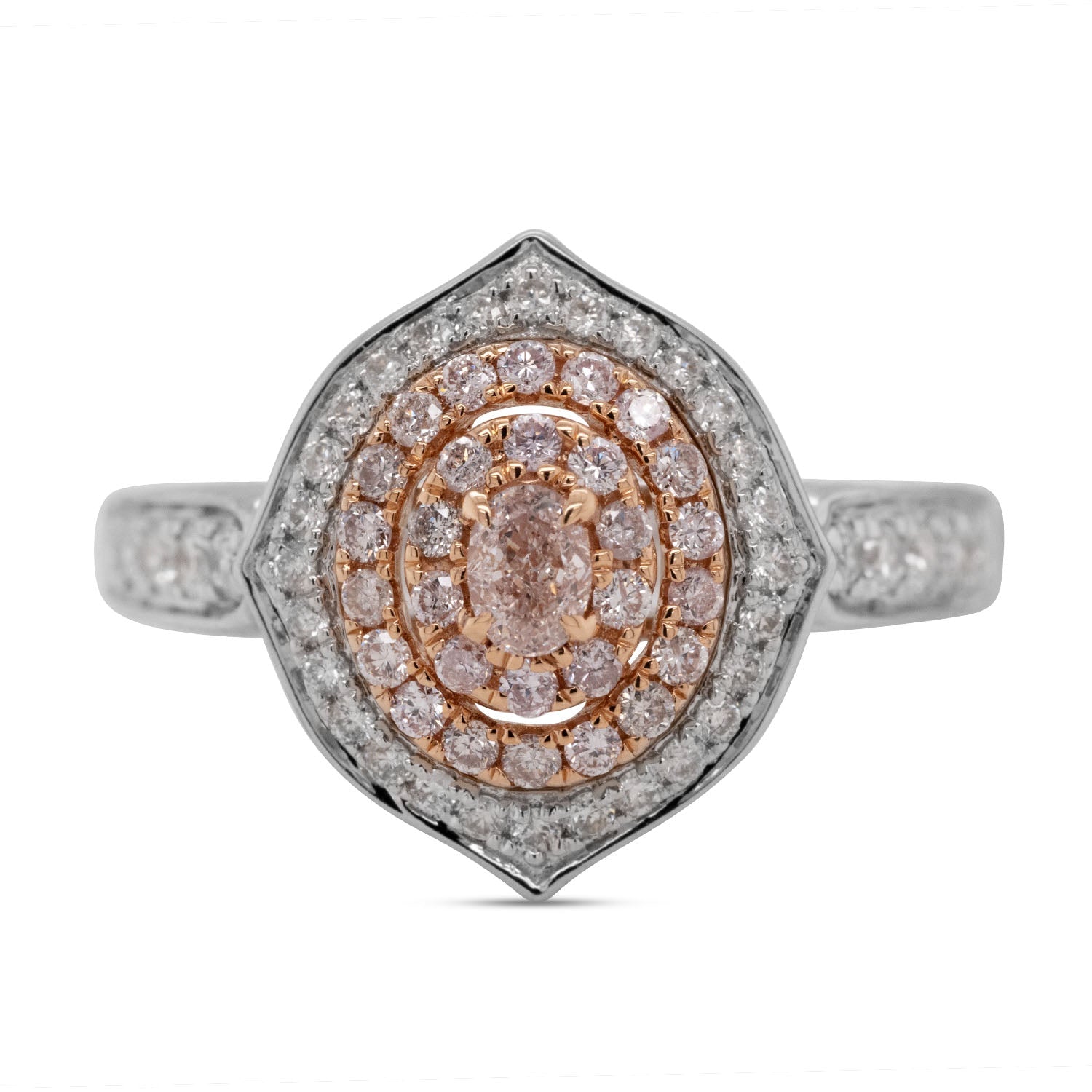 This magnificent ring is all you will need to make a lasting impression wherever you go. Flaunting a stunning oval cut Pink Diamond, its unmatched radiance will make you stand out in a crowd. Enhanced further by round diamonds, the 18K two tone gold fuses these jewels together beautifully to give you the best of the best!