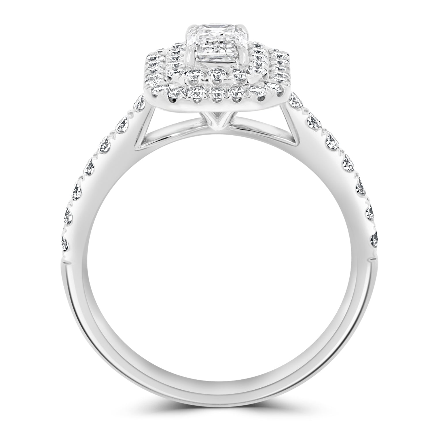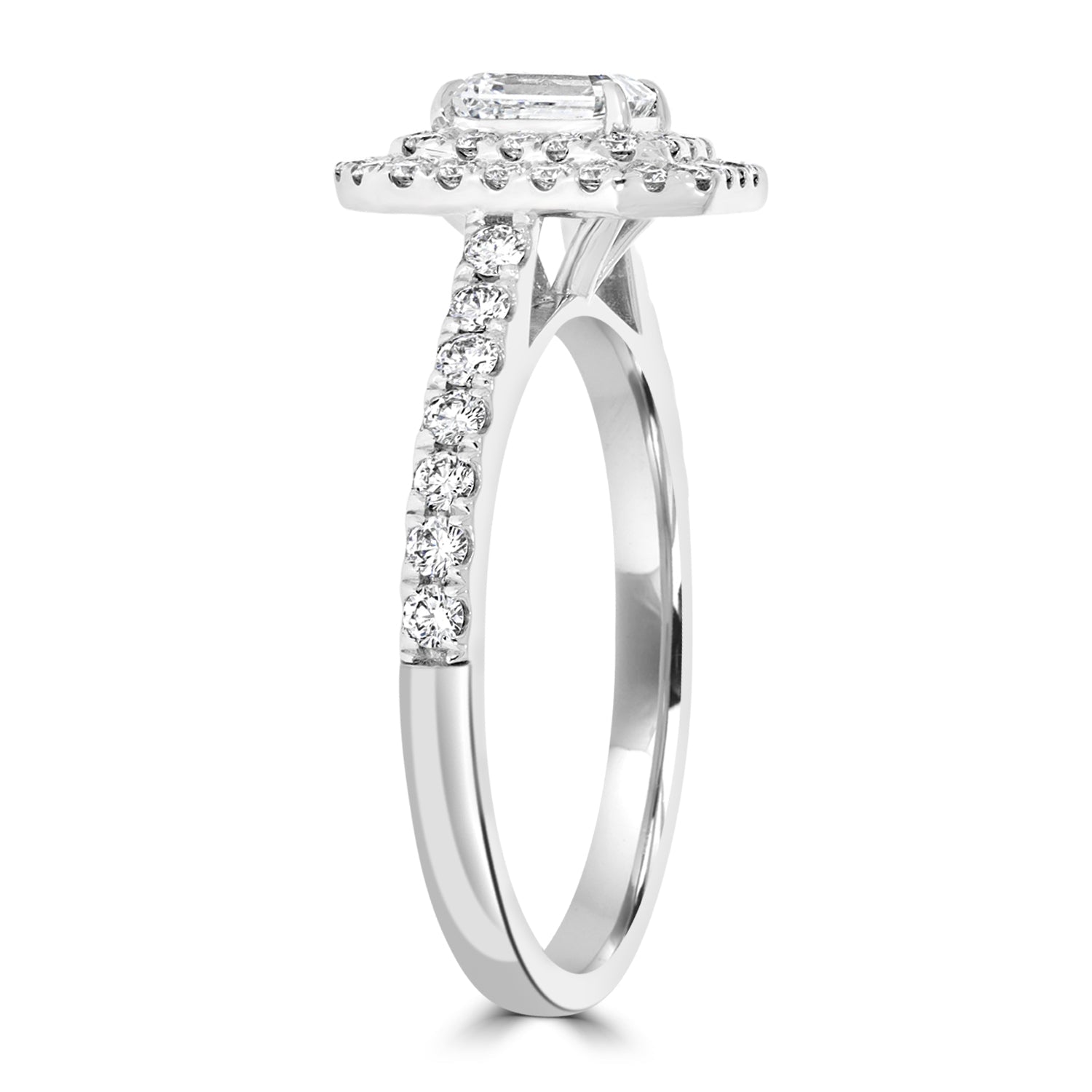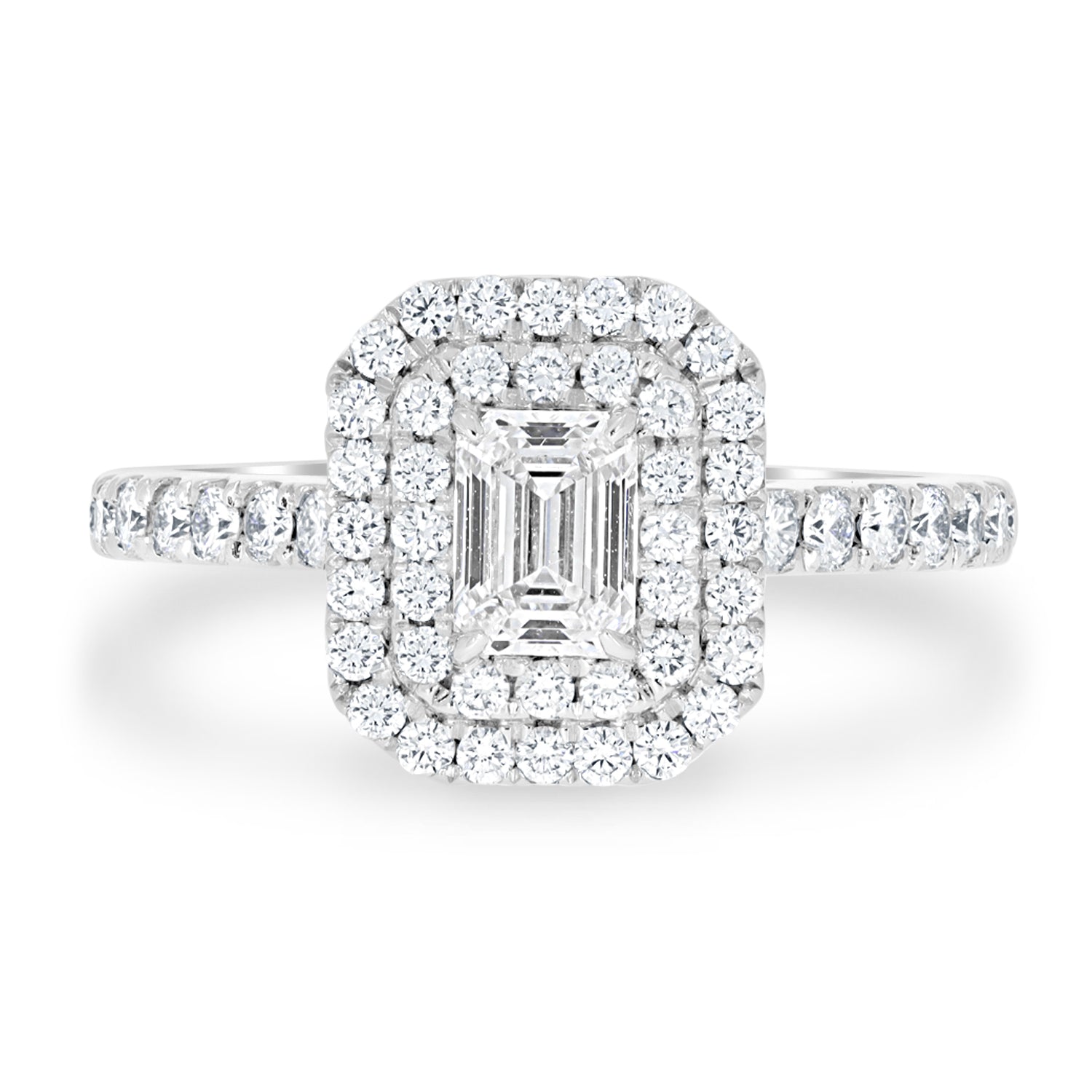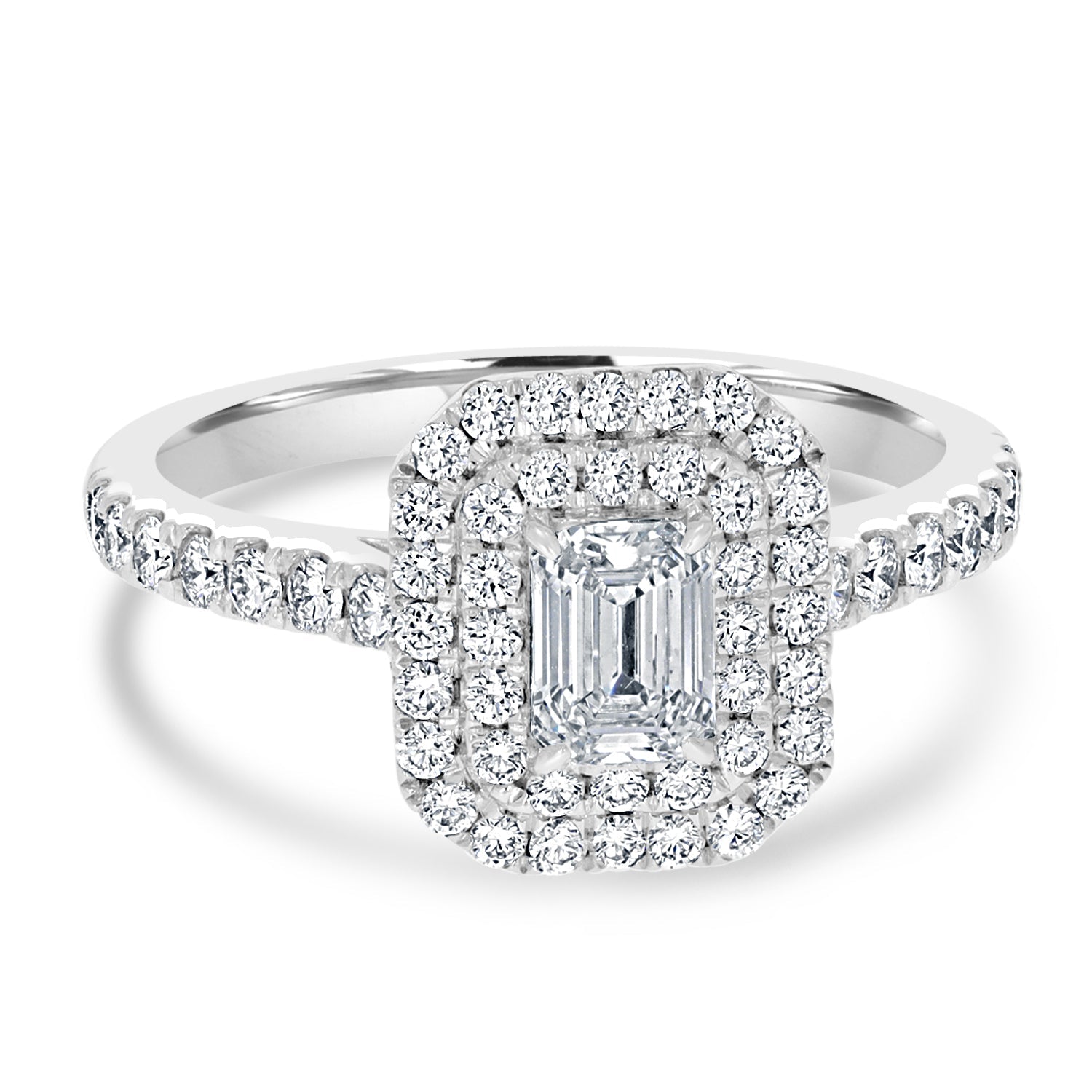 Fashioned with platinum 950, this timeless ring features emerald-cut Diamond and round Diamonds in a high-class setting!