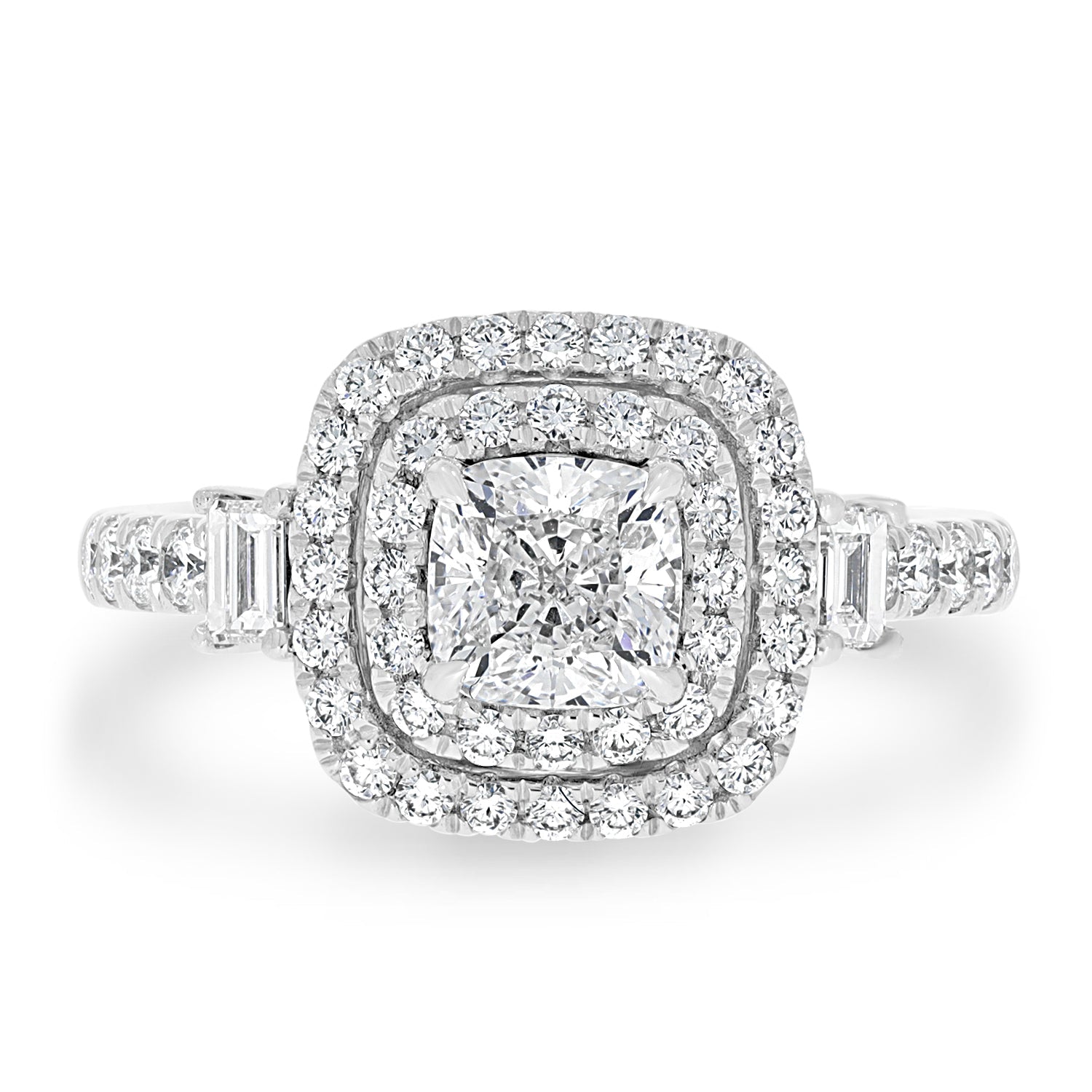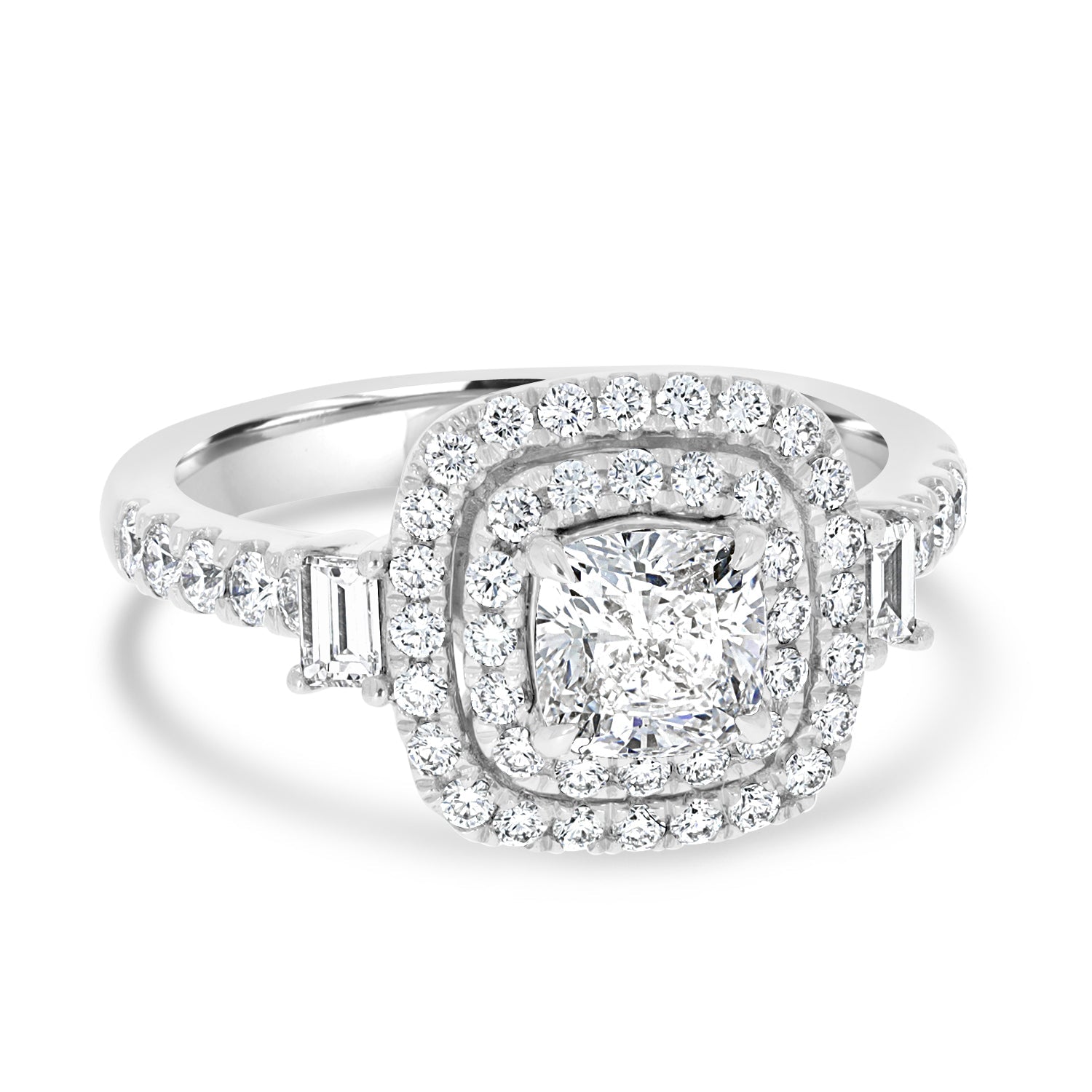 Crafted from platinum 950, this charming ring features a cushion-cut Diamond and round Diamonds in a world-class setting.