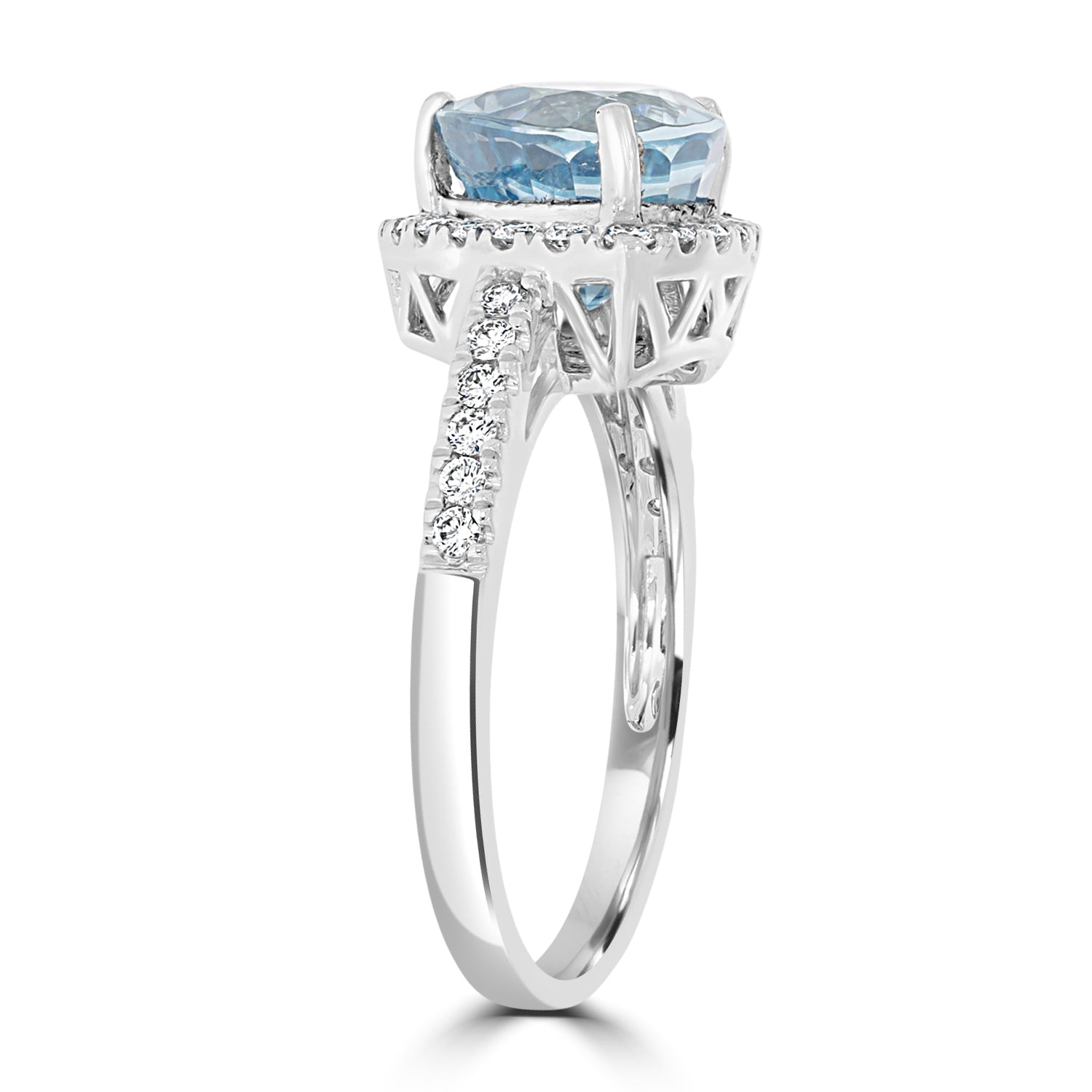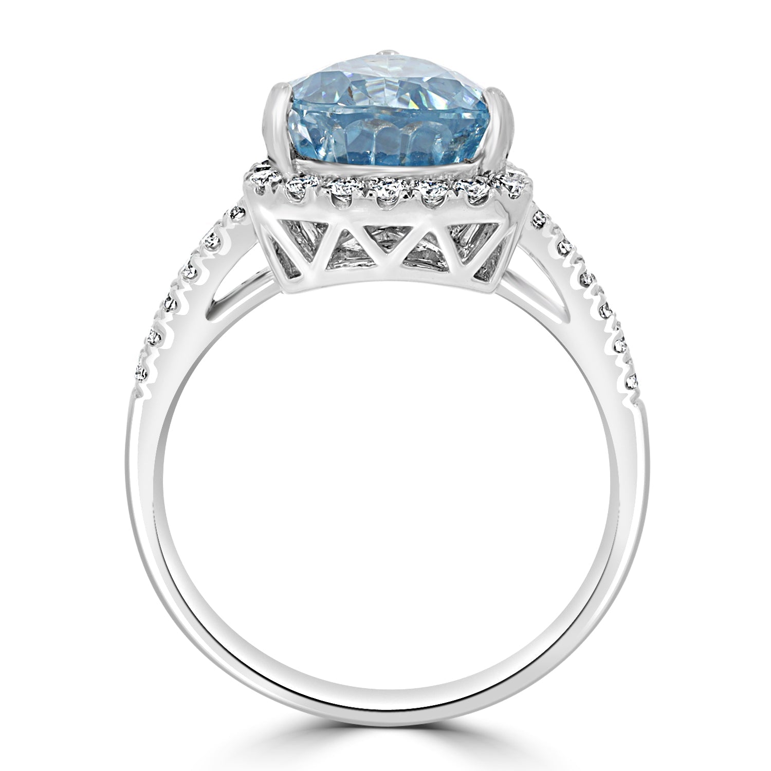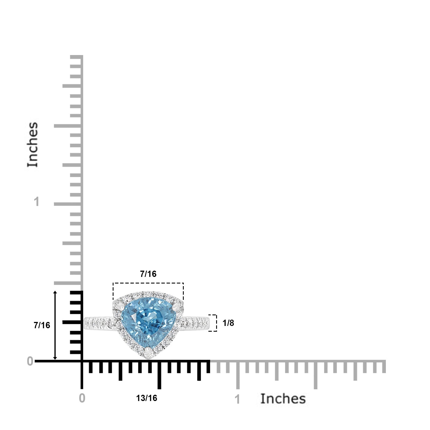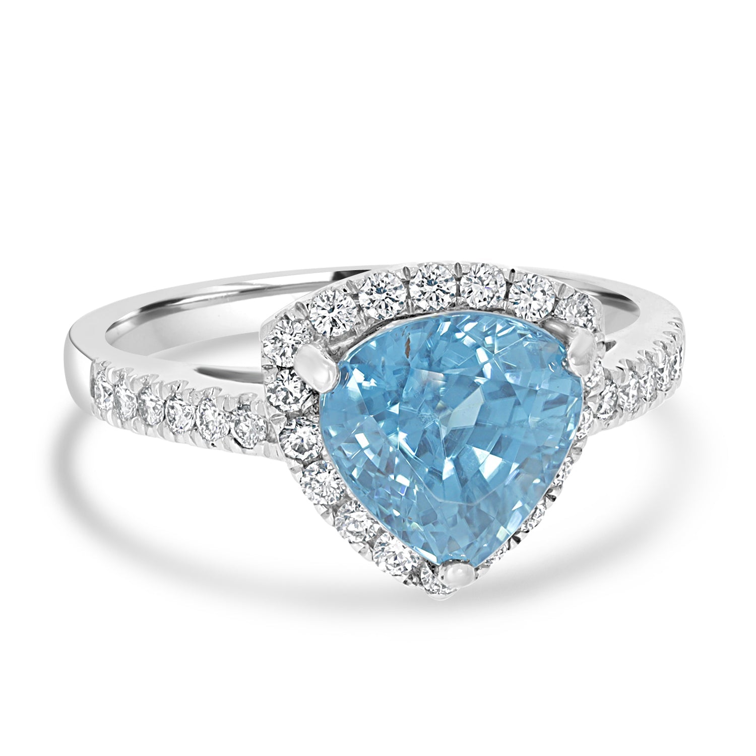 This modern platinum 950 ring features a spectacular trillion-cut blue Zircon and round Diamonds. Truly world-class in its design.