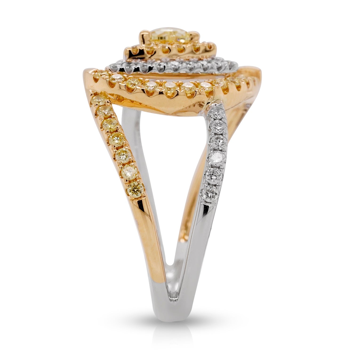 Outstanding jewelry that is sure to dazzle your senses, opt for this spectacular two tone 18K ring that leaves an unforgettable impression everywhere you go. Featuring an exquisite yellow diamond in a trillion cut, the beauty of this magnificent ring is enhanced by the additional round diamonds that give it an everlasting shimmer.