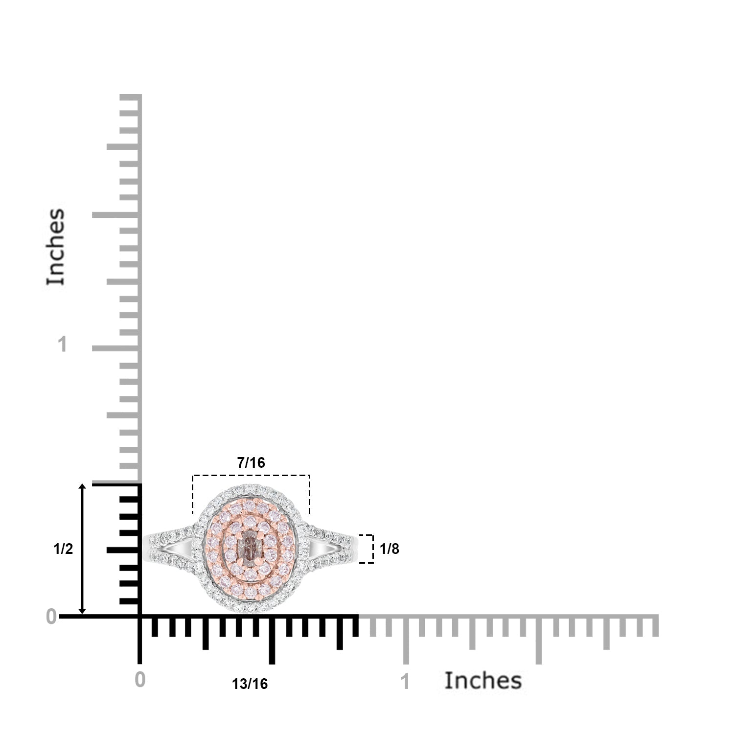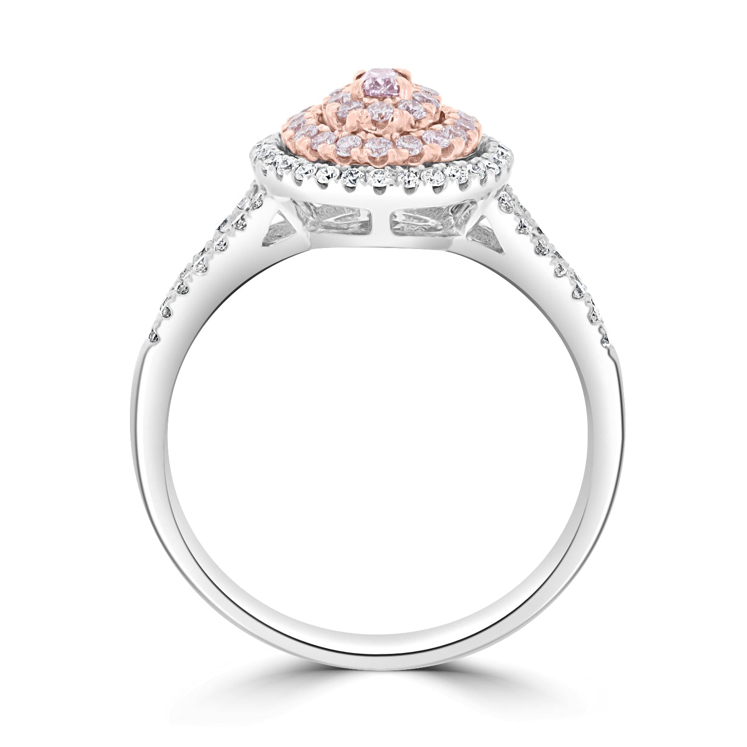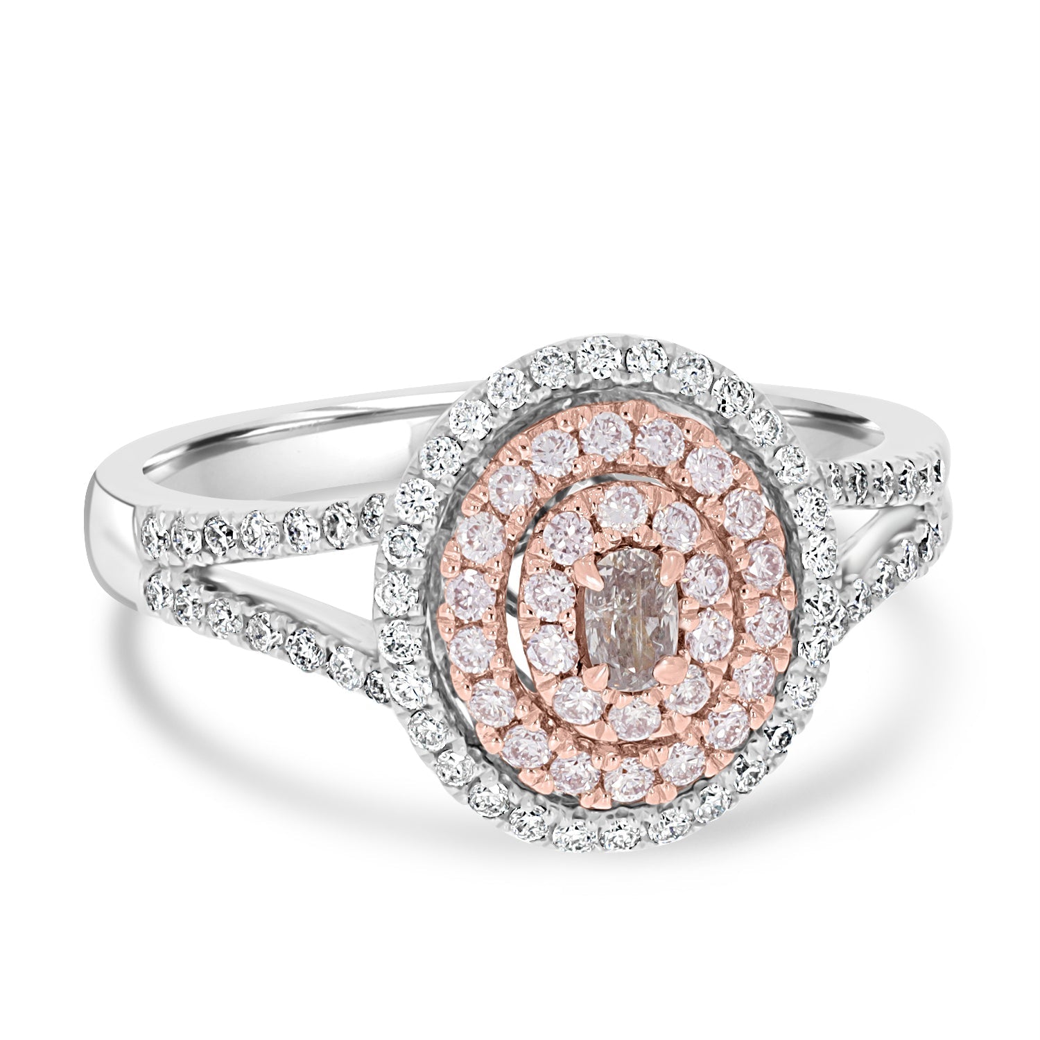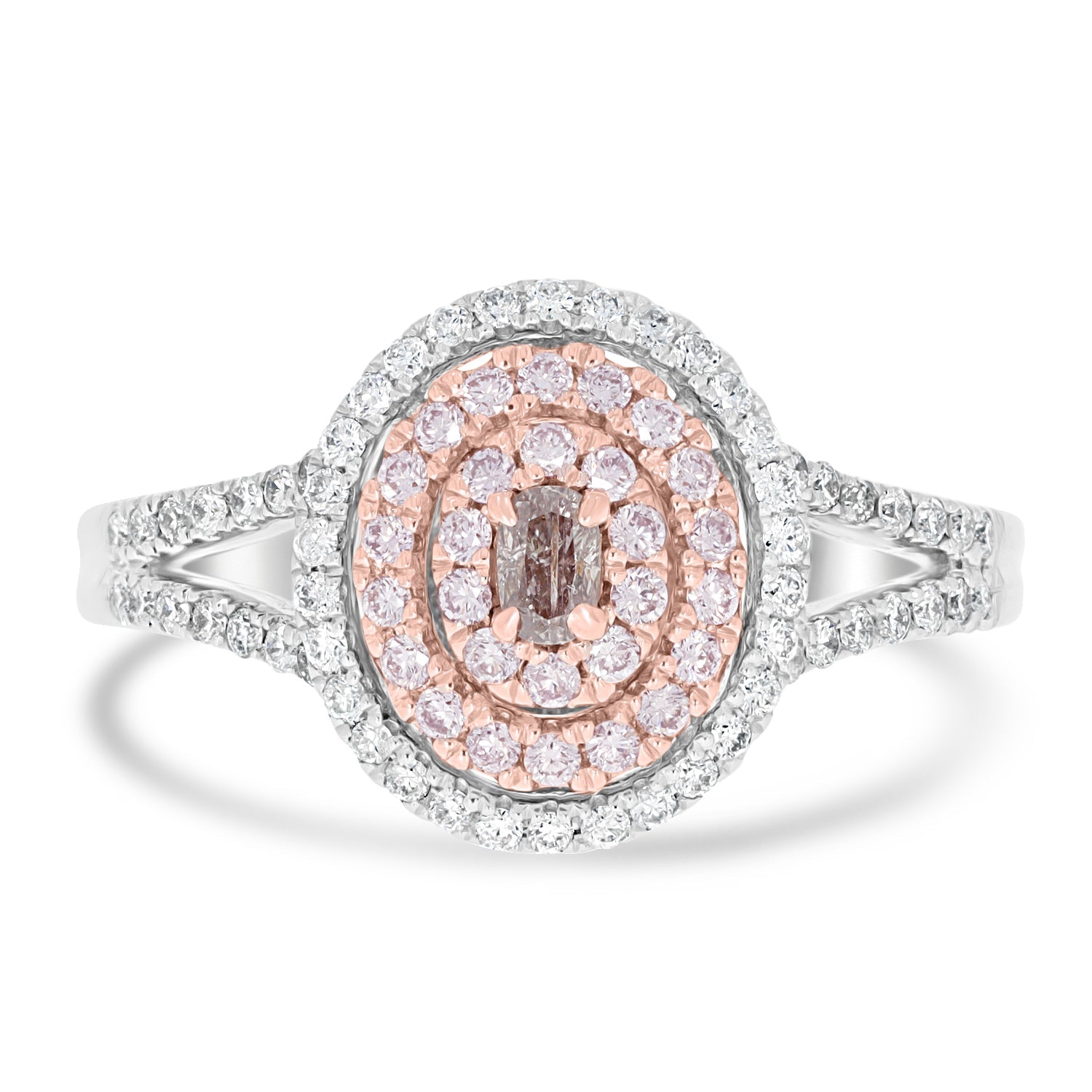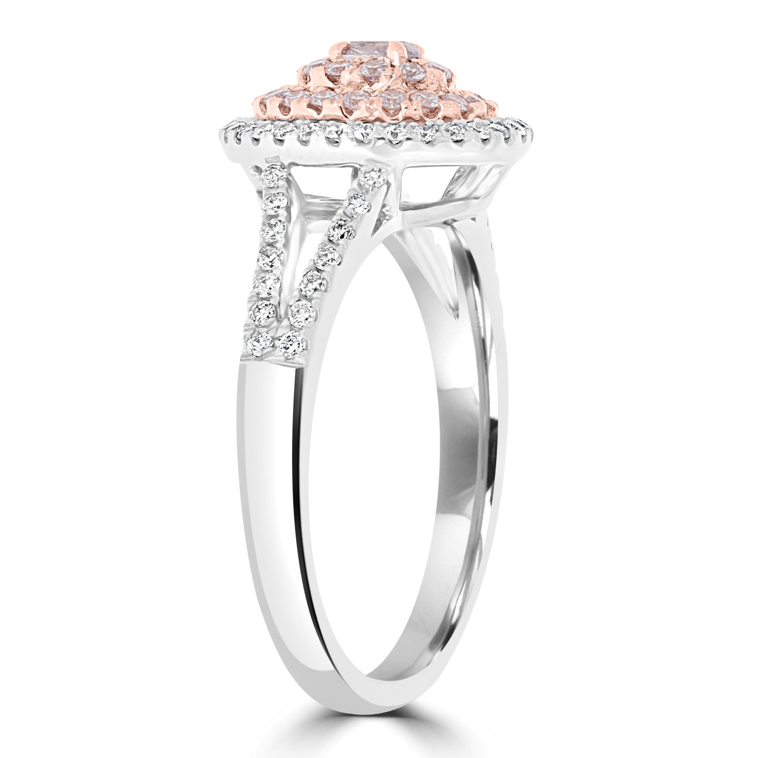 "Set with cushion cut Pink Diamond, this eye-catching ring is designed with 14K two-tone gold and surrounded by beautiful round cut Diamonds."