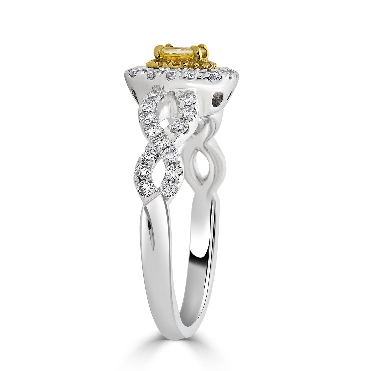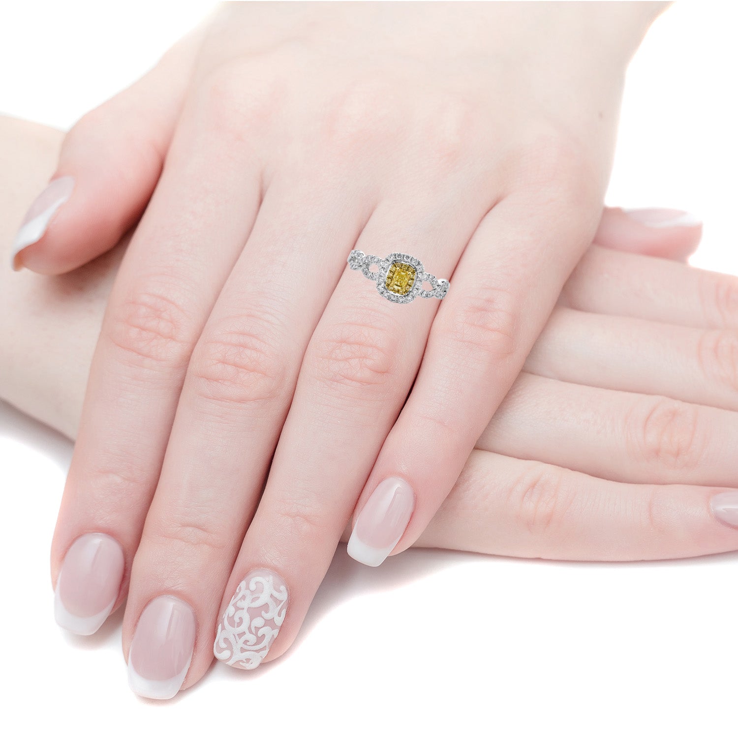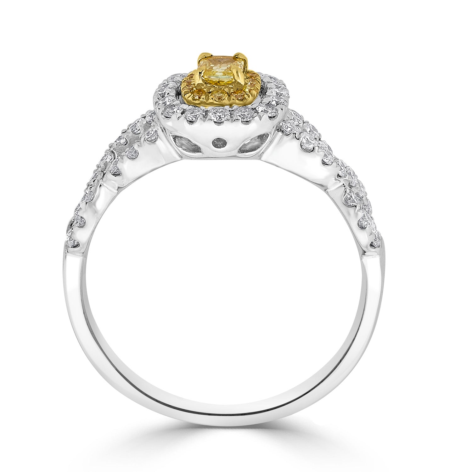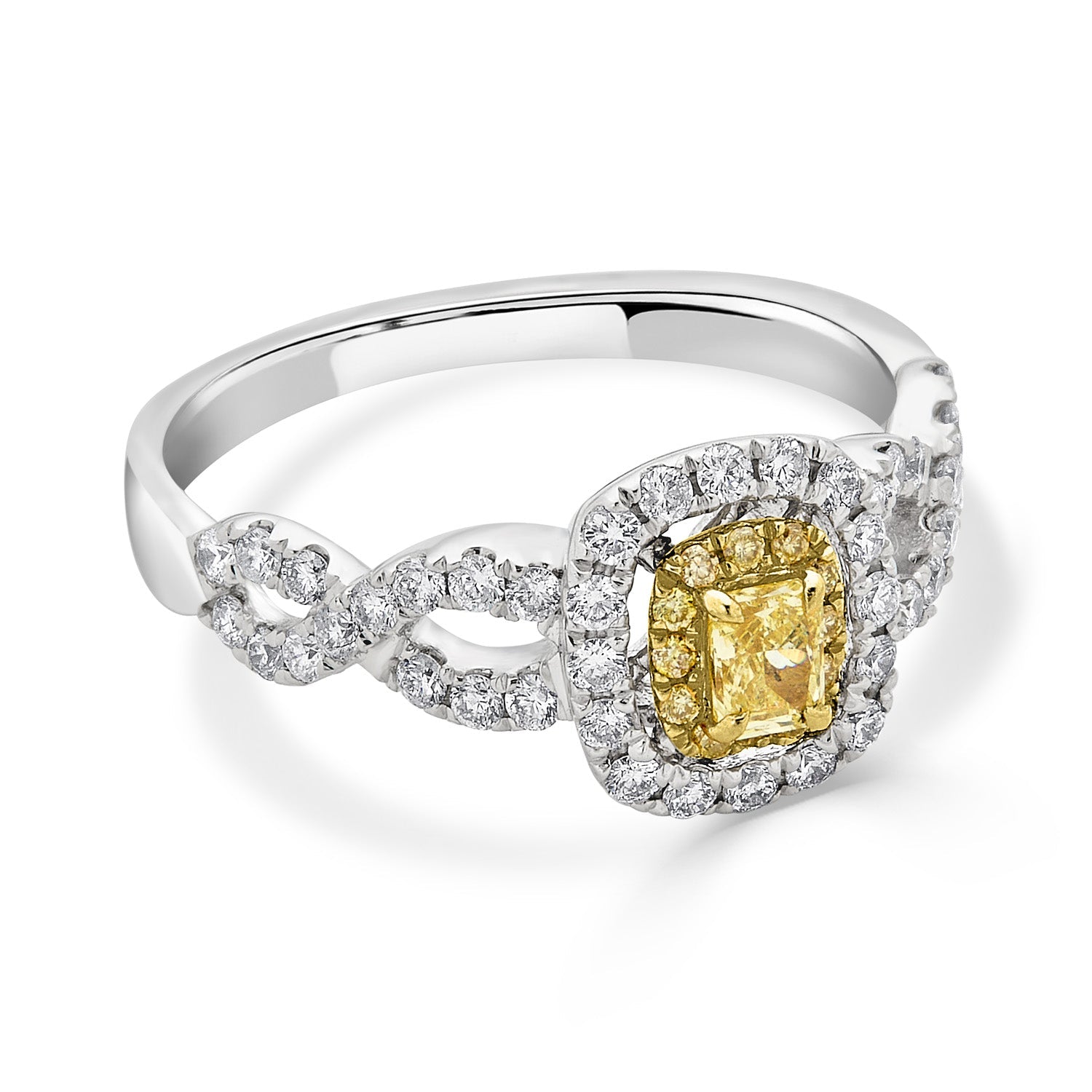 Being designed with an specialty design, this 18K two-tone ring is extremely elegant for a luxury look. The cushion-cut Diamond that is set amidst round Diamonds shines bright and will brighten your style like magic.