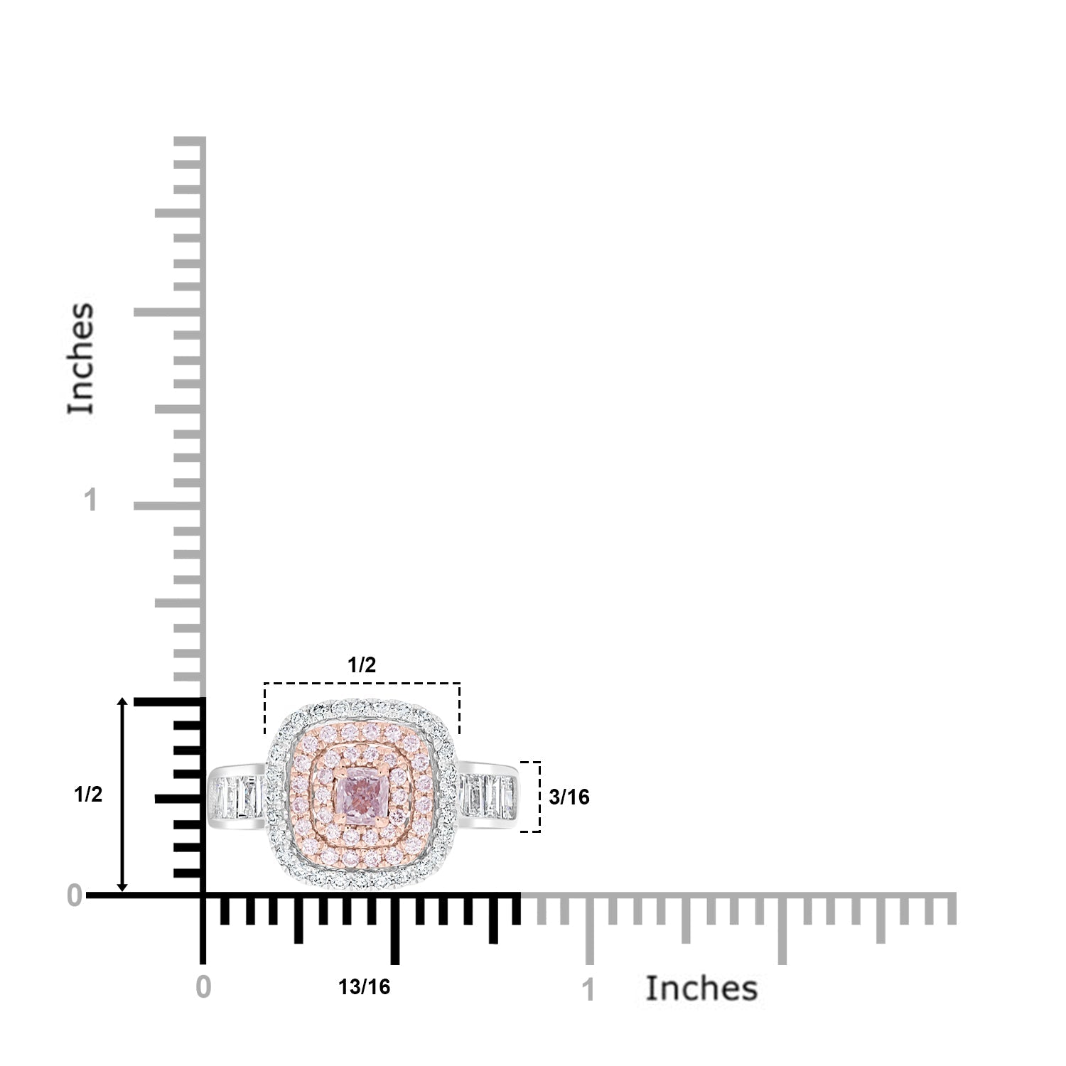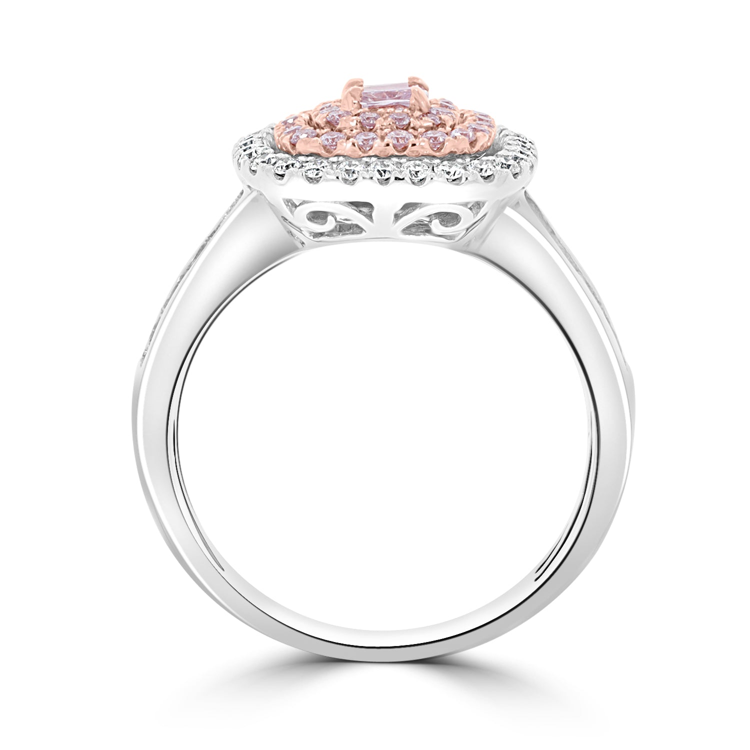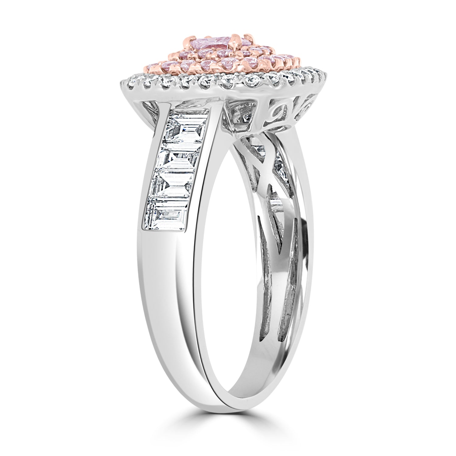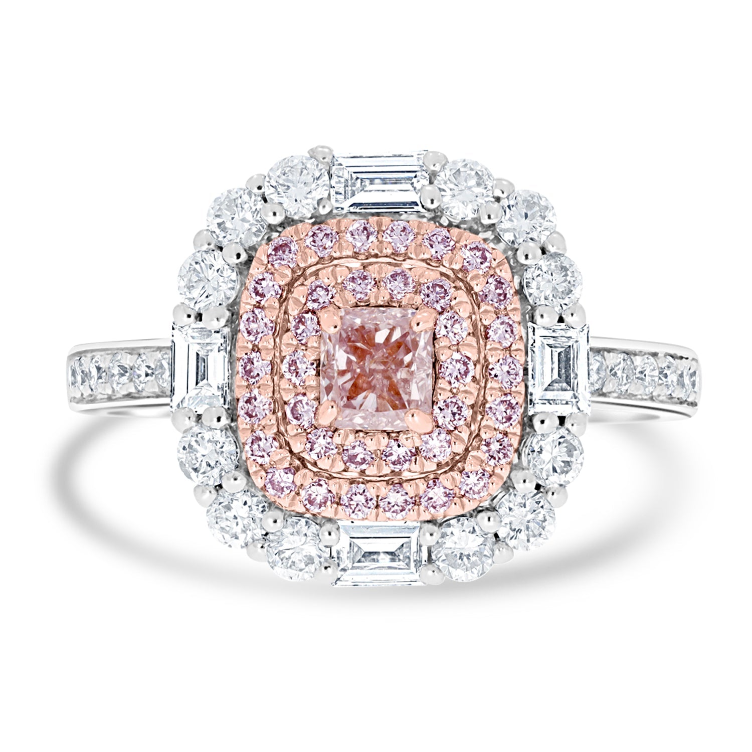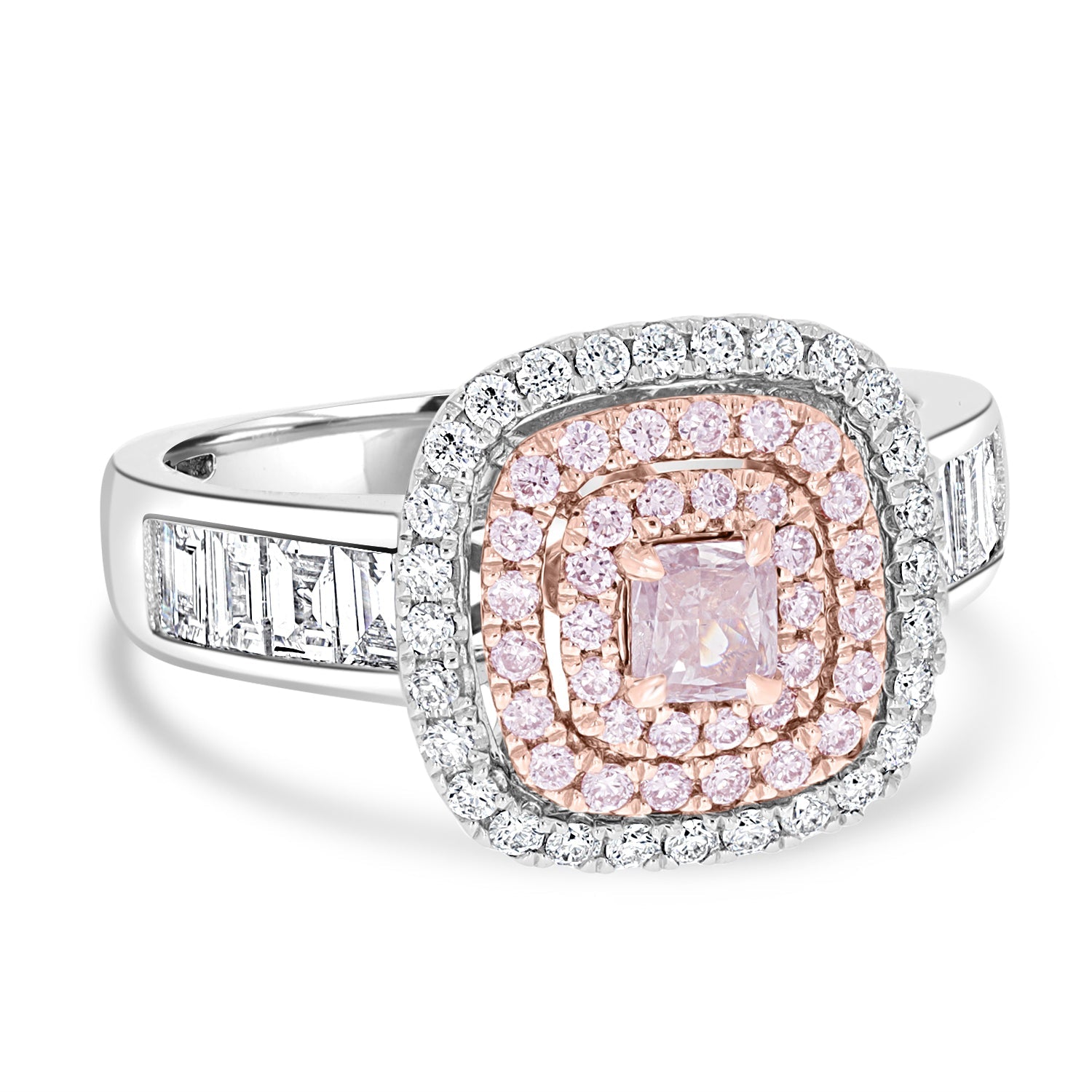 "Set with a stunning cushion cut Pink Diamond at the center, this striking ring is crafted from 14K two tone gold and surrounded by the sparkle of splendid round cut Diamonds."