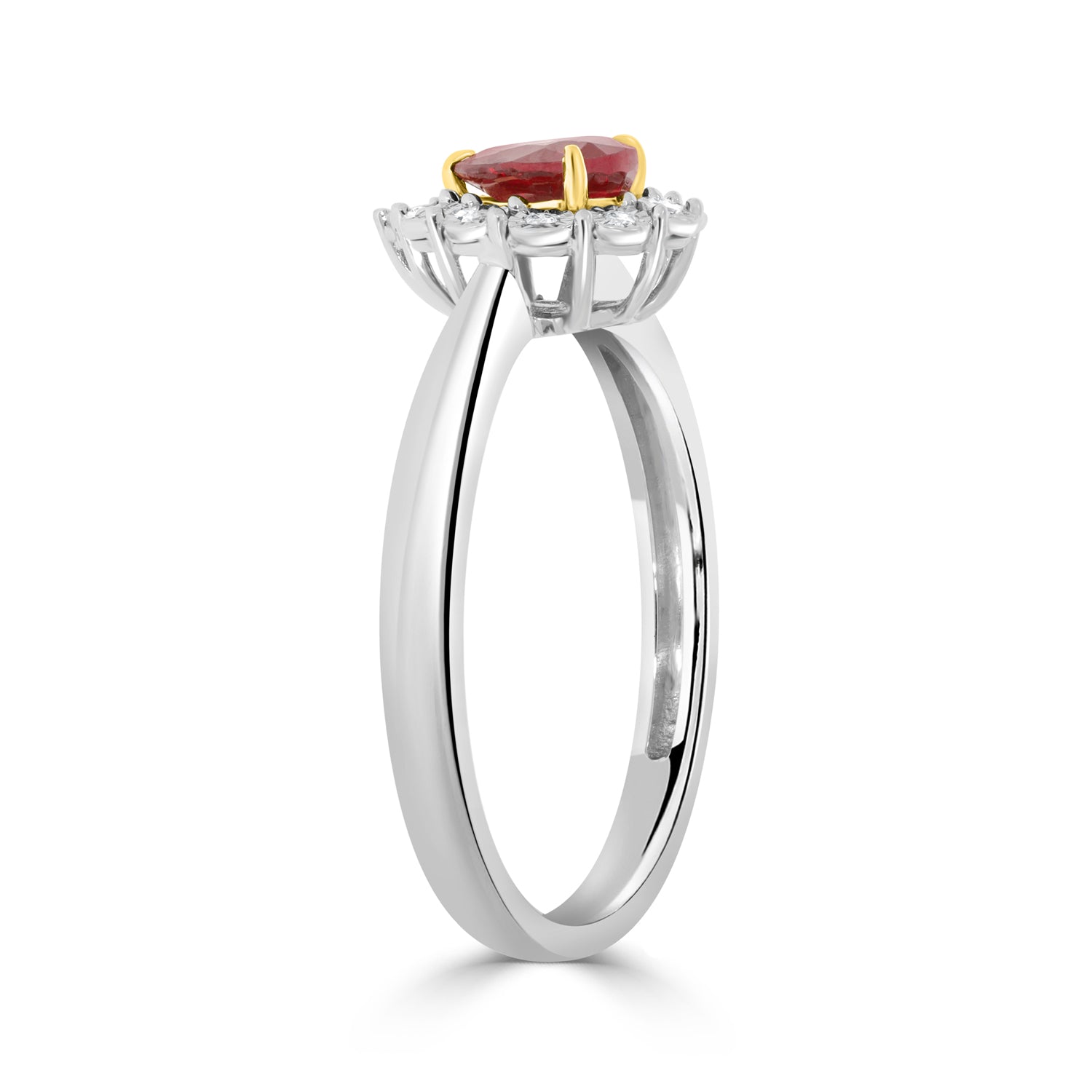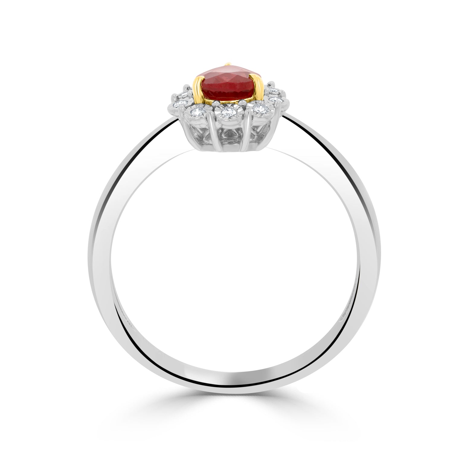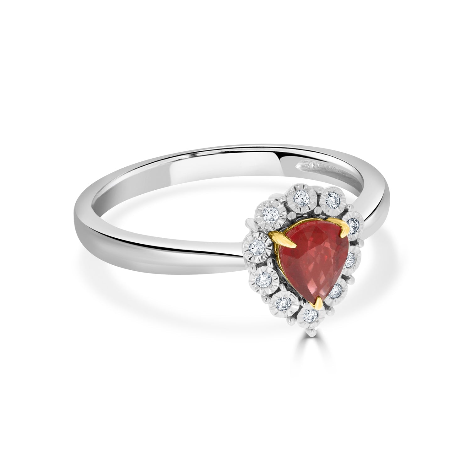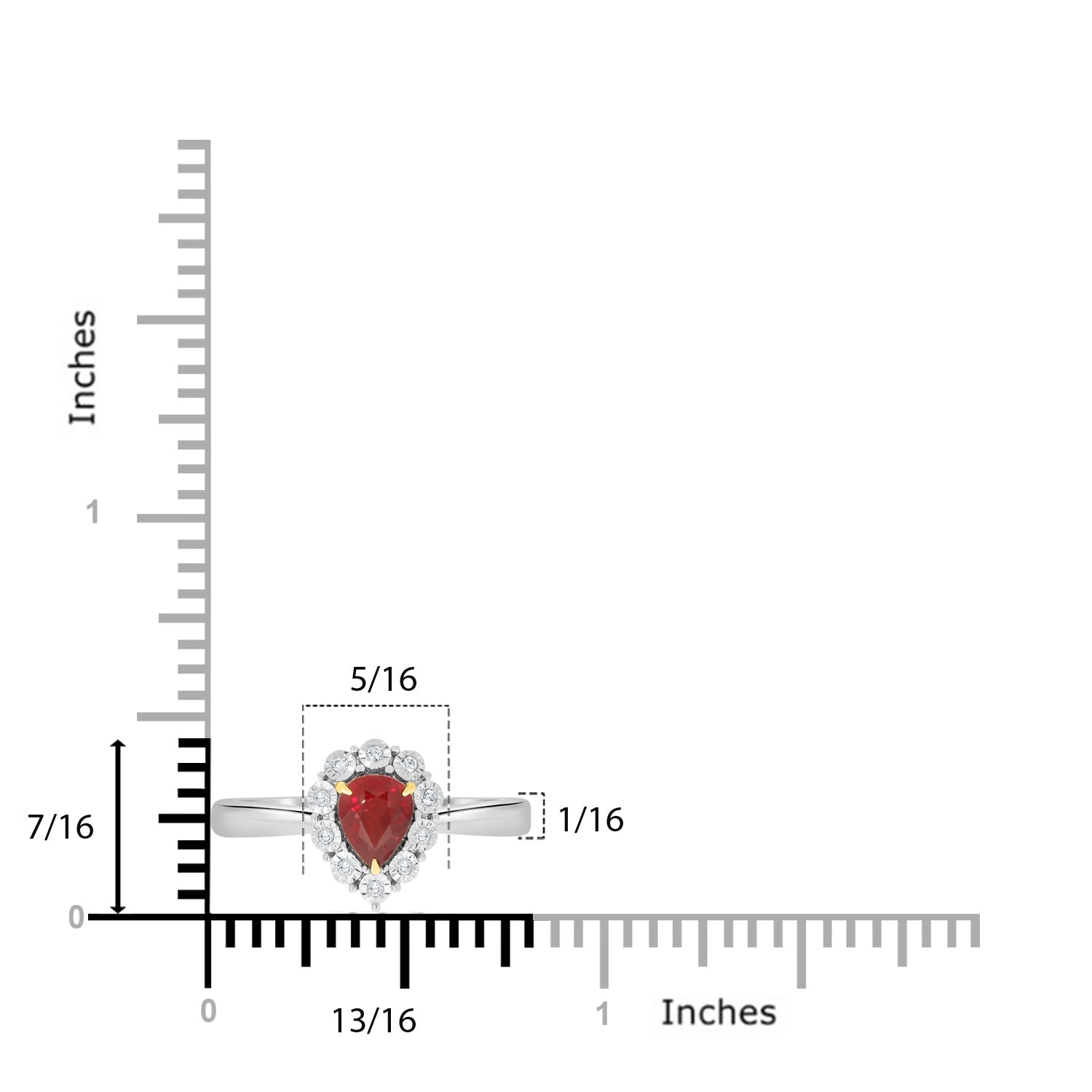 Crafted Of 18K Two Tone Gold, This Captivating Ring Is Designed With A Stunning Pear Cut Ruby At The Center. Adding A Generous Dose Of Sparkle Are The Glittering Round Cut Diamonds That Surround This Spectacular Jewelry.