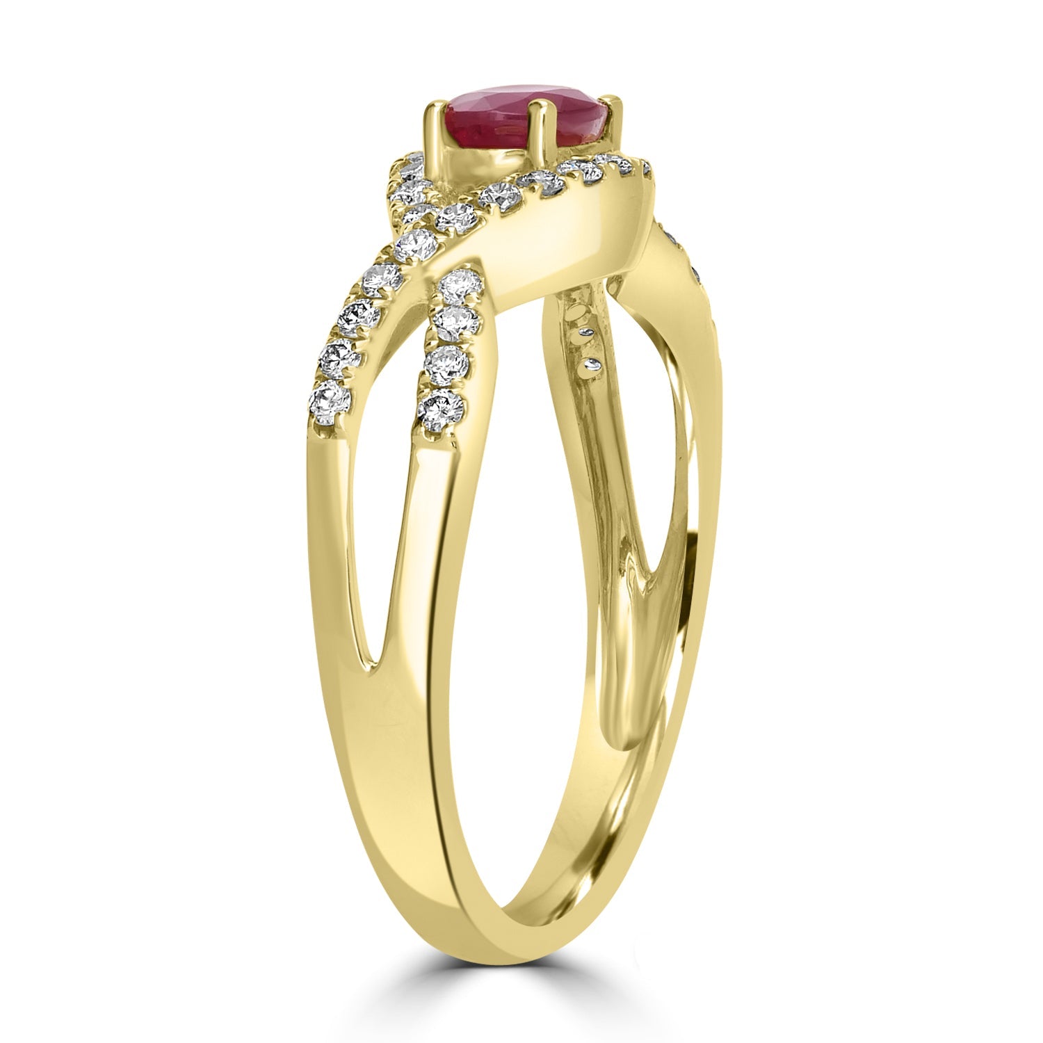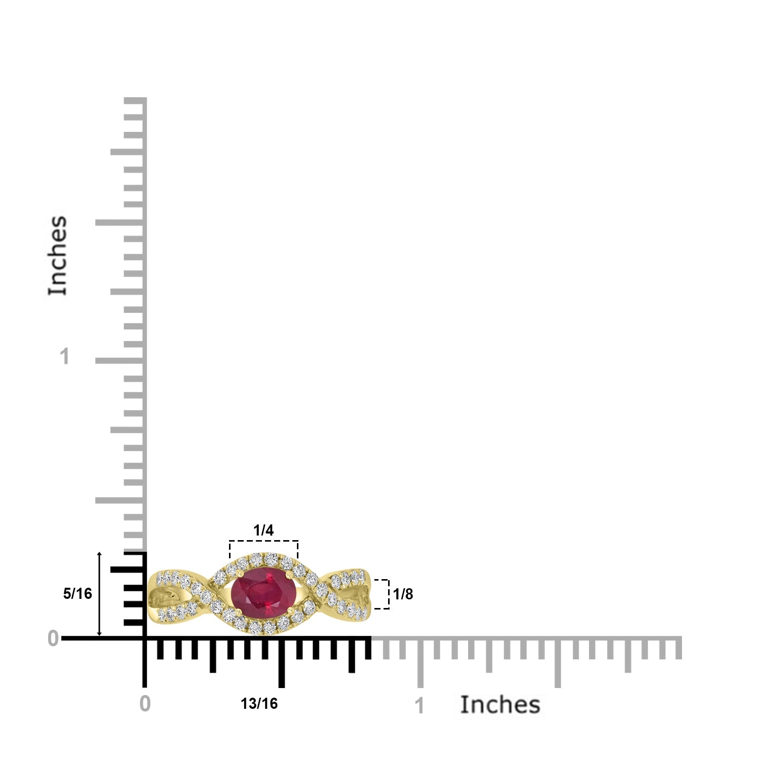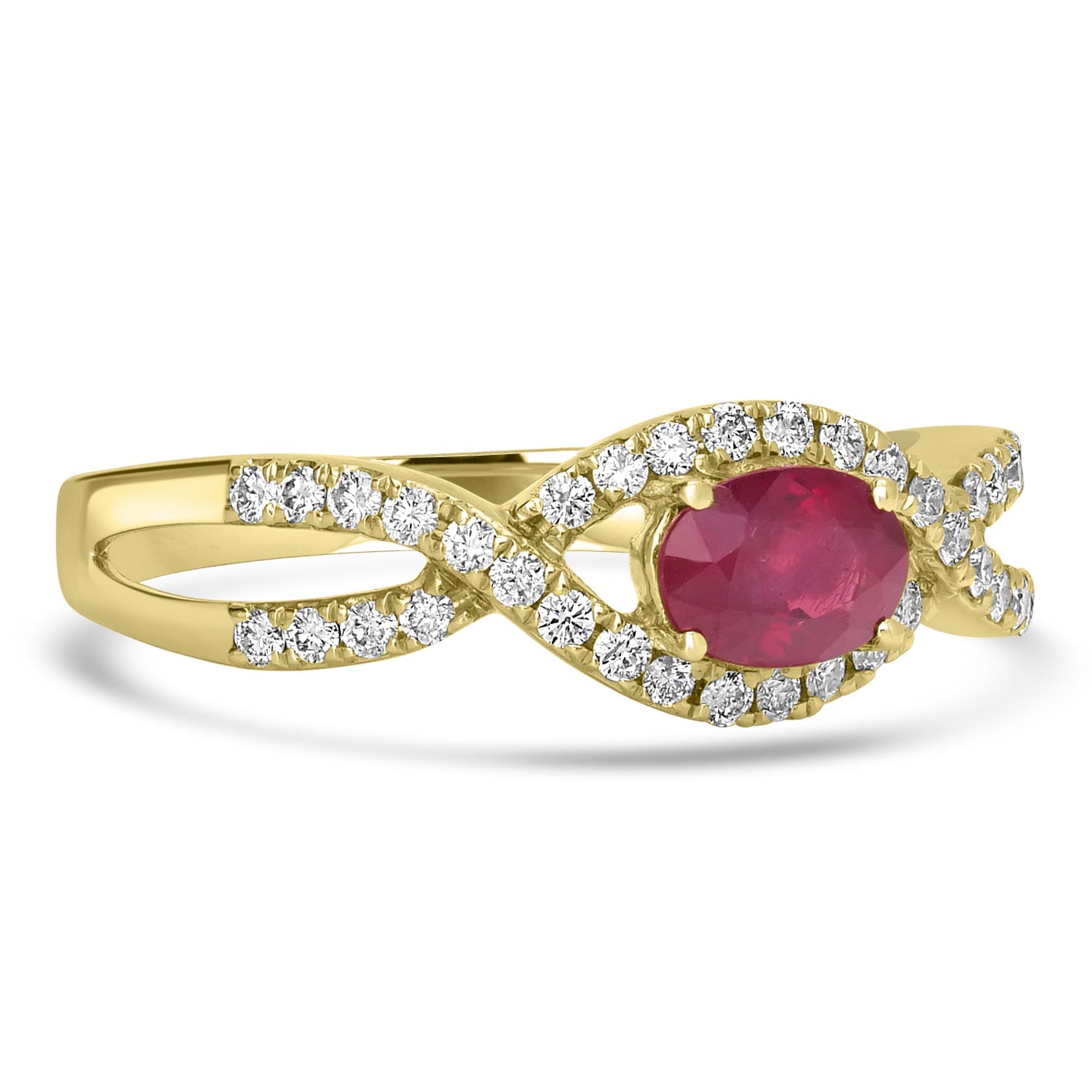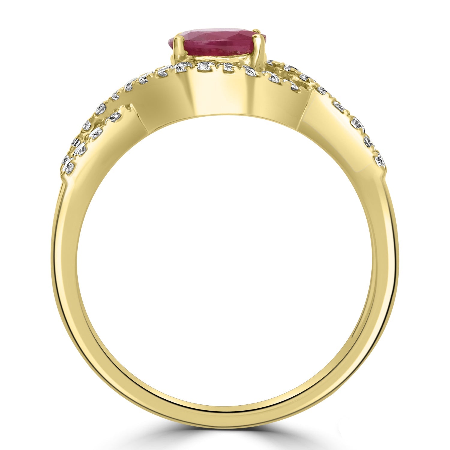 This world-class 14k yellow gold ring is set with an oval-cut Ruby and round Diamonds that strikes the perfect balance between sophistication and luxury.