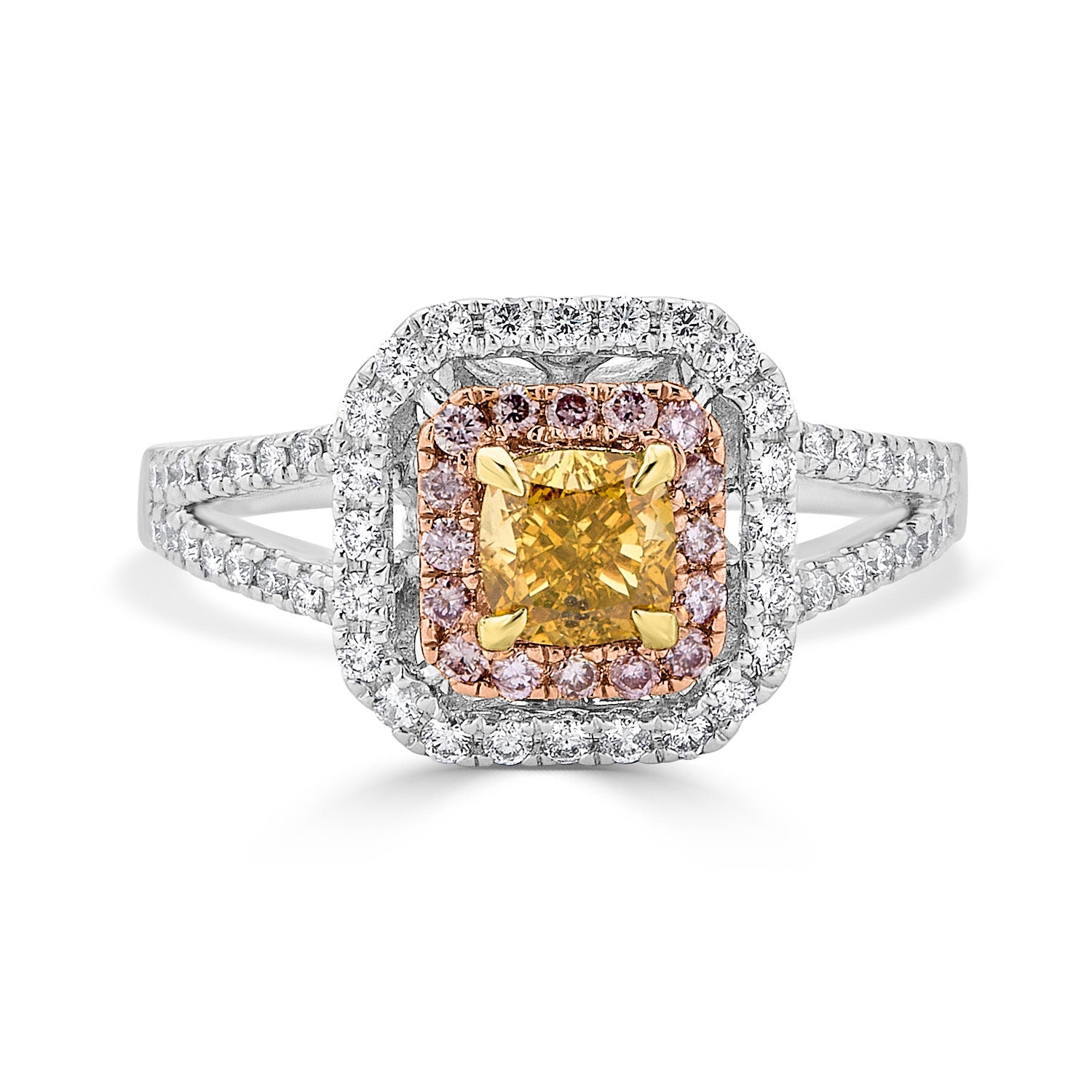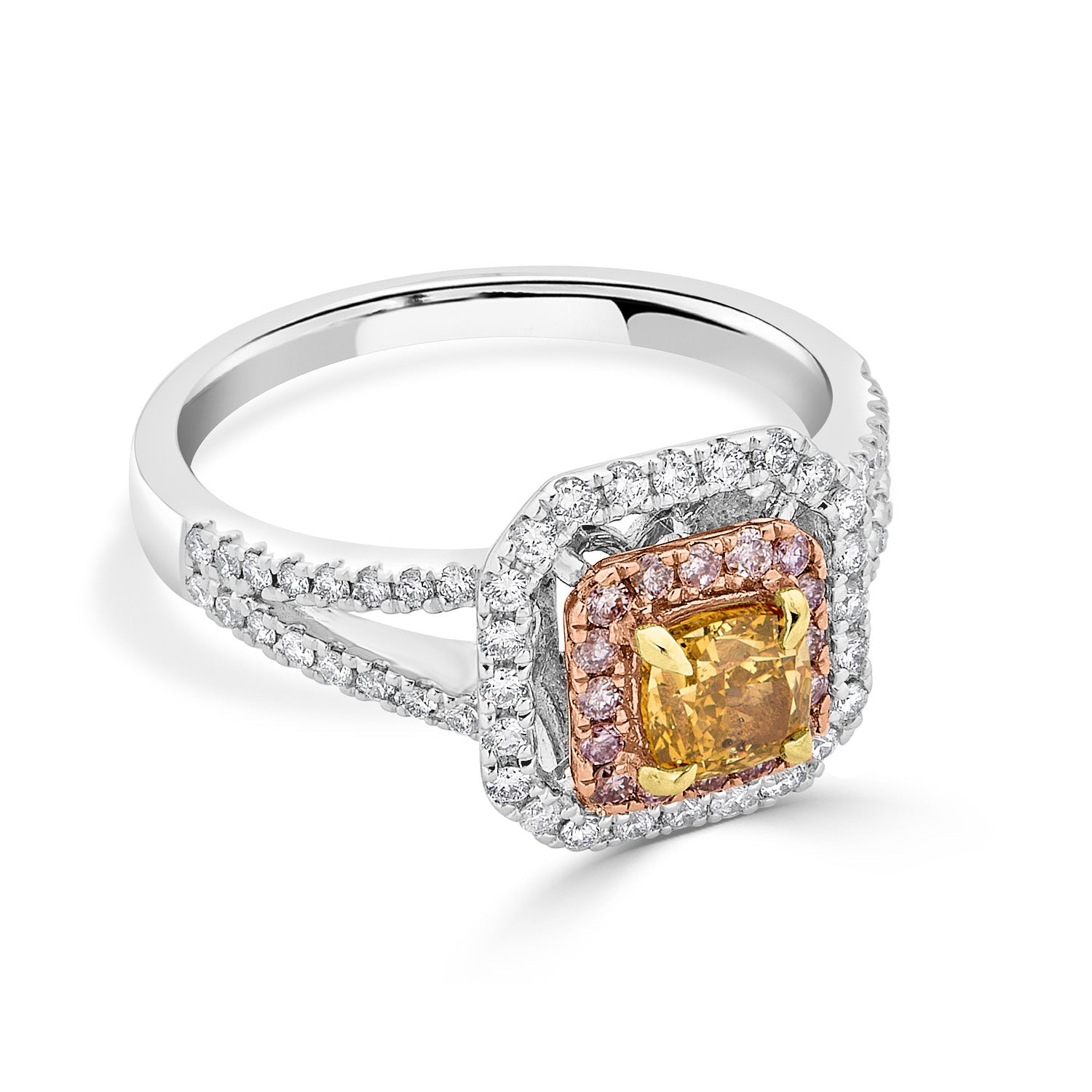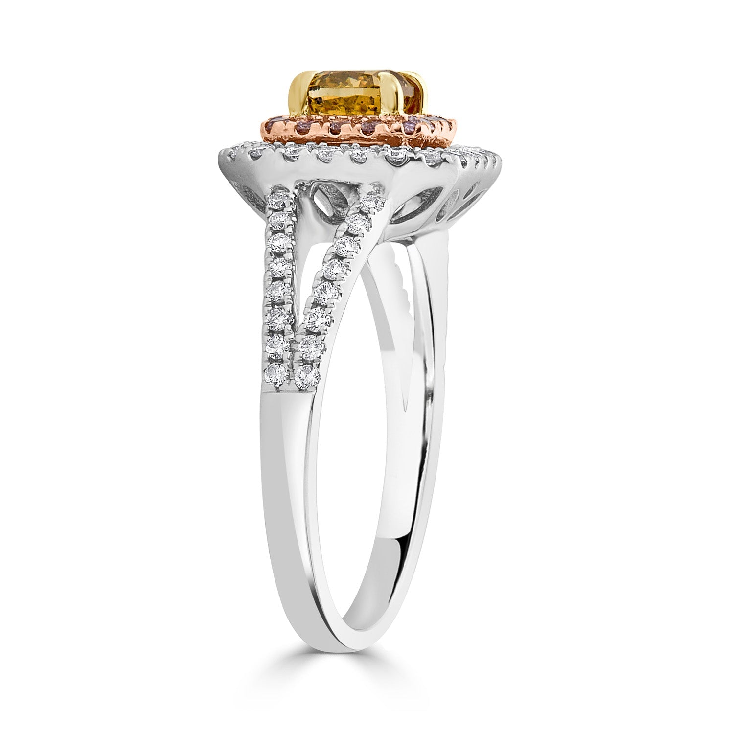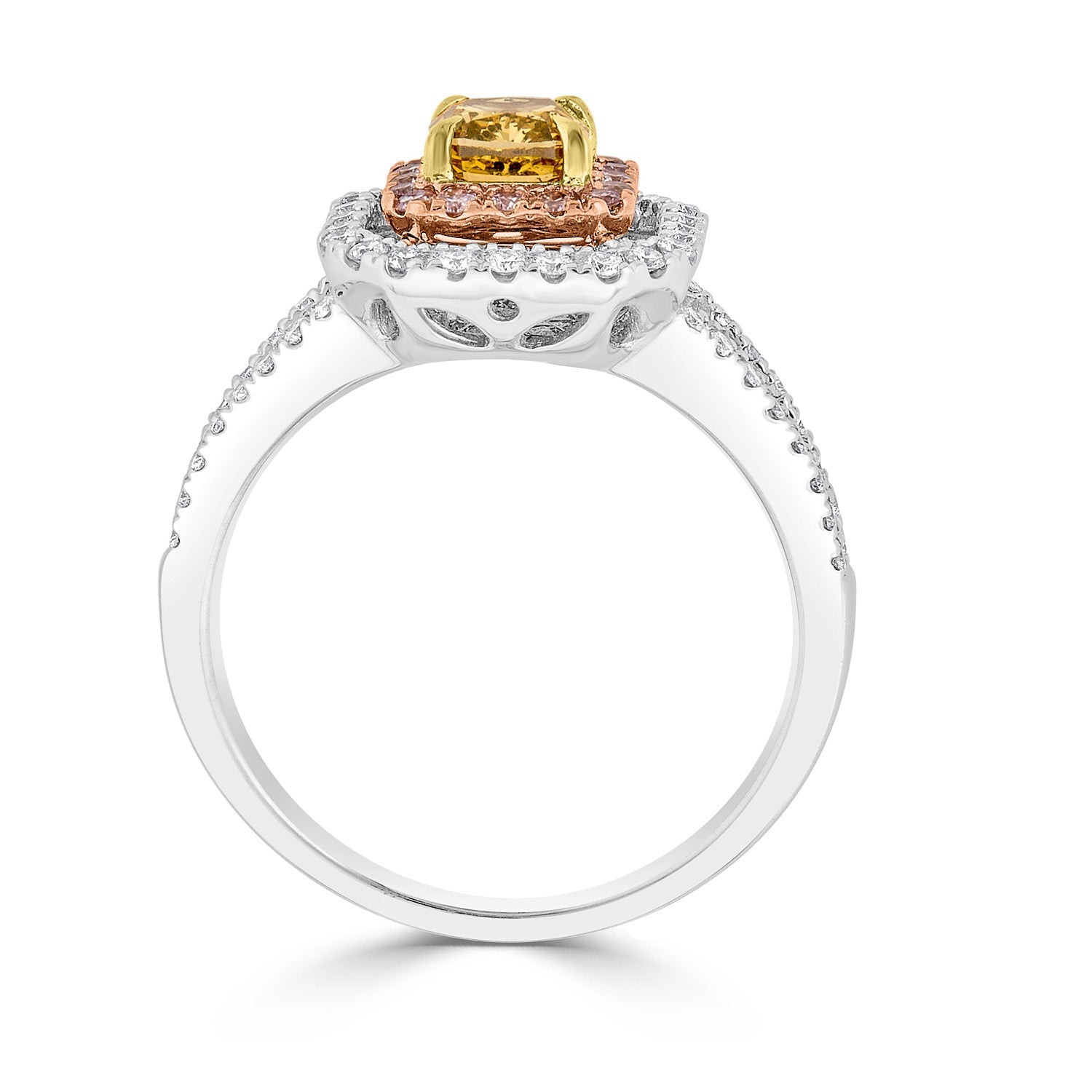Crafted 18k Two-tone Gold, The Richness Of This Ring Is Enhanced By The Enchanting Cushion Cut Diamond And The Splendid Round Cut Diamonds Around It That Proffer A Dazzling Effect.
