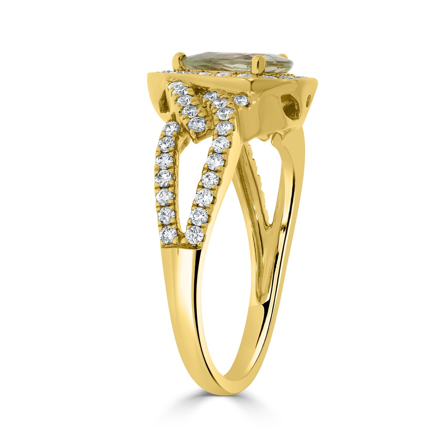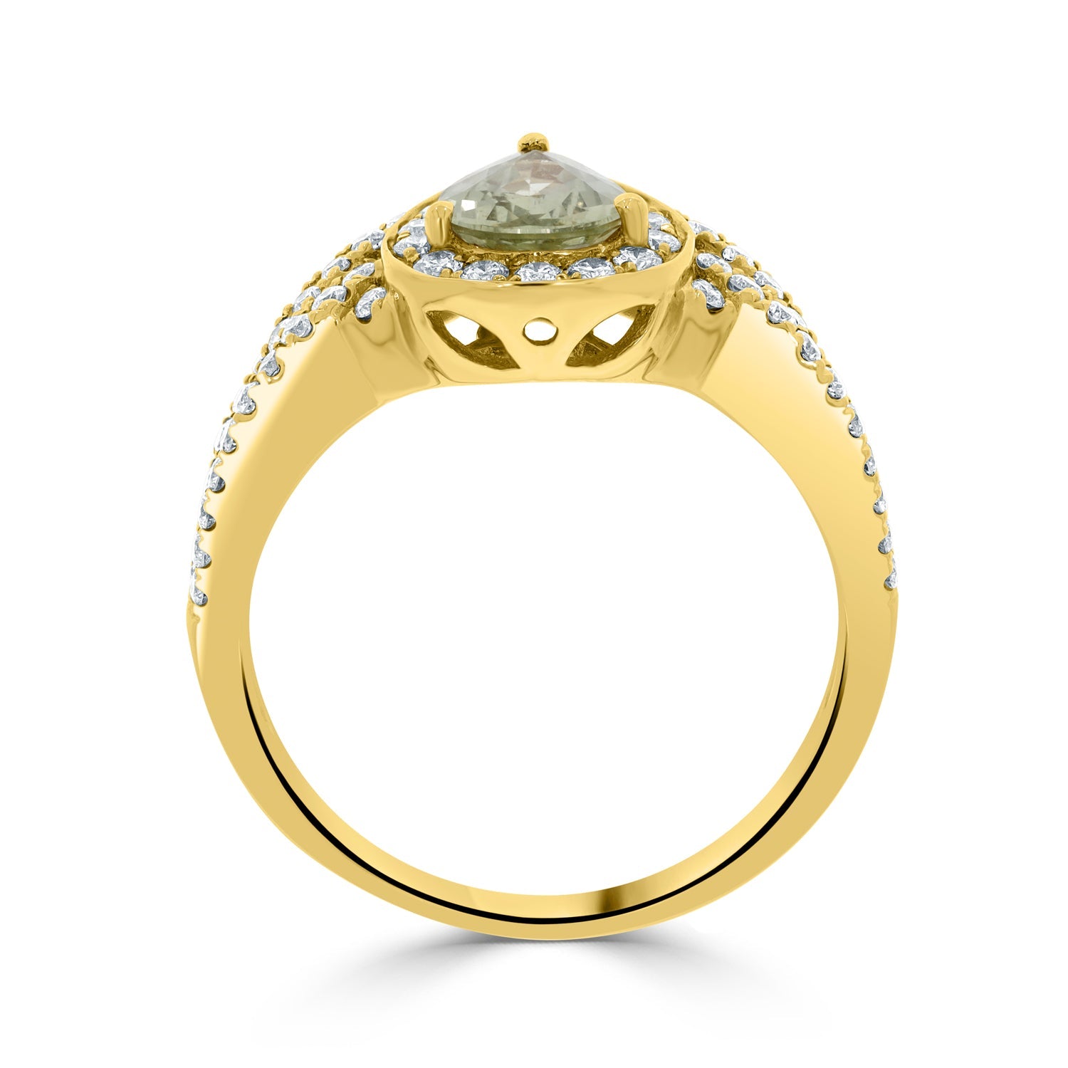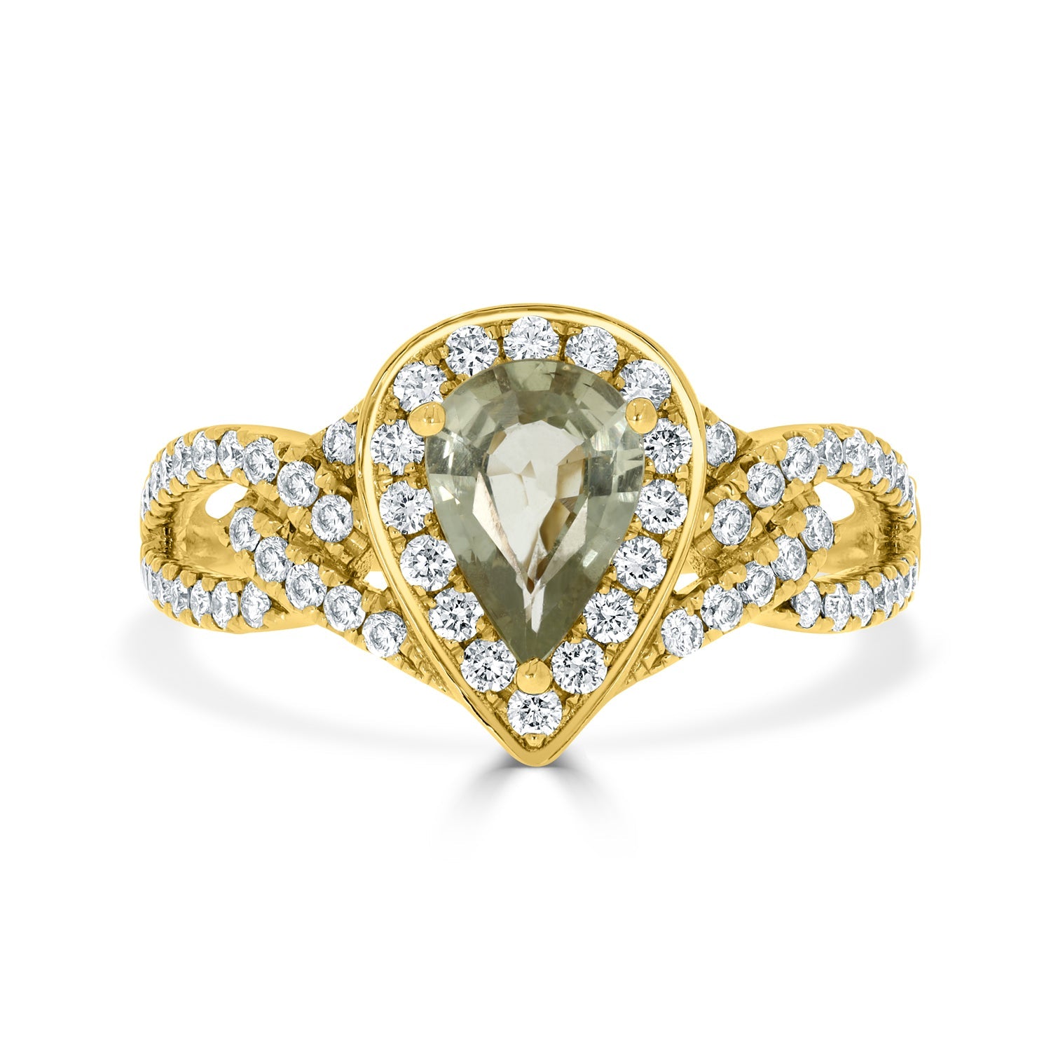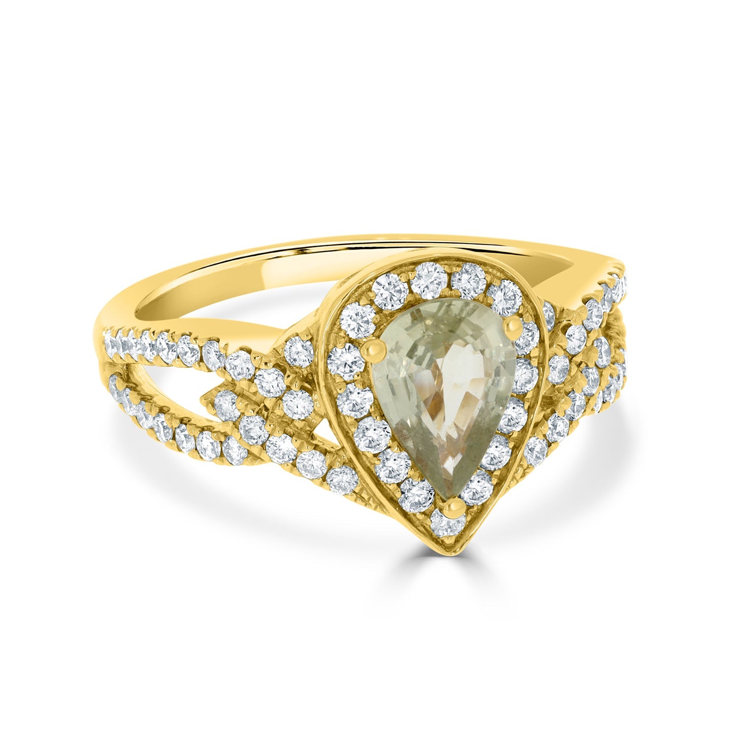 Ideal For Special Occasions, This Ring That Is Crafted In 14k Yellow Gold Is The Perfect Combo Of Classic And Modern Looks. With Sparkling Round Diamonds That Surround A Pear Cut No Heat Certified Sapphire, The Design Looks Astounding And Luxurious.