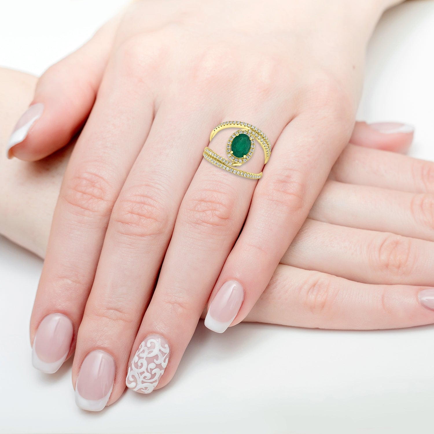 Designed from 14K yellow gold, this ring is set with a beautiful oval-cut Emerald and round Diamonds. This flattering ring is sure get compliments.