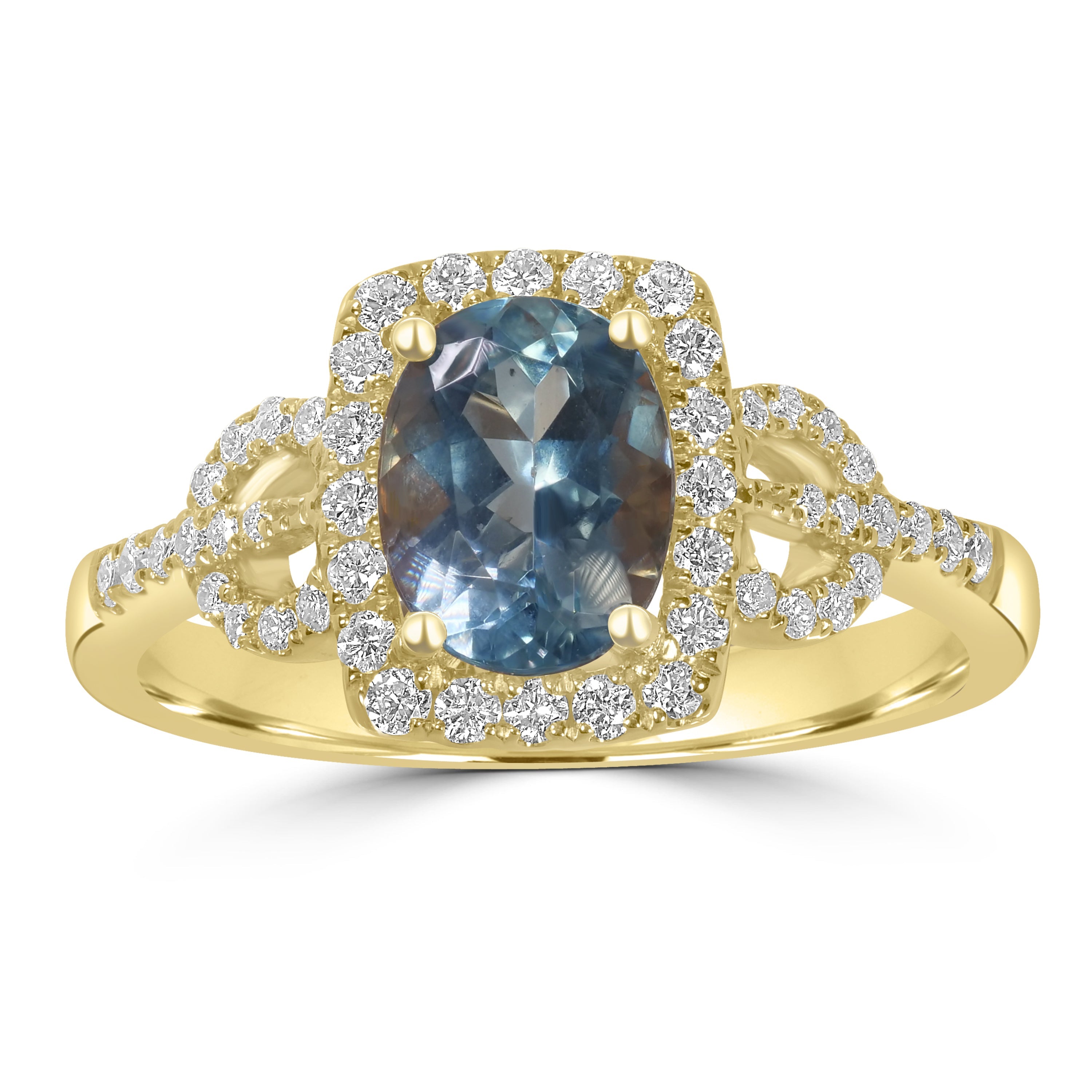With statement-making elegance and artfulness, this 18K Yellow Gold timeless ring is an art that you would cherish. Featuring oval-cut Aquamarine and round Diamonds all set in a creative style, this trendy ring exudes luxury and world-class artistry.