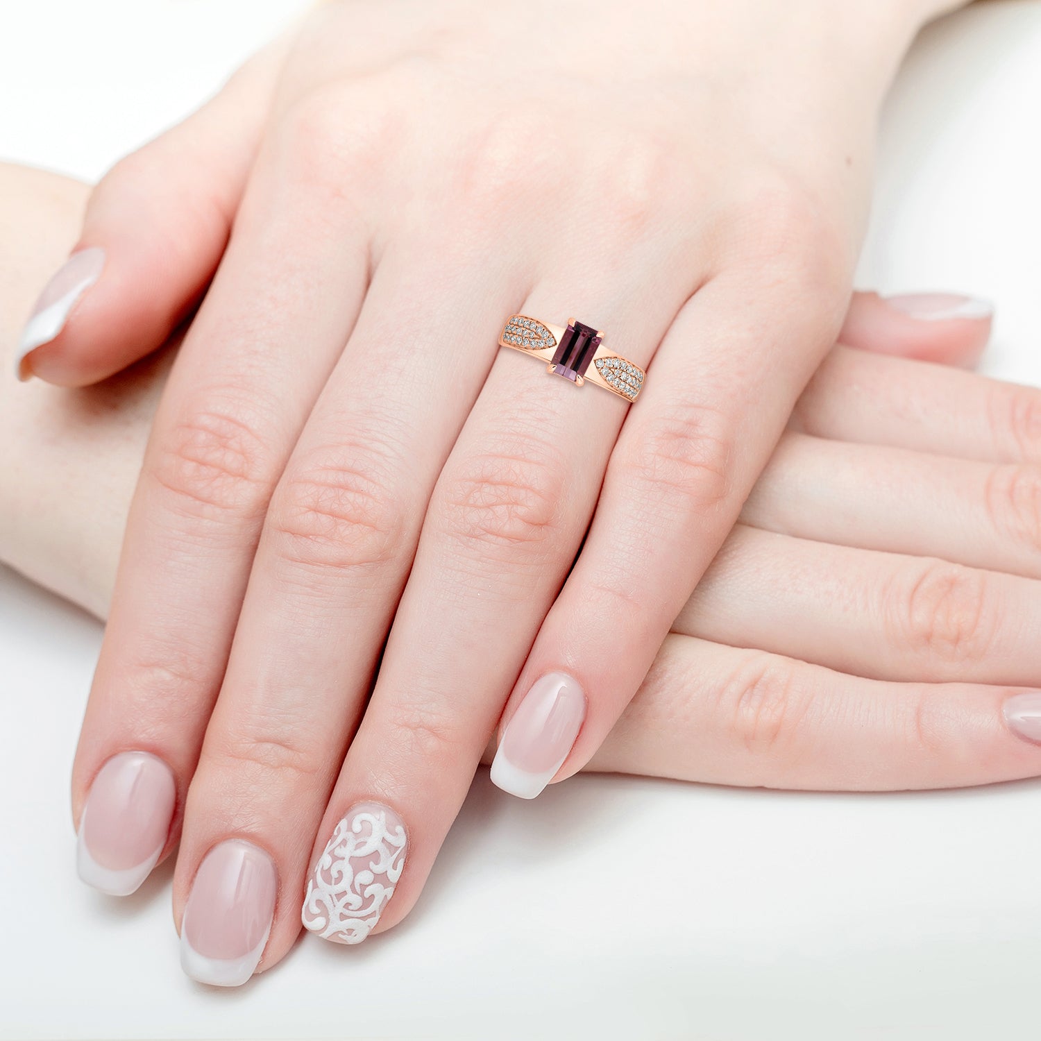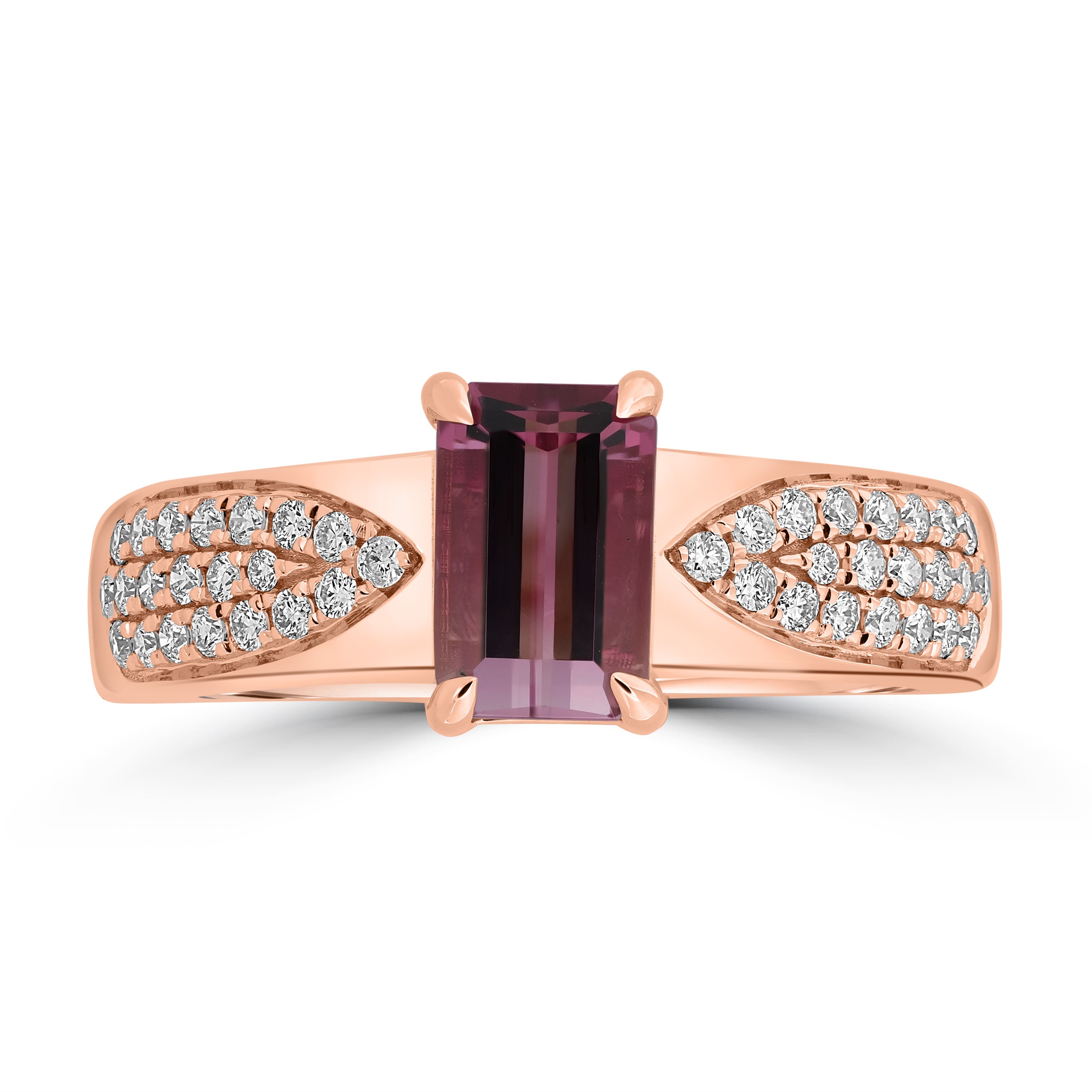 Exuding refined glamour, this exceptional 18K rose gold ring adds a touch of allure to your ensembles. Meticulously crafted, its captivating design showcases an alluring emerald-cut Tourmaline and sparkling round Diamonds. Experience extraordinary elegance with this shimmering masterpiece.
