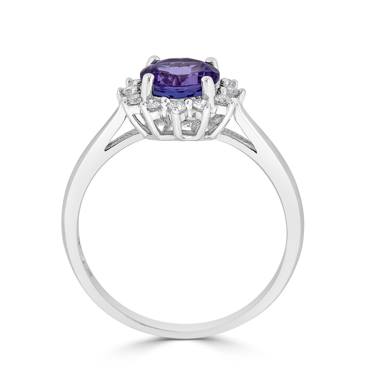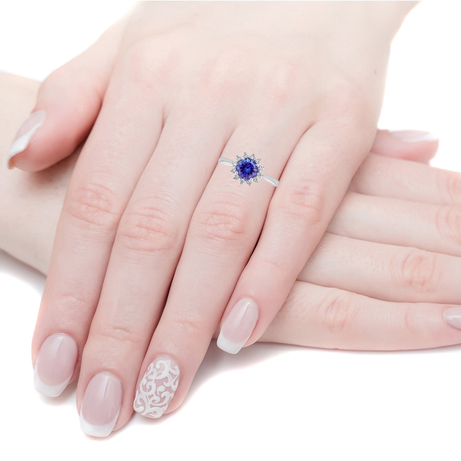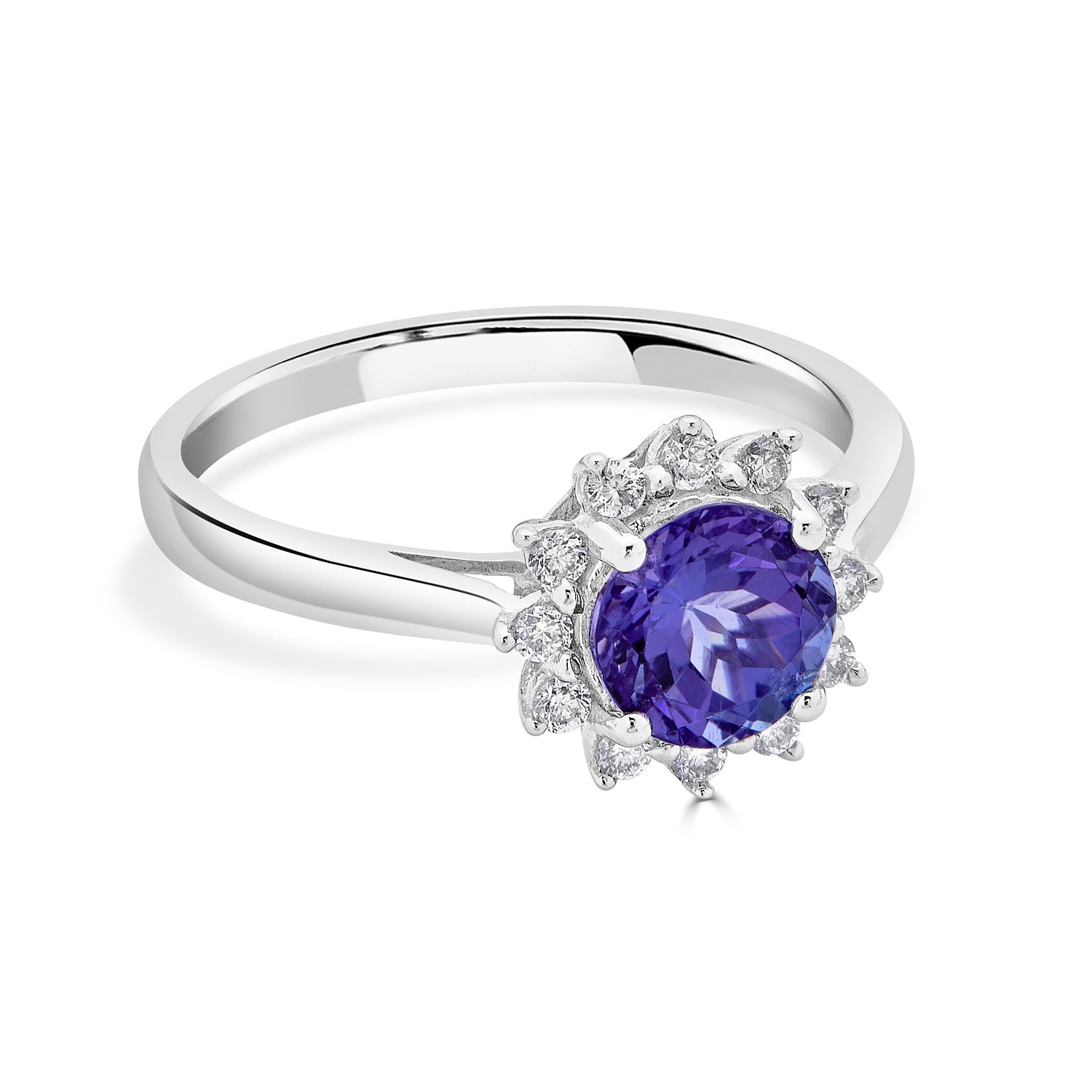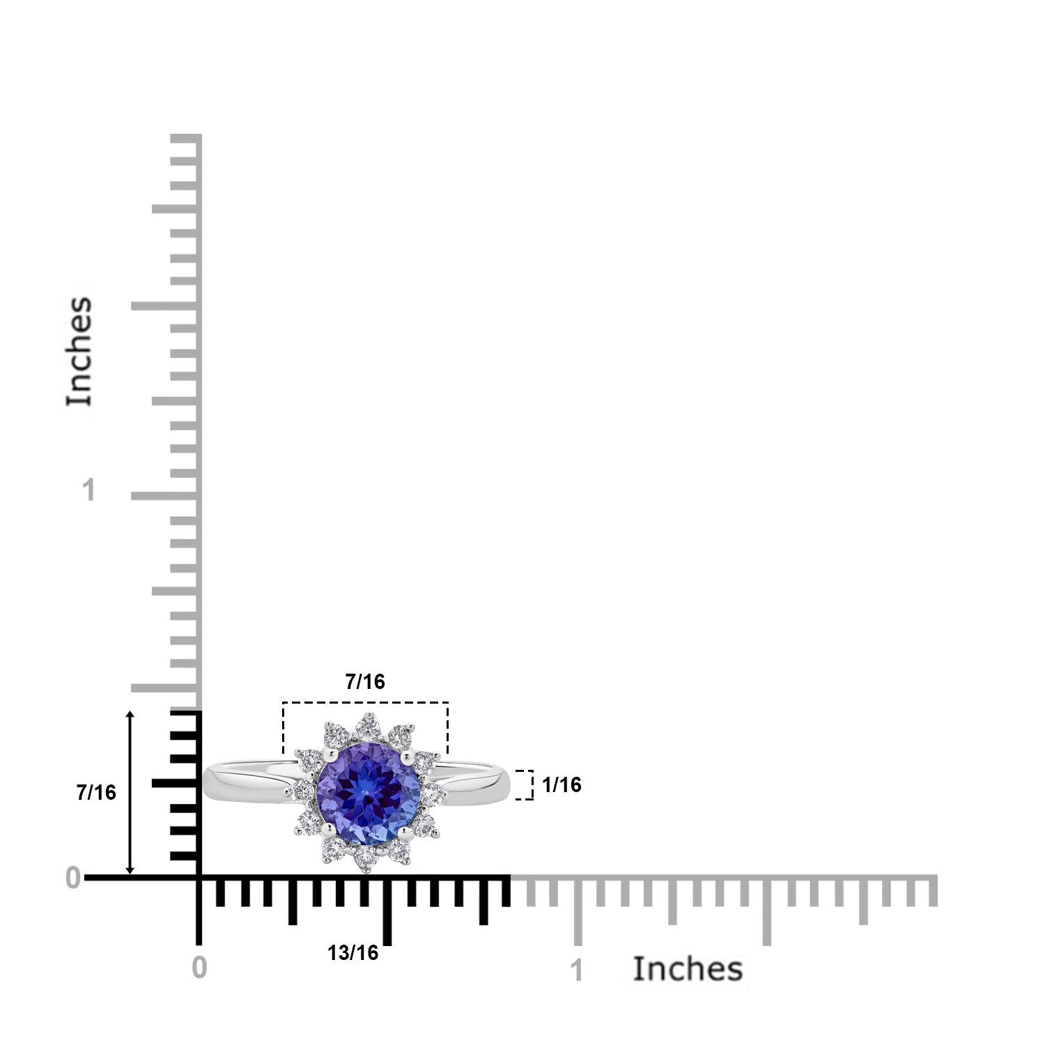 Designed with 14K white gold, this striking ring is set with a marvelous round cut Tanzanite at the center. Encircled by shimmering round cut Diamonds, this dazzling jewelry bespeaks your elegance, keeping you in the spotlight wherever you go.
