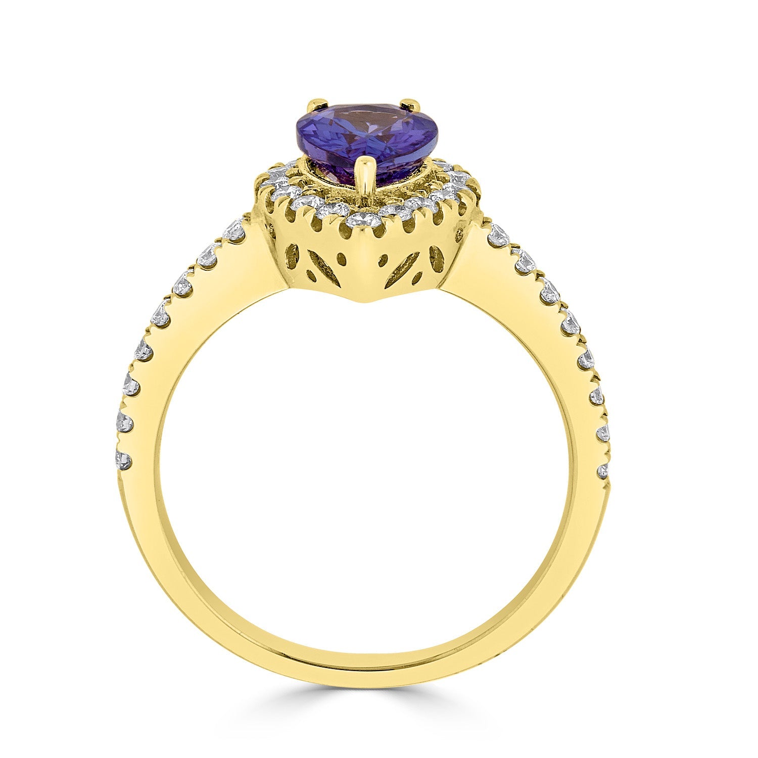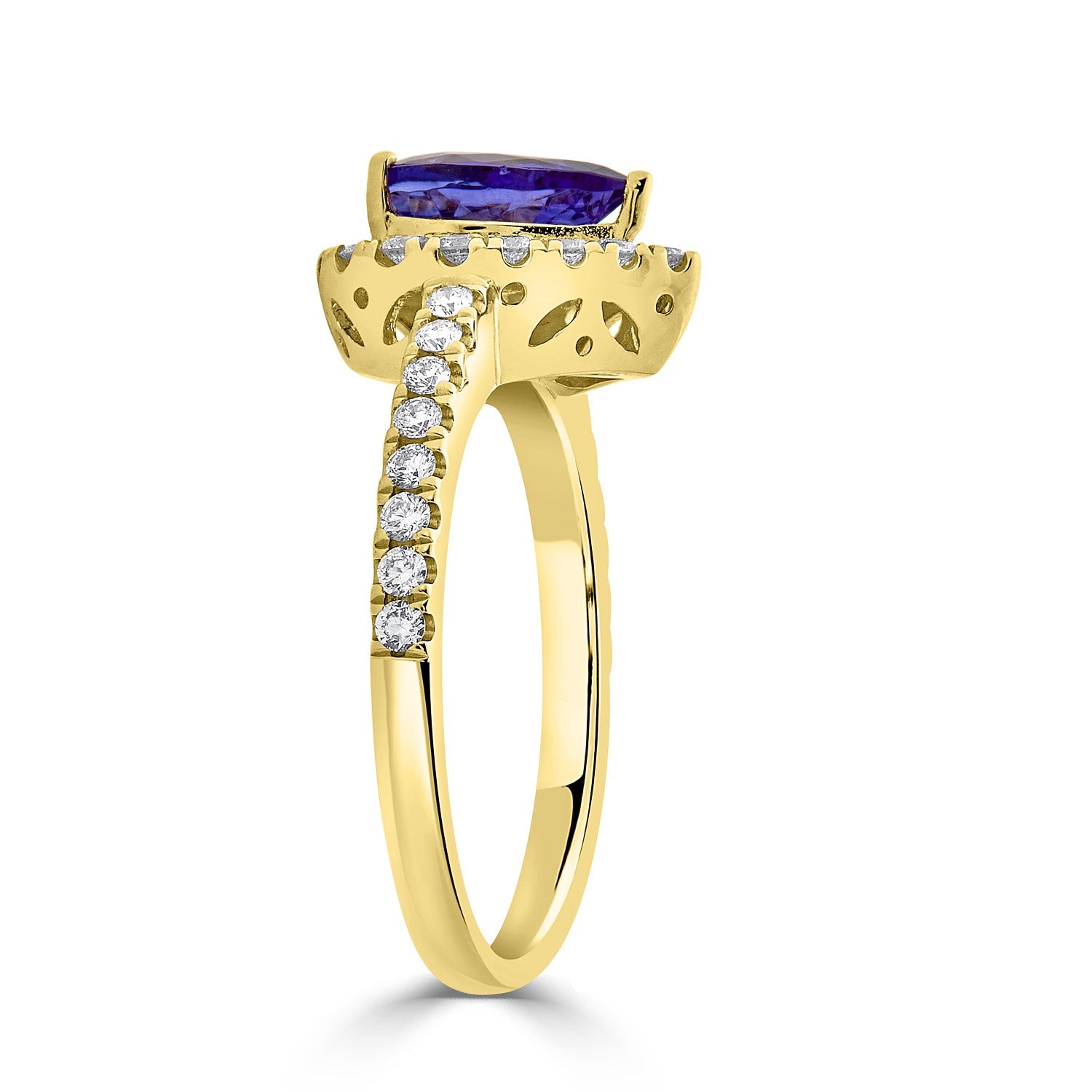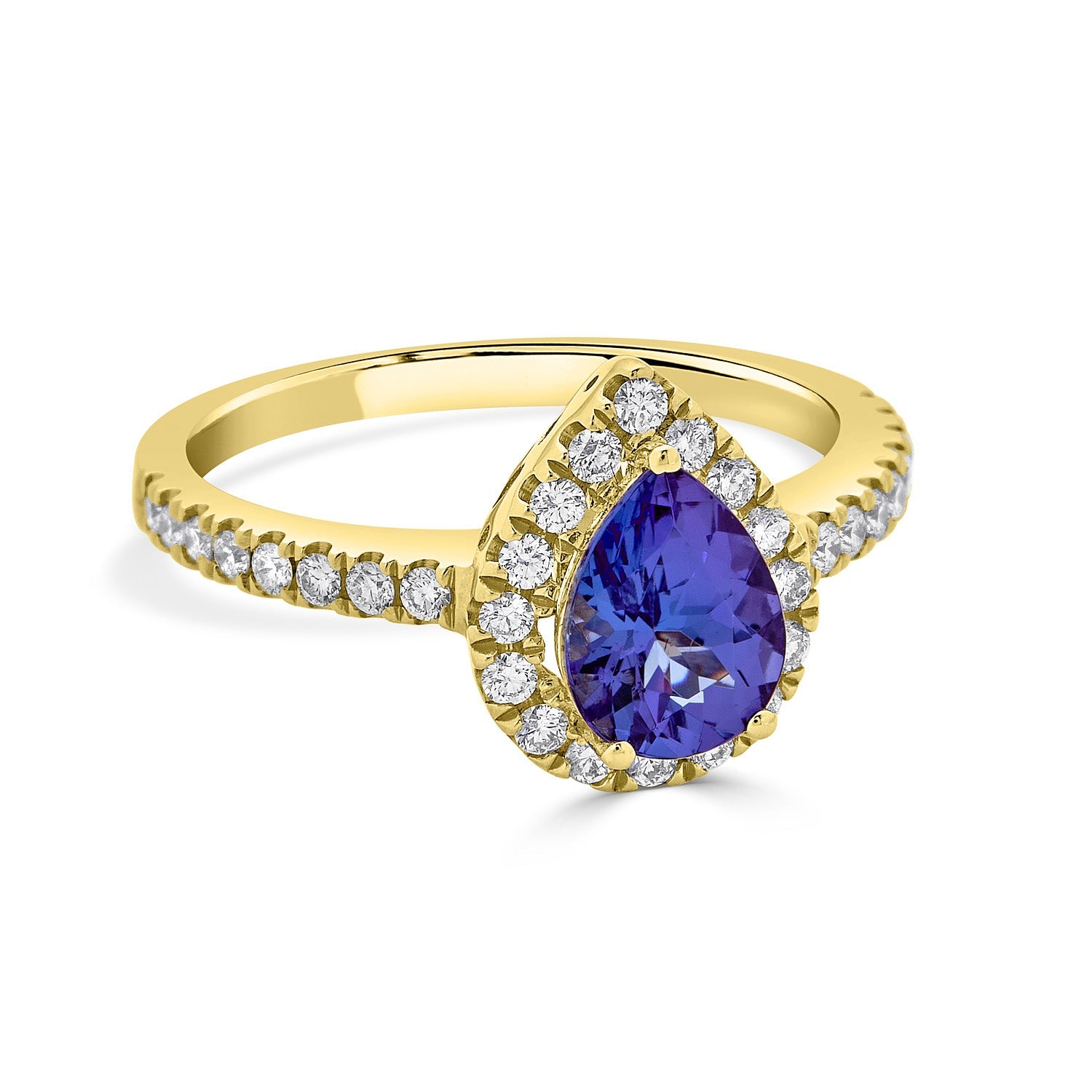 Displaying exceptional craftsmanship, this enchanting ring is set with a stunning pear cut Tanzanite at the center. Designed with 14K yellow gold, the radiance of this gorgeous ring comes from the sparkle of the round cut Diamonds around it.