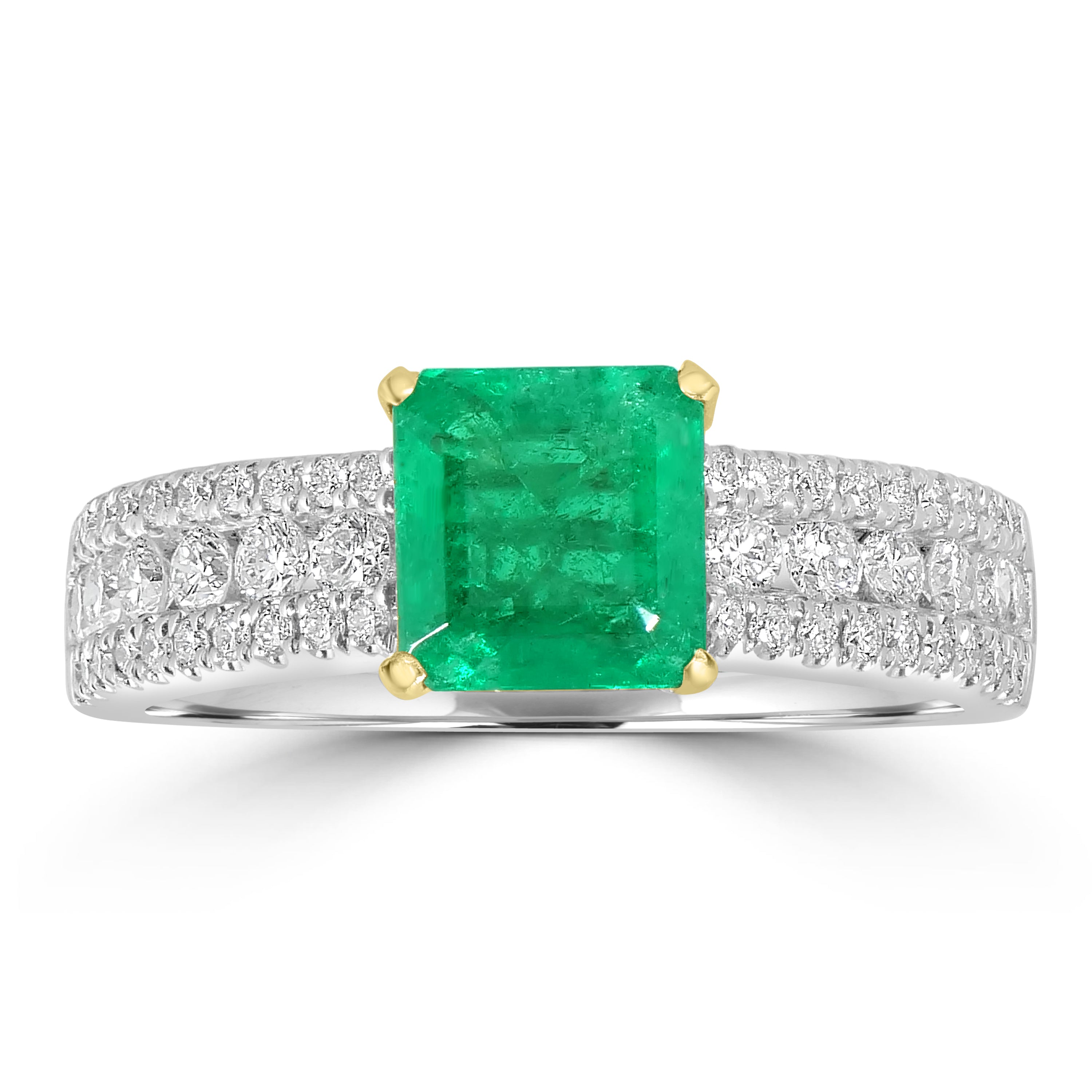 Creatively fashioned and impressive, this 14k two-tone gold ring is a luxurious piece to cherish. The square-cut Emerald and Diamonds bring out its unmatched beauty. Wear it to brighten up your look!