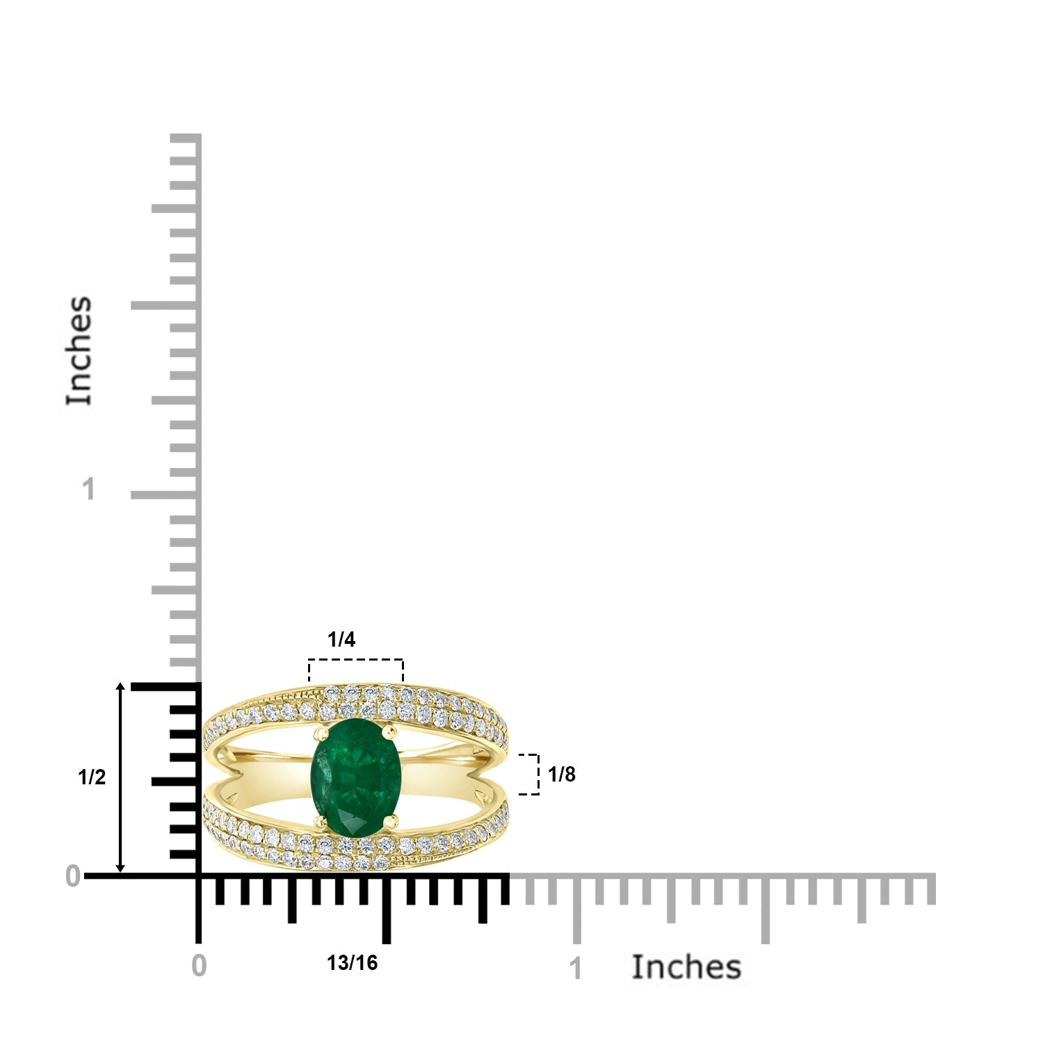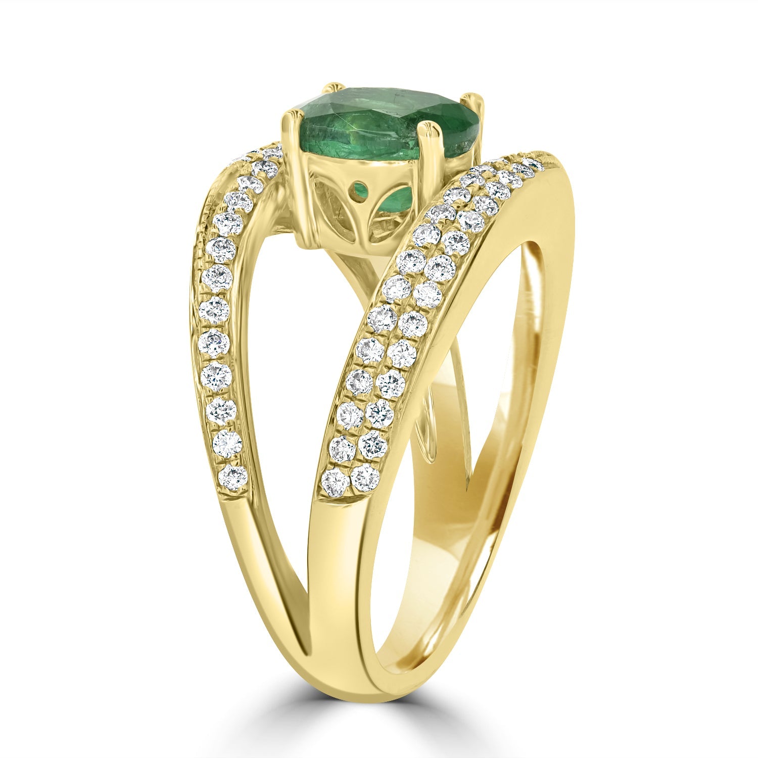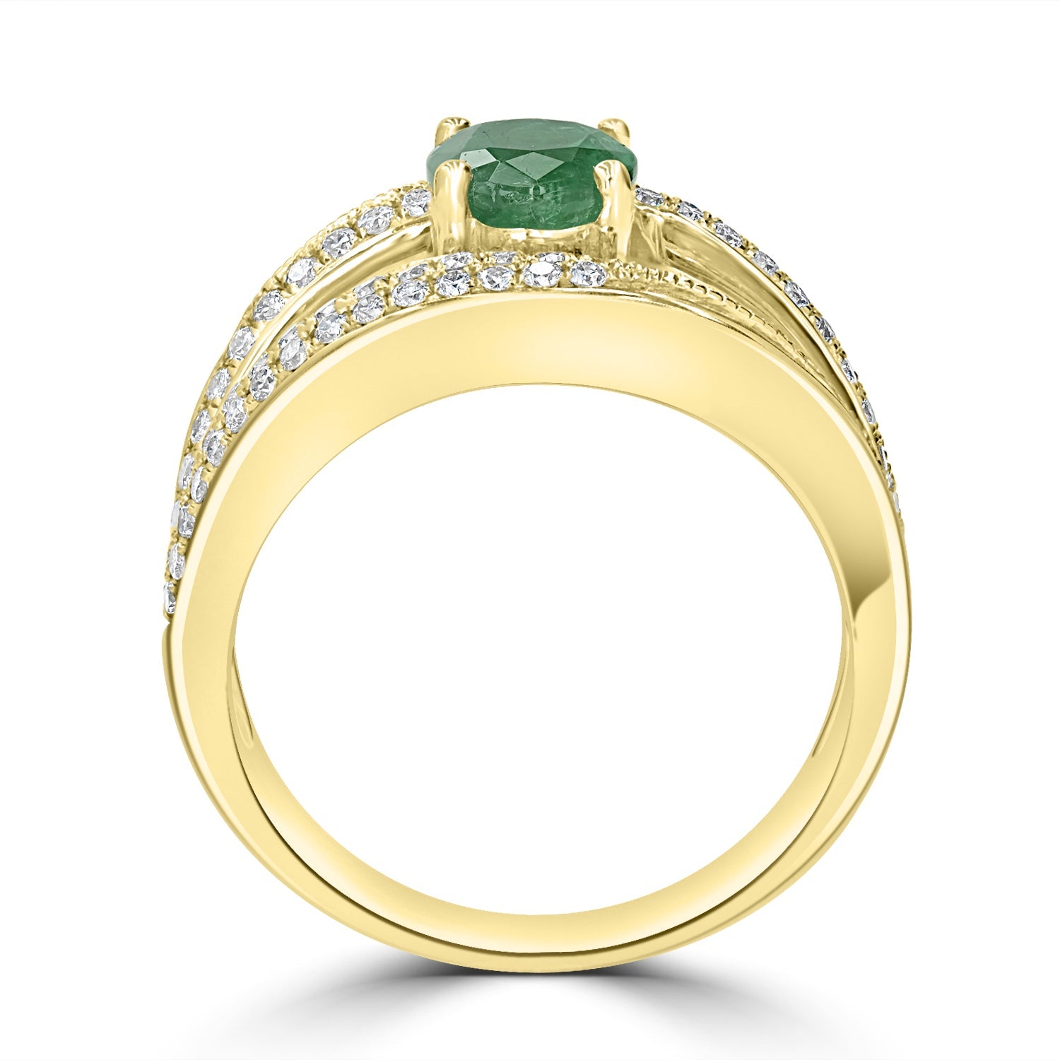 Crafted from 14k yellow gold, this ring is perfect for parties and special events. Creatively set with oval-cut Emerald and round Diamonds.